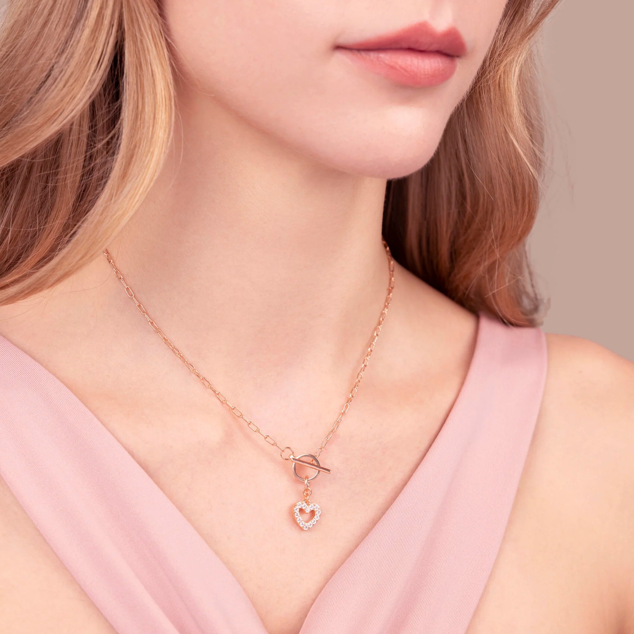 Collana Bronzallure realizzata in lega Golden Rosé, placcata Oro 18kt, con ciondolo a forma di cuore impreziosito da cubic zirconia, qualità luminosa. Chiusura a T-Bar.