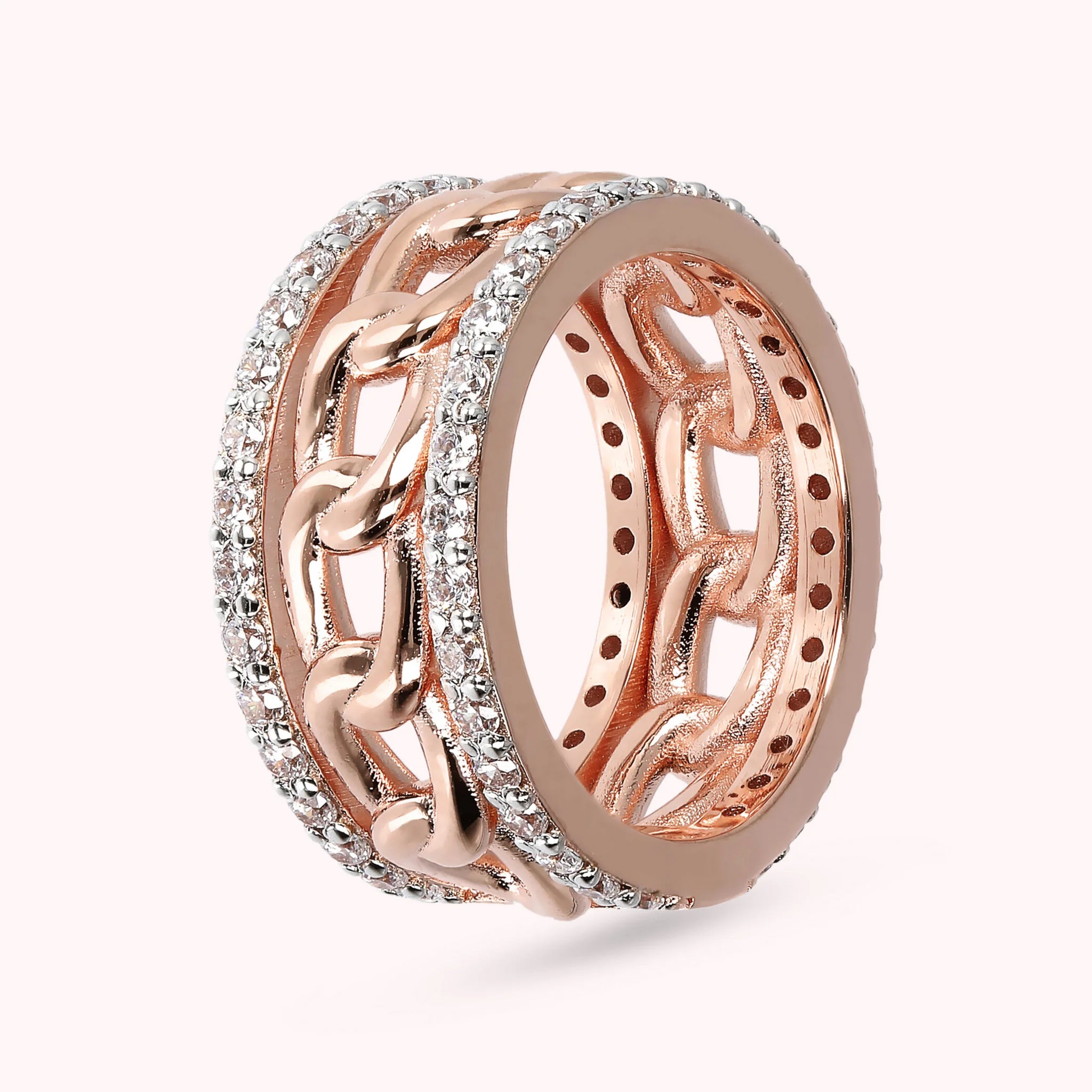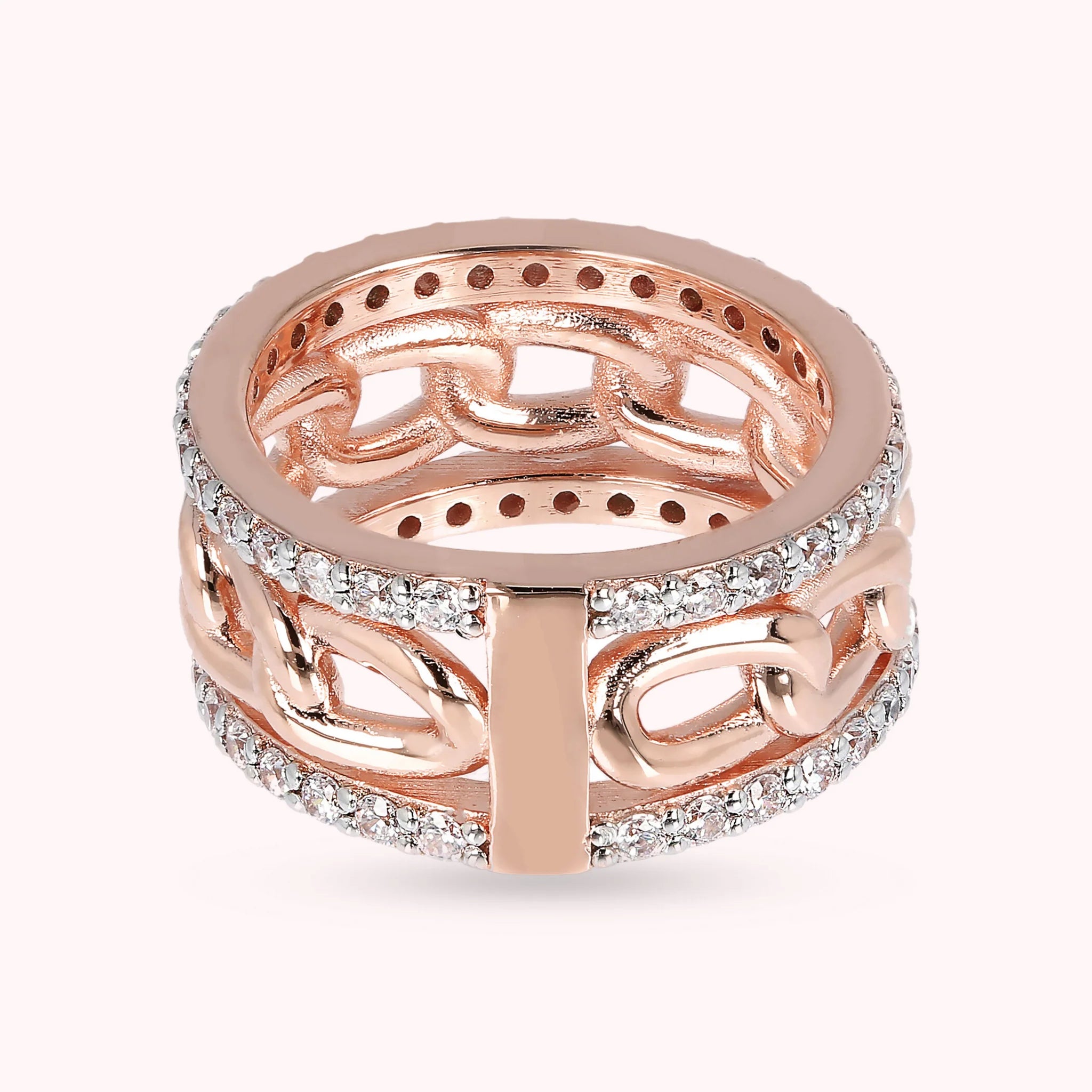Anello a fascia Bronzallure, realizzato in lega Golden Rosé, placcato oro rosa 18kt, impreziosito da due fili veretta con cubic zirconia di colore bianco, qualità luminosa, e da una parte centrale con maglia grumetta.