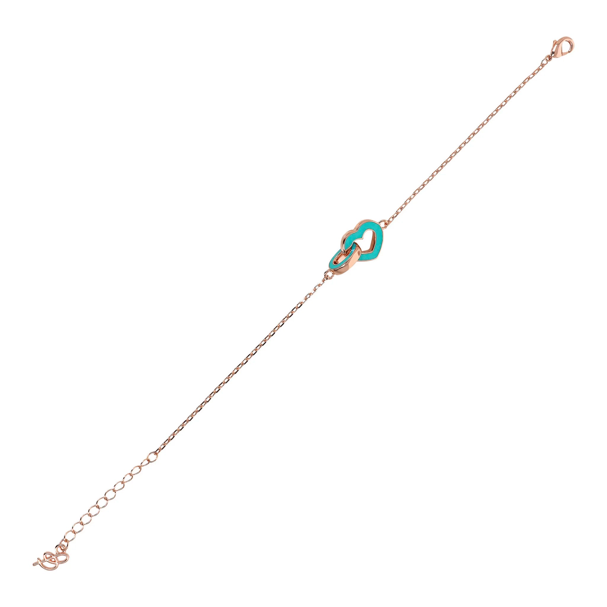 Bracciale realizzato in lega Golden Rosé, placcata Oro rosa 18kt, con catena forzatina impreziosita da un doppio ciondolo intrecciato a forma di cuore e di maglia ovale. Entrambi gli elementi presentano una superficie smaltata di colore rosso. Chiusura a moschettone.