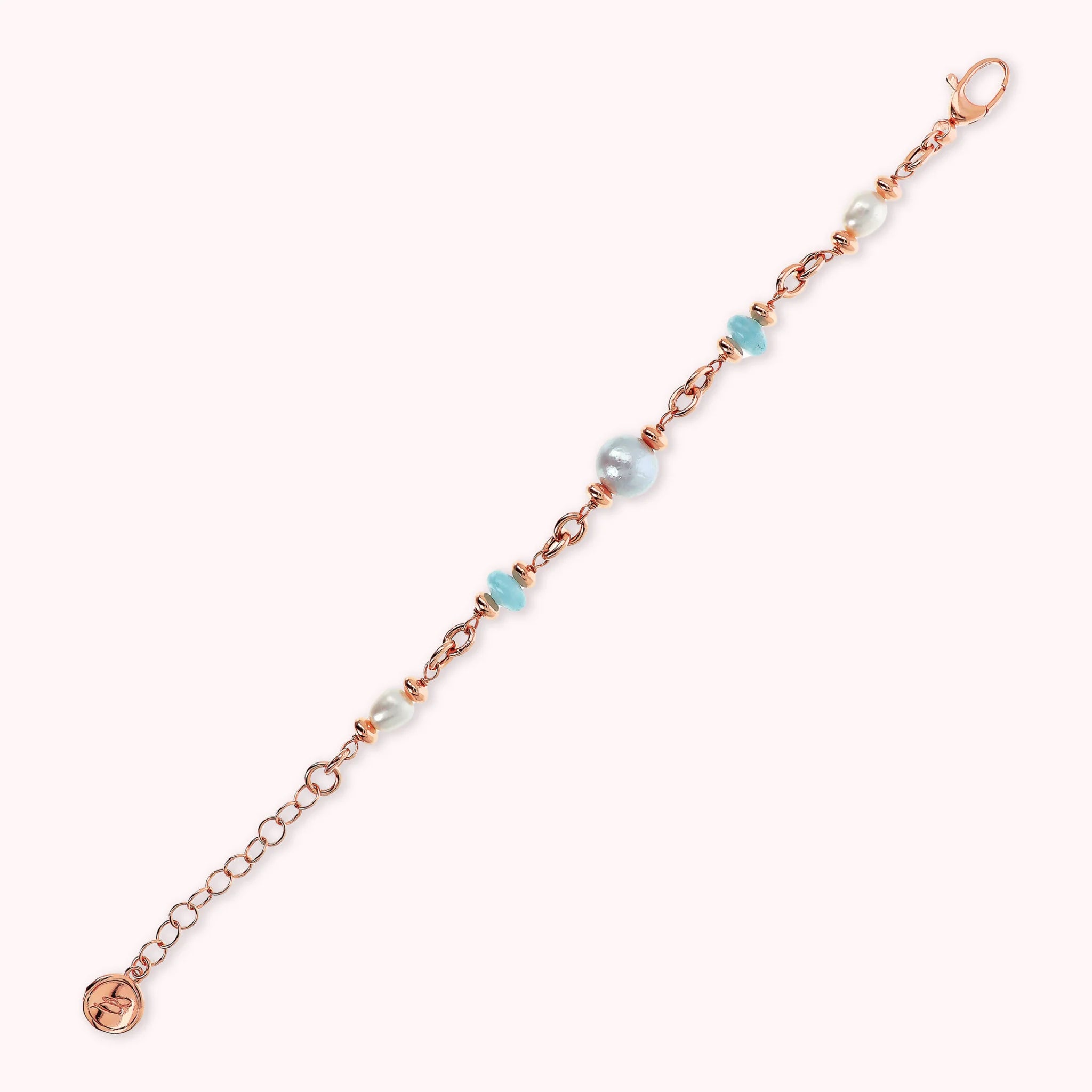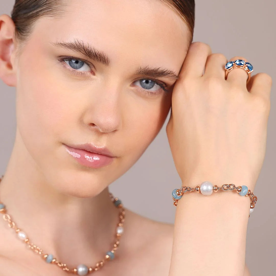 Bracciale Bronzallure realizzato in lega Golden Rosé, placcata Oro rosa 18kt, con catena rolo ovale impreziosita da piccole rondelle lucide alternate a rondelle in pietra naturale (8 mm) e a perle coltivate d'acqua dolce di due dimensioni diverse (6/7.5 mm e 9/11 mm). Lunghezza 17+4 cm di estensione. Chiusura a moschettone.