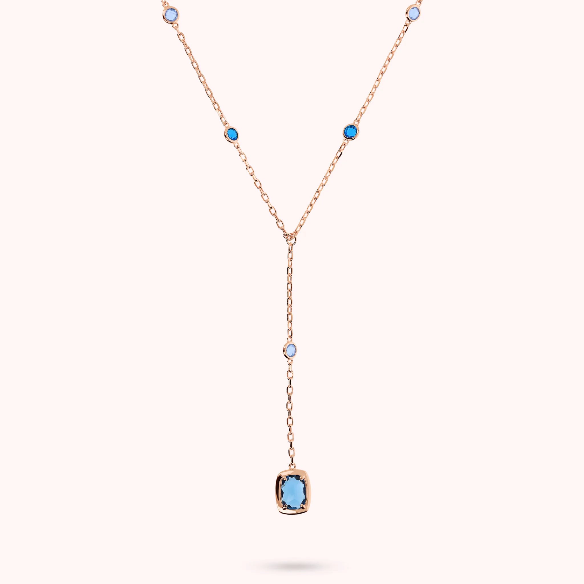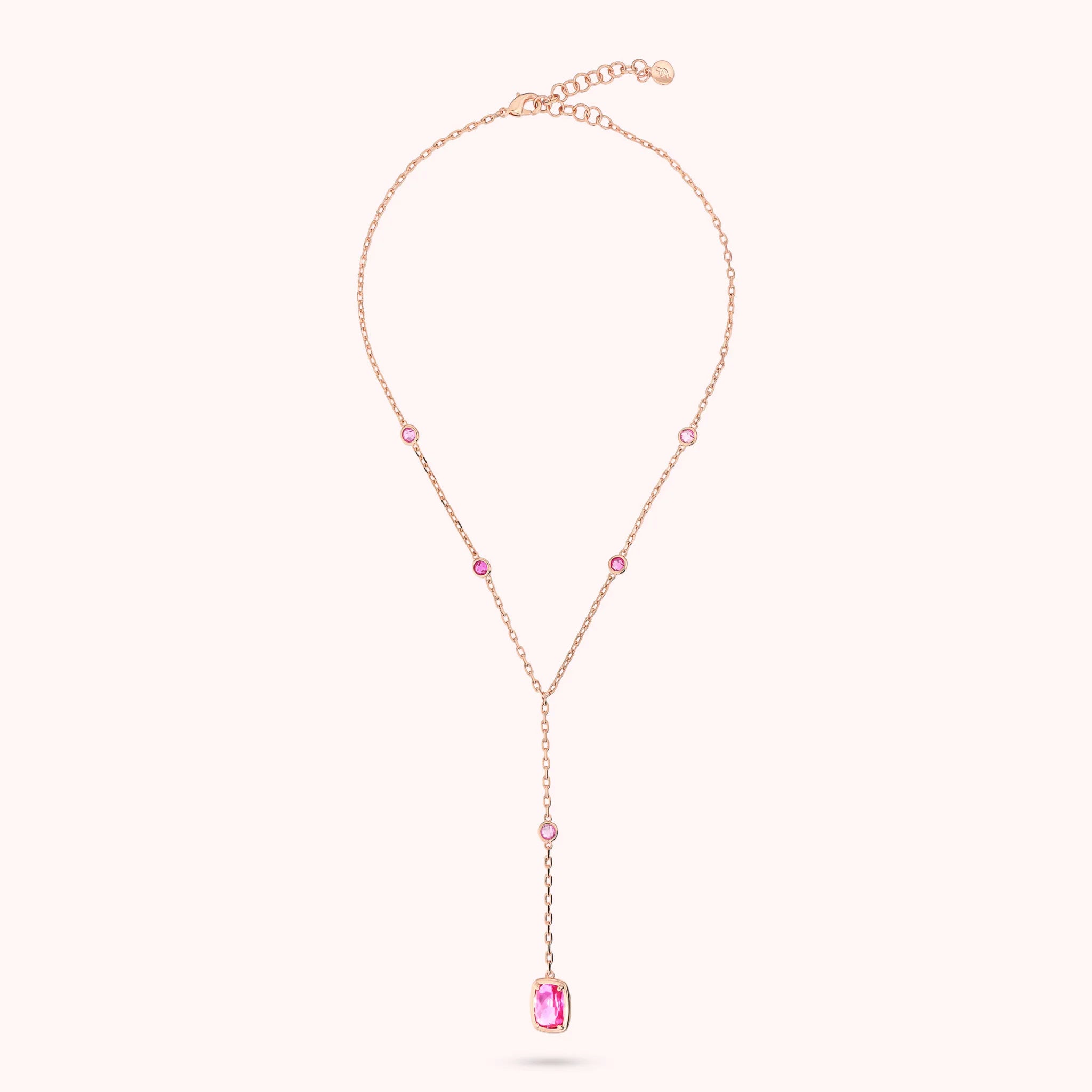 Collana a cravatta Bronzallure realizzata in lega Golden Rosé, placcata Oro rosa 18kt, con catena forzatina impreziosita da pepite lucide rettangolari (11x8 mm) alternate a pietre prisma gem tonde (4.5 mm) e a baguette (11x8 mm). Lunghezza 38+8 cm di drop. Chiusura a moschettone con estensione di 5cm.