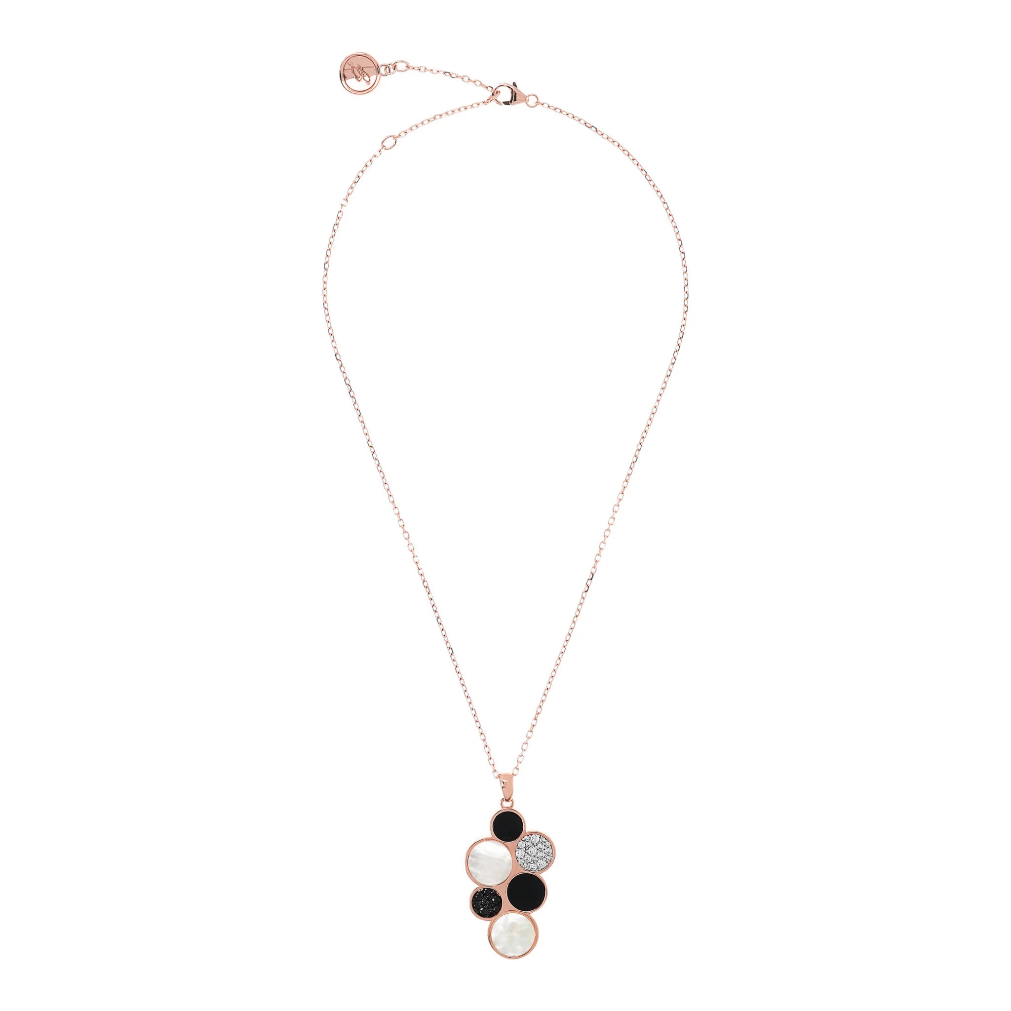 Collana Bronzallure realizzata in lega Golden Rosé, placcata oro rosa 18kt con pendente a grappolo composto da dischi in madreperla bianca, onice nero e cubic zirconia di colore nero dalla qualità luminosa, montati su base placcata oro rosa 18kt; catena rolo con chiusura a gancio e lunghezza regolabile da tre anelli (41 cm / 44 cm / 47 cm).