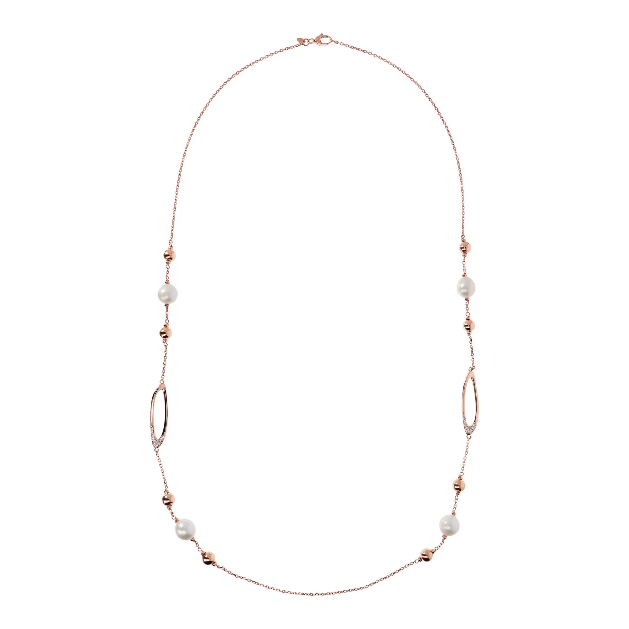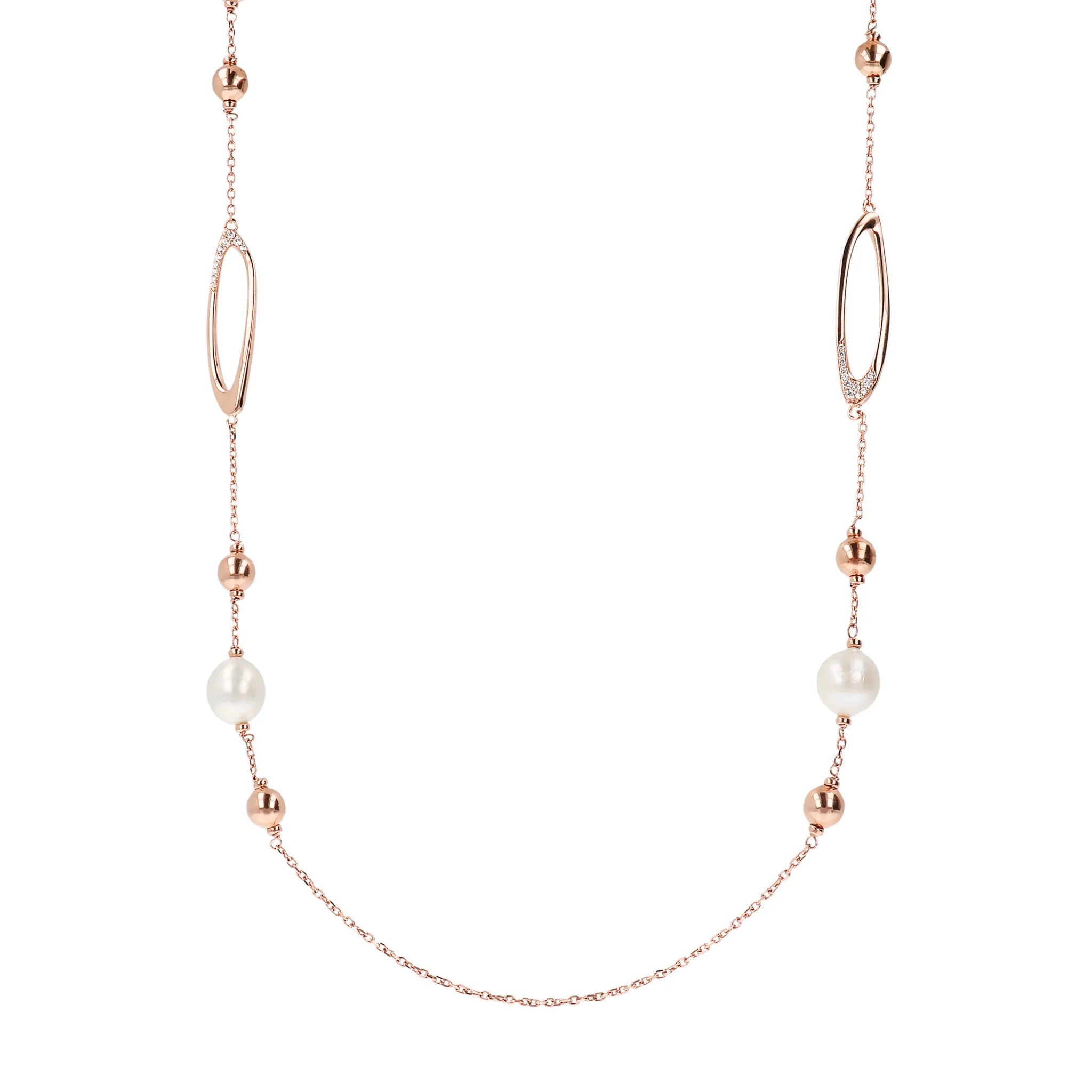 Collana lunga Bronzallure realizzata in lega Golden Rosé, placcata oro rosa 18kt con catena rolo impreziosita da dettagli ovali con cubic zirconia, da piccole sfere lucide in Golden Rosé e da perle coltivate d'acqua dolce bianche (circa 12 mm); chiusura a moschettone.