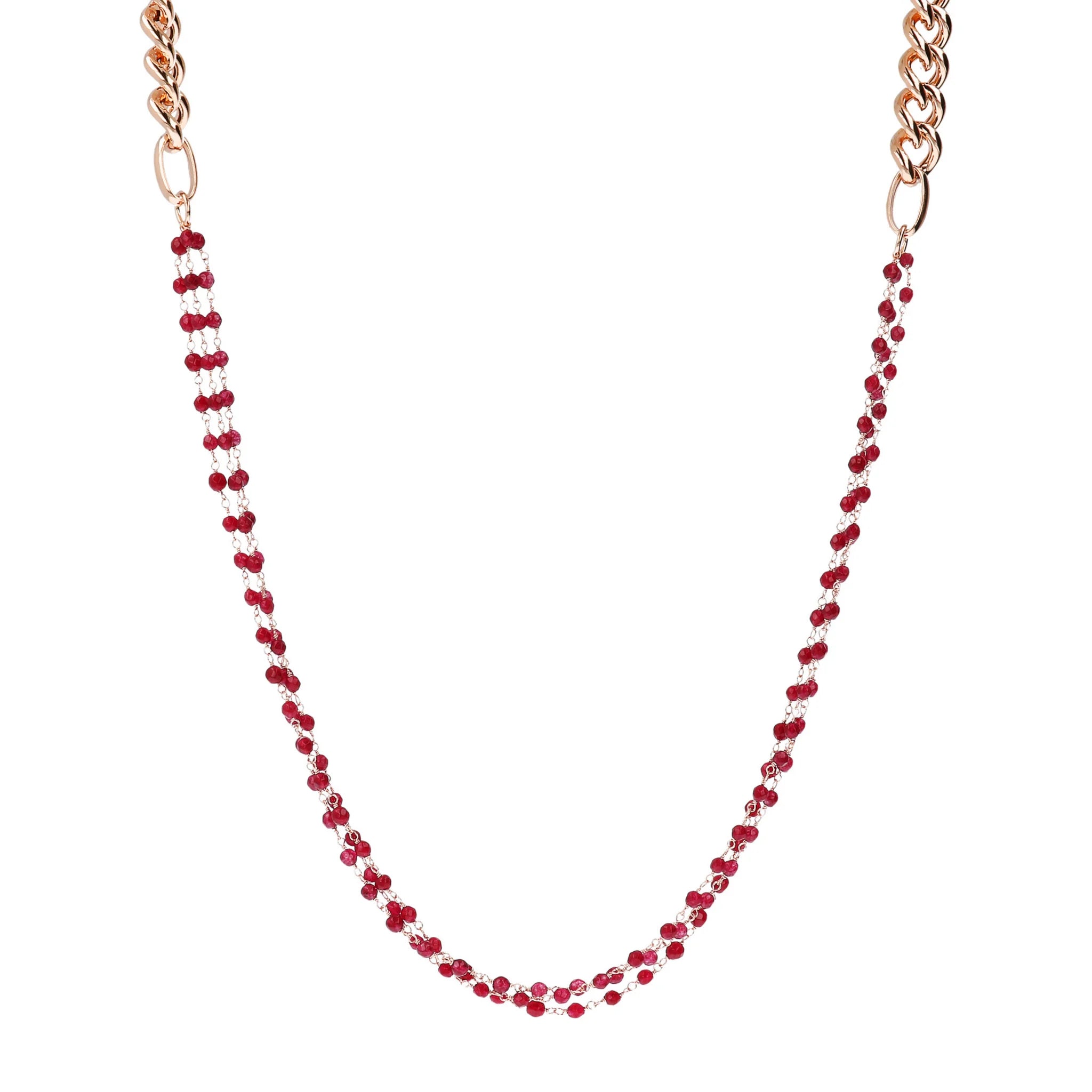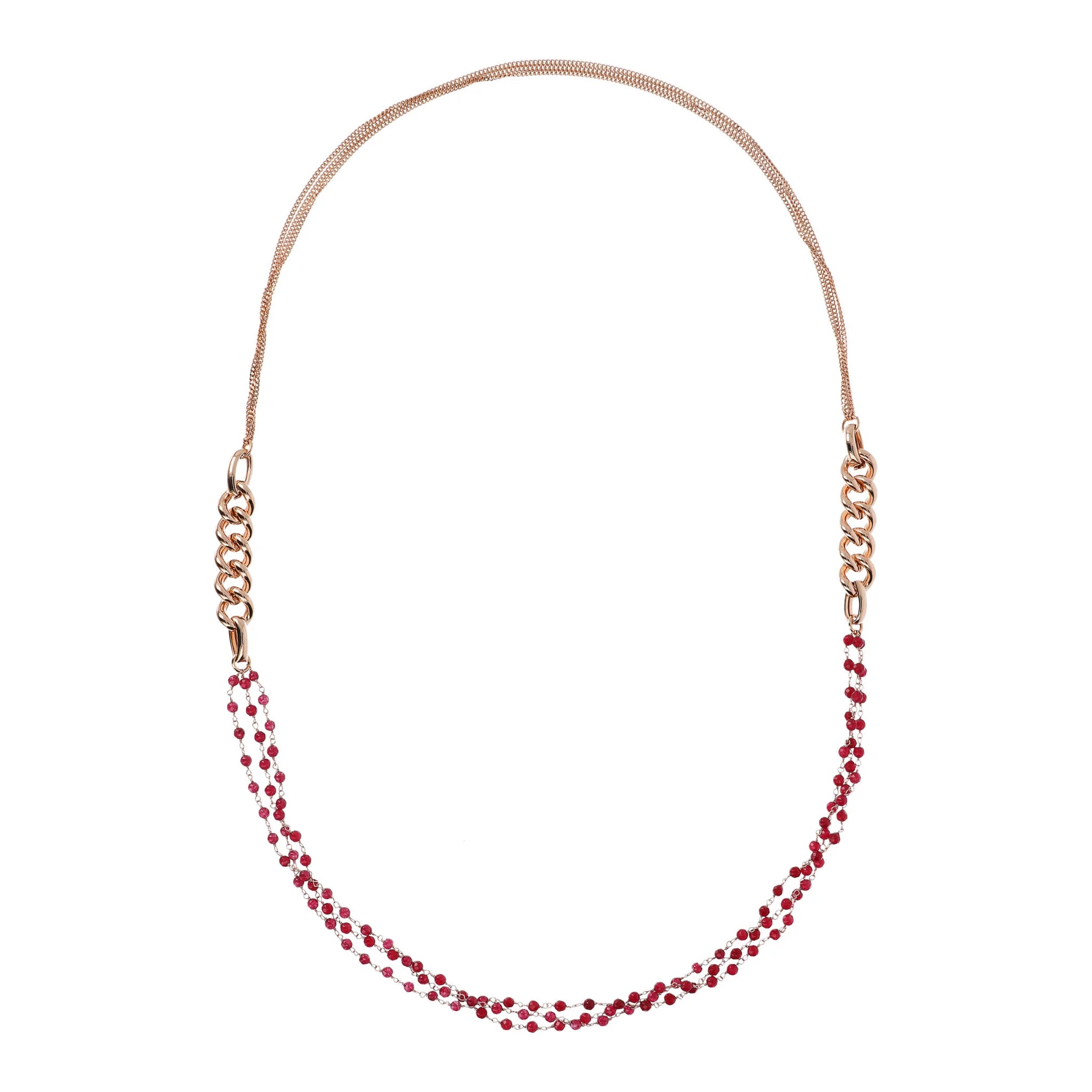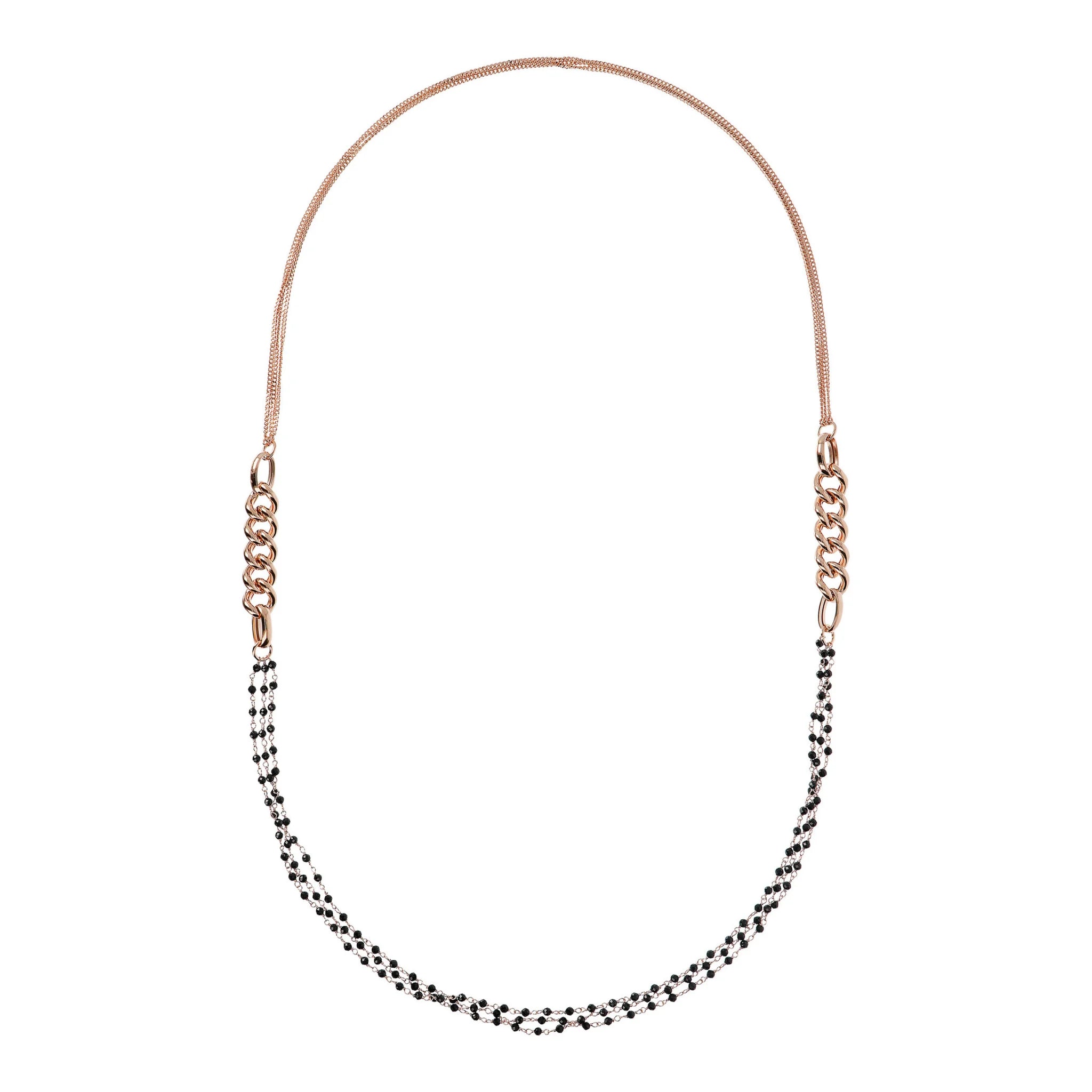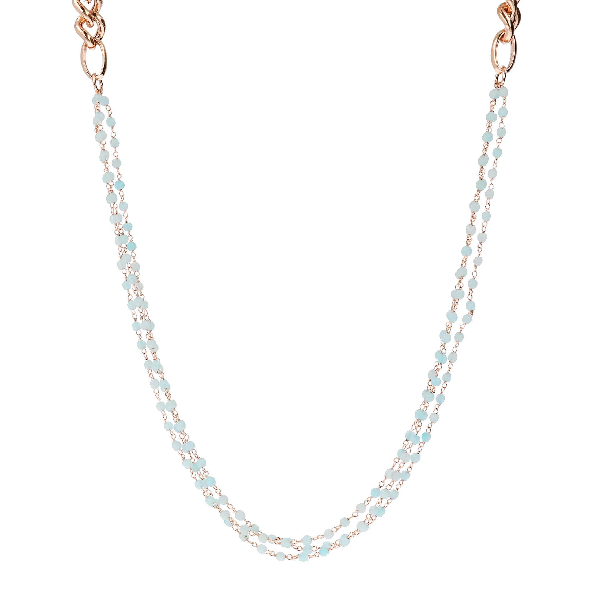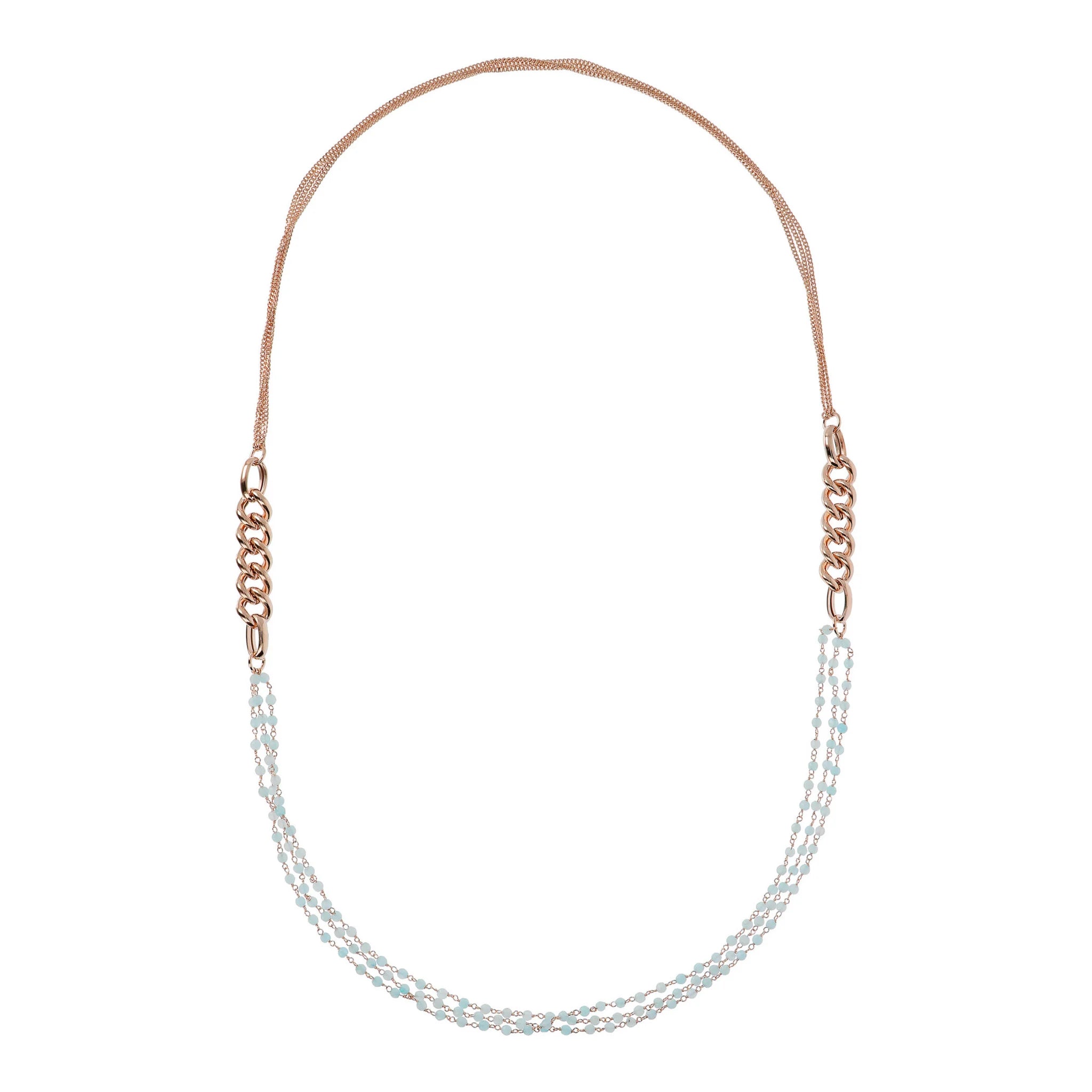 Collana lunga Bronzallure realizzata in lega Golden Rosé, placcata oro rosa 18kt. La parte superiore è composta da tre fili di catena grumetta sottile; la parte inferiore è composta da tre catene rosario con pietre naturali sfaccettate. Ai lati sono presenti elementi a grumetta in Golden Rosé.