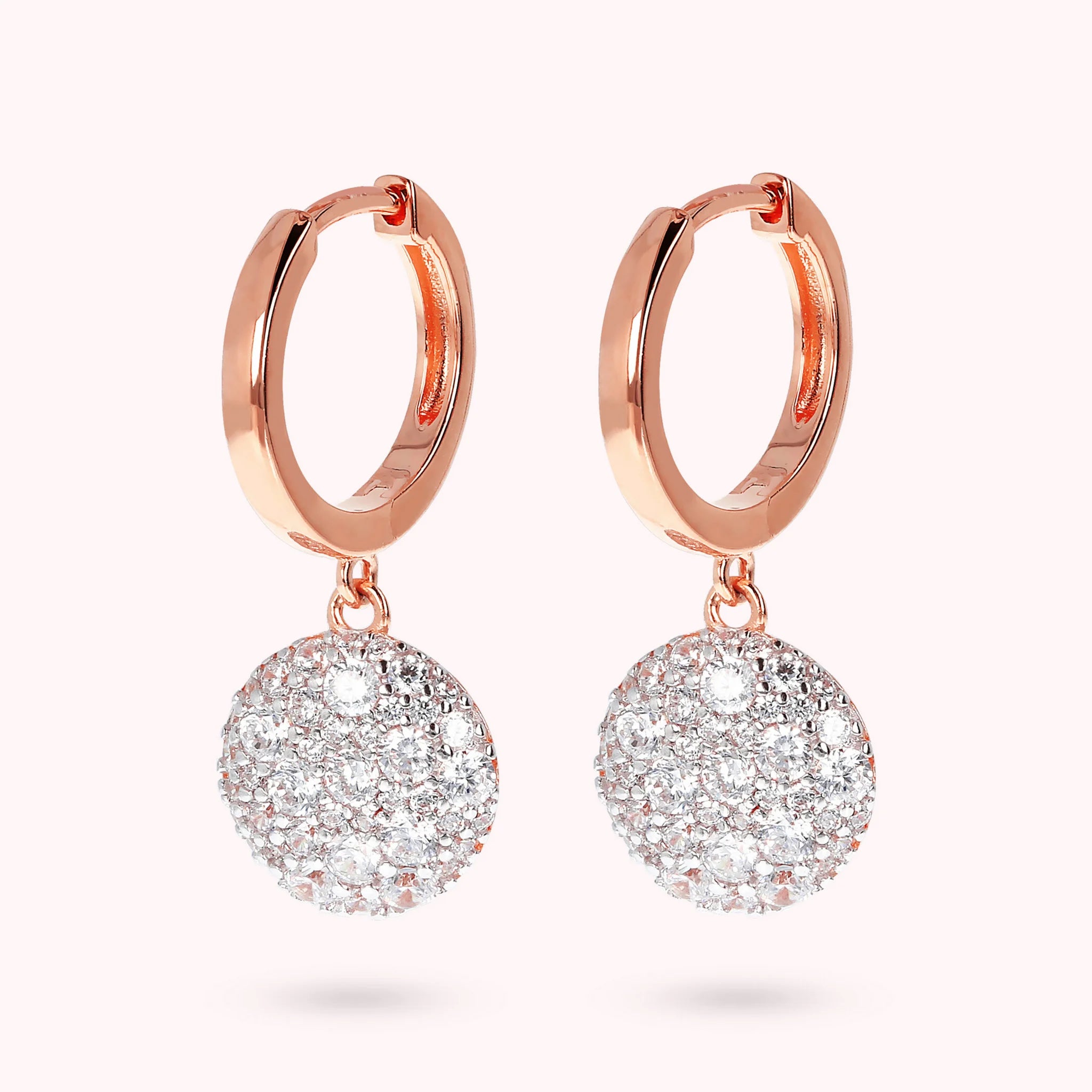 Orecchini a cerchio pendenti Bronzallure, realizzati in lega Golden Rosé, placcati oro rosa 18kt, impreziositi da ciondolo pavé in cubic zirconia di colore bianco, qualità luminosa; chiusura con perno a incastro.