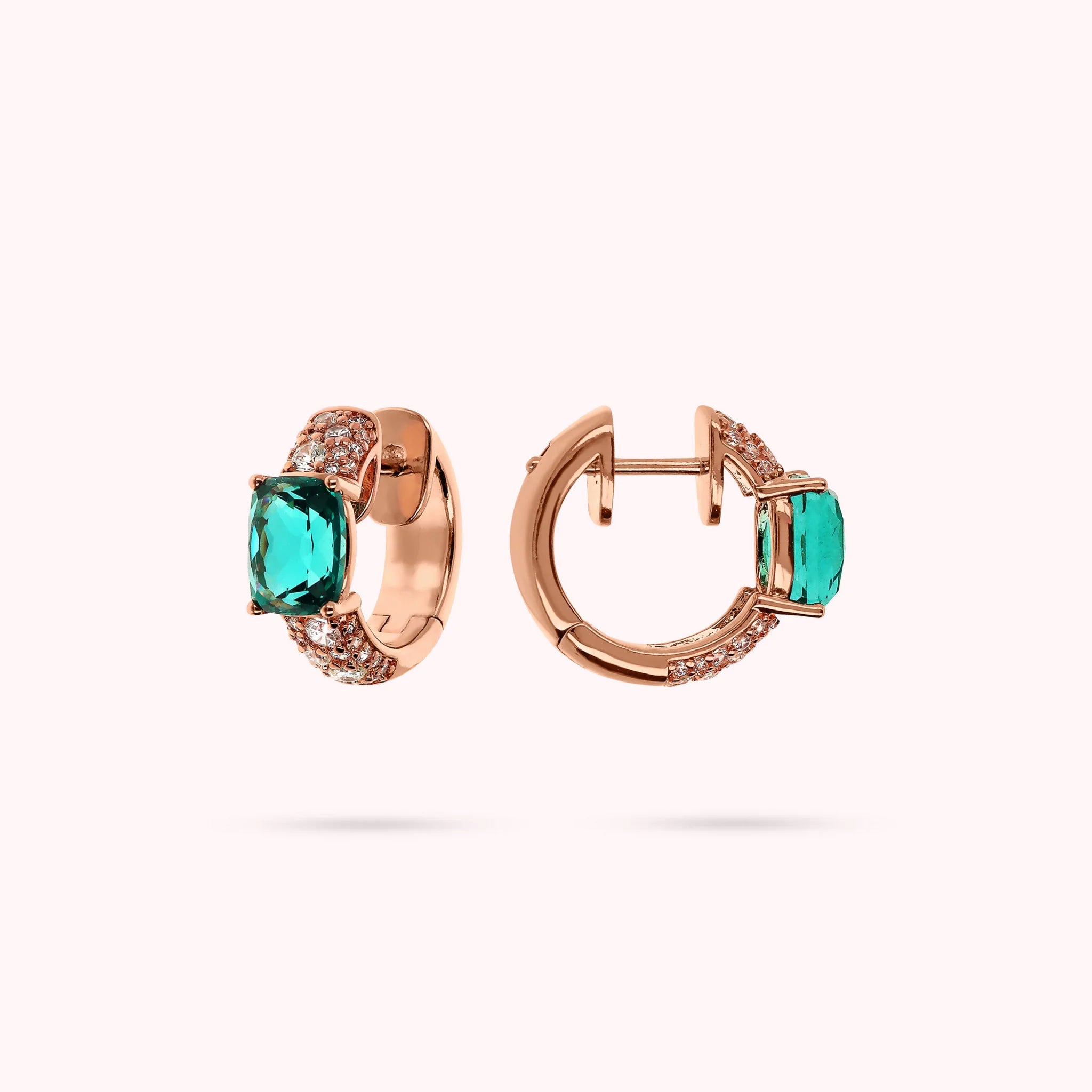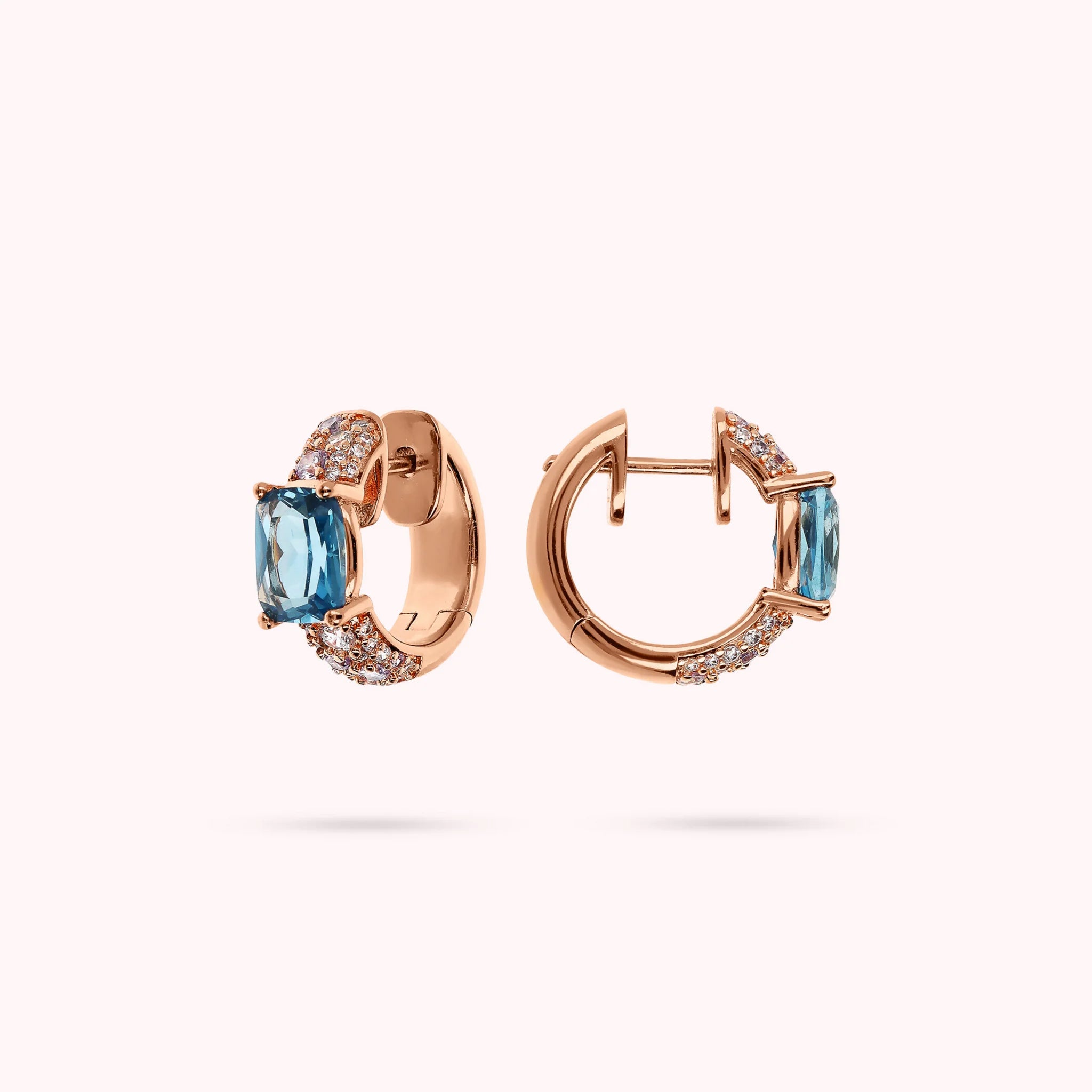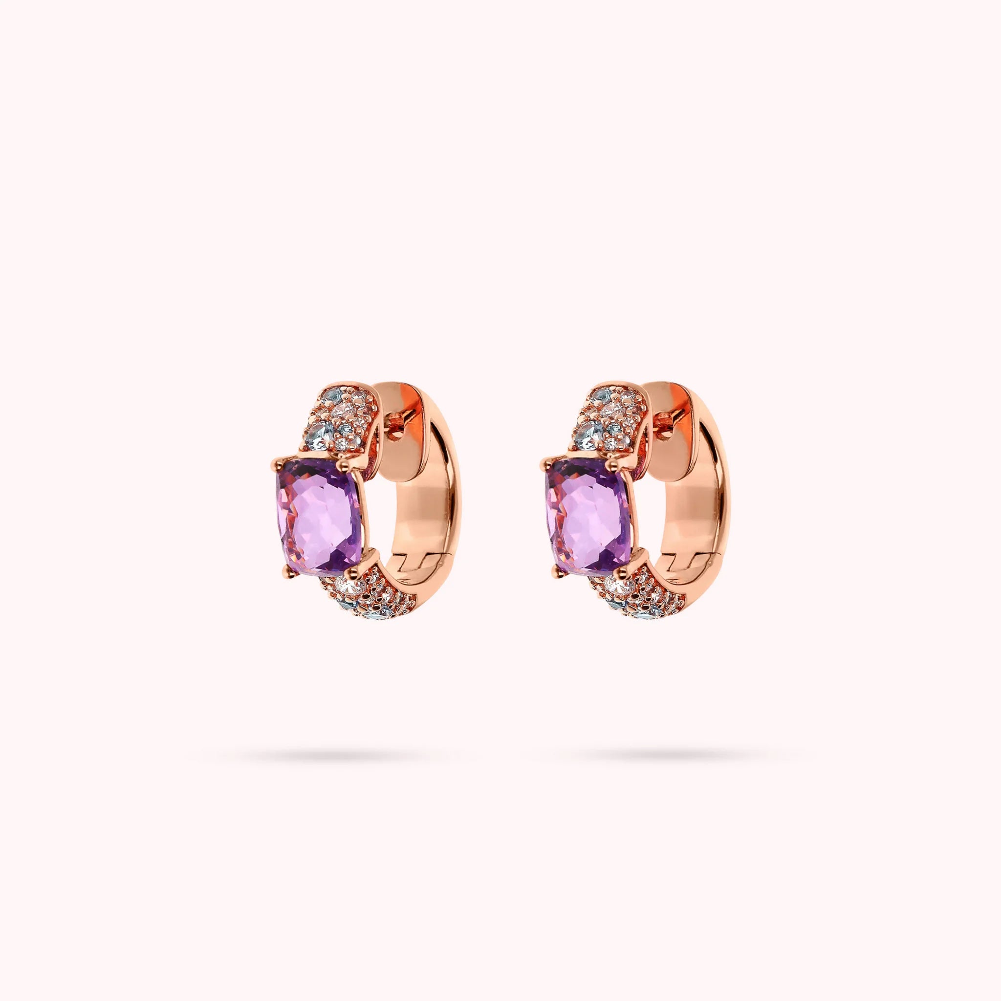 Orecchini a cerchio Bronzallure realizzati in lega Golden Rosé, placcata Oro rosa 18kt, con superficie in pavé di cubic zirconia, qualità luminosa, impreziositi da pietre prisma gem rettangolari (8x5 mm) dal taglio a mosaico. Chiusura con perno a incastro. Diametro esterno 1.5 cm.