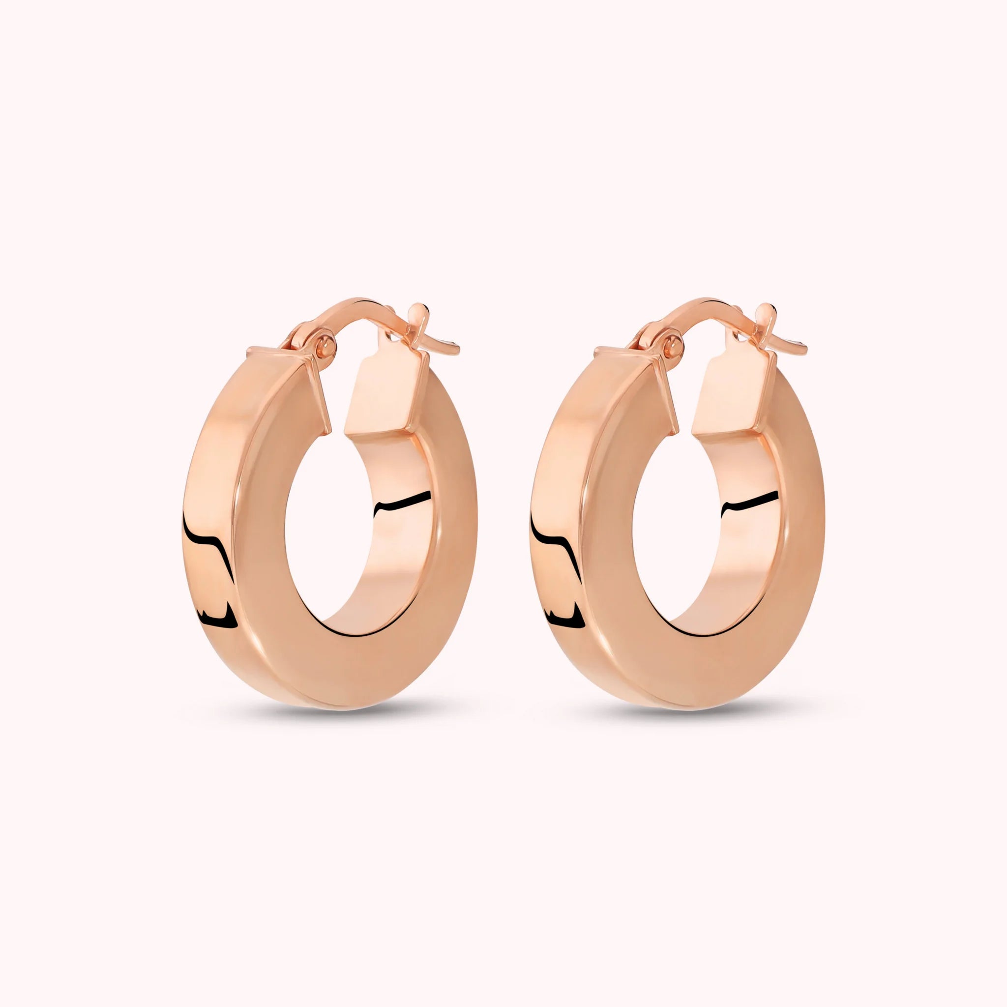 Orecchini a cerchio Bronzallure realizzati in lega Golden Rosé, placcata Oro rosa 18kt, con finitura lucida, dal design squadrato. Chiusura a baionetta. Diametro esterno 1.8cm.