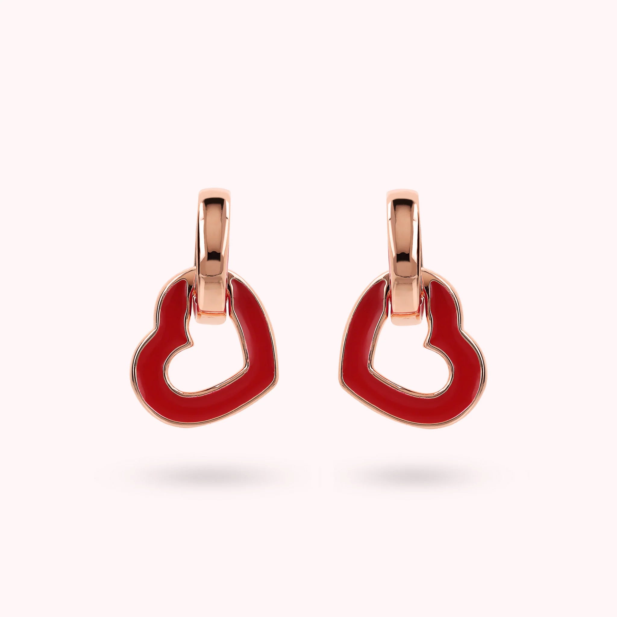 Orecchini pendenti realizzati in lega Golden Rosé, placcata Oro rosa 18kt, con doppio elemento intrecciato a forma di cuore e maglia ovale. Entrambi gli elementi presentano una superficie smaltata. Chiusura a perno e farfalla.