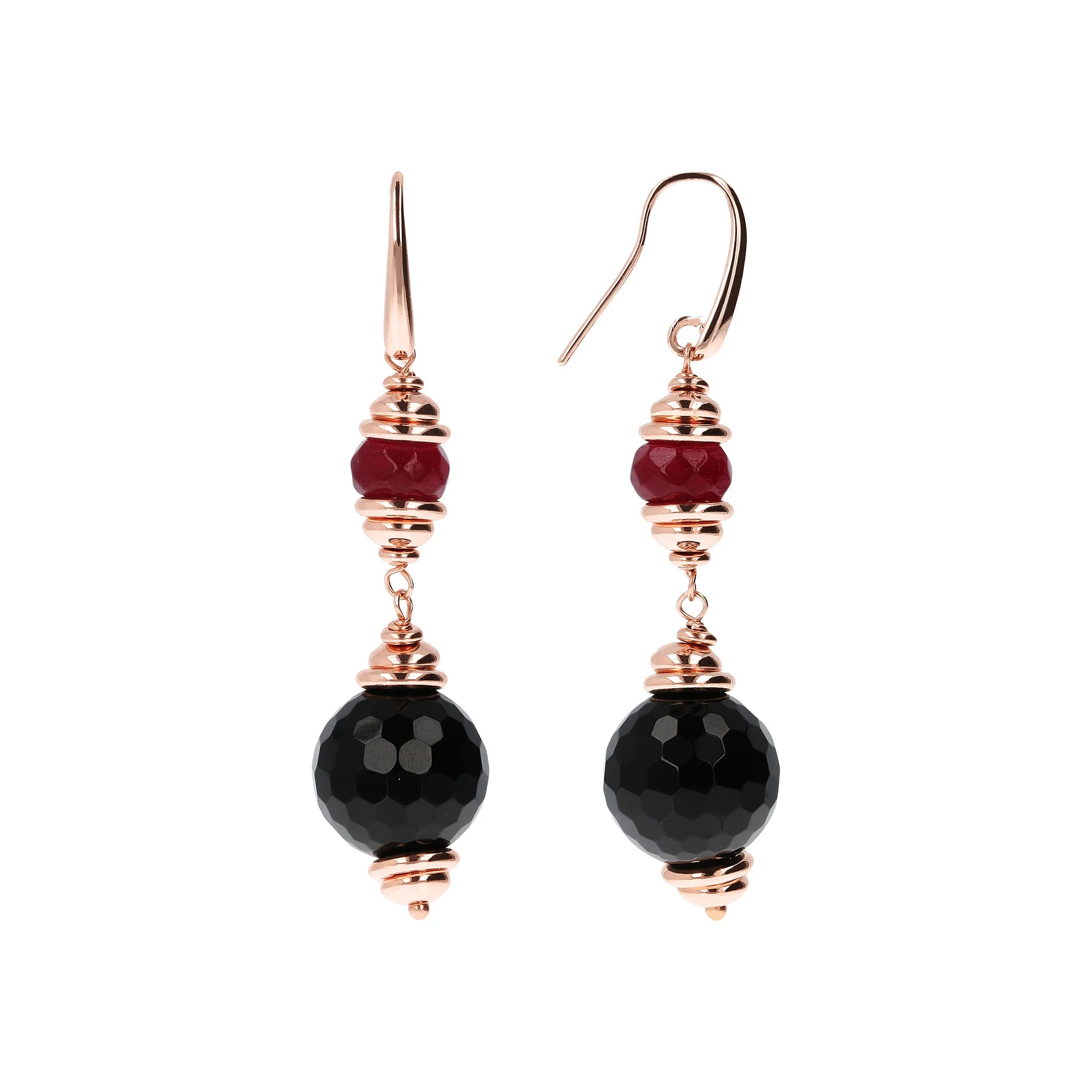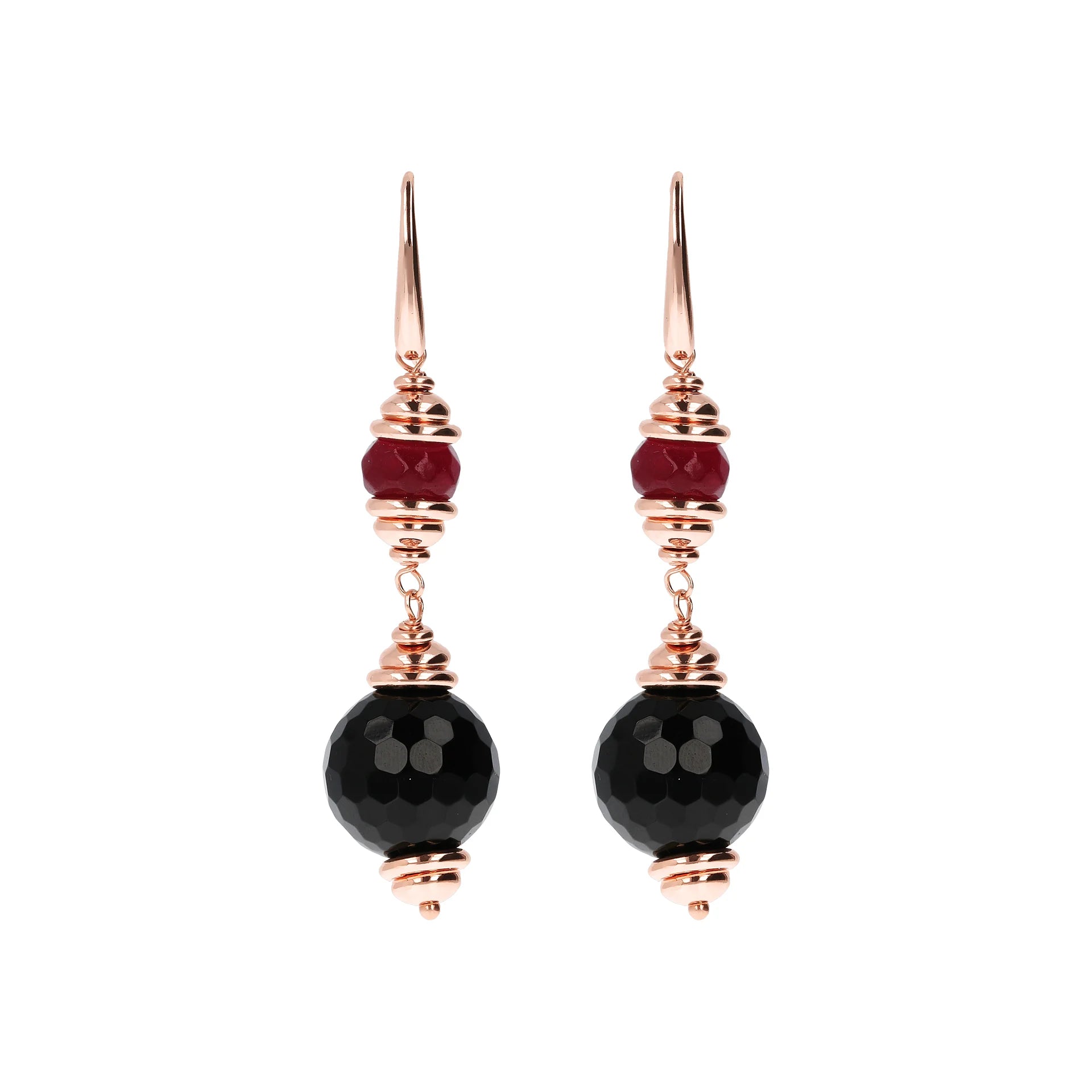 Orecchini pendenti Bronzallure realizzati in lega Golden Rosé, placcati oro rosa 18kt, impreziositi da rondelle in Golden Rosé alternate a pietre naturali onice nero (14 mm) e quarzo rosso (5x8 mm); chiusura ad amo.