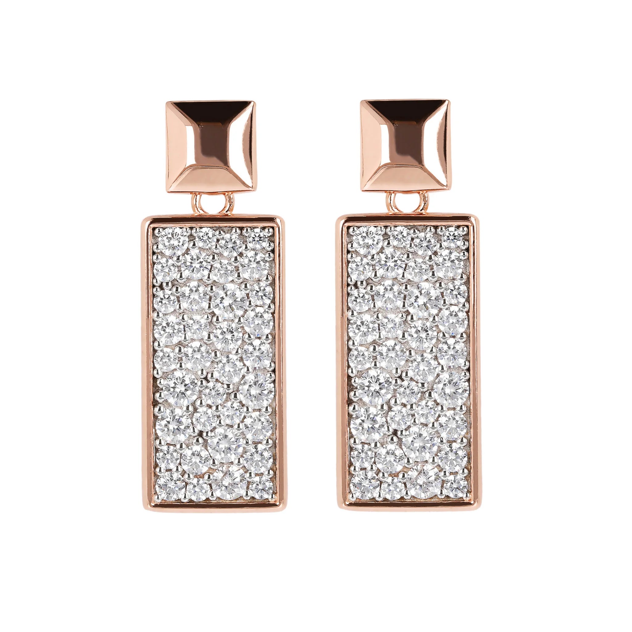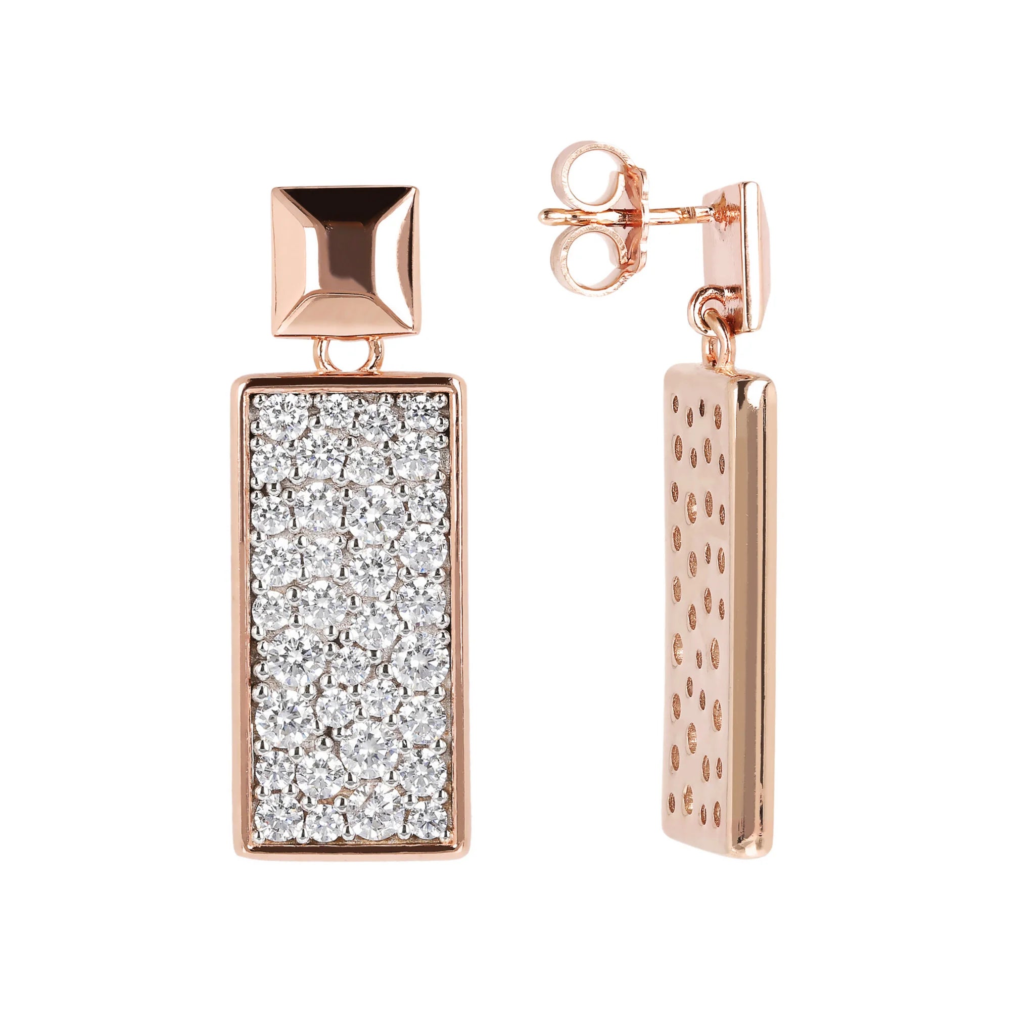 Orecchini pendenti Bronzallure, realizzati in lega Golden Rosé, placcata oro rosa 18kt, con elemento rettangolare in pavé di cubic zirconia di colore bianco, qualità luminosa. Chiusura a perno e farfalla.