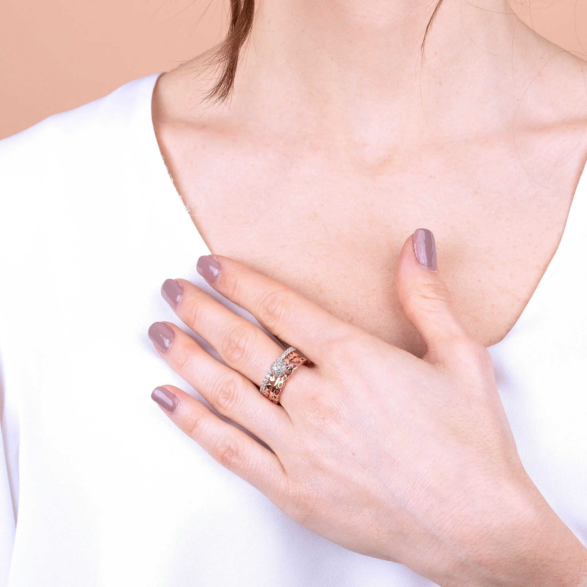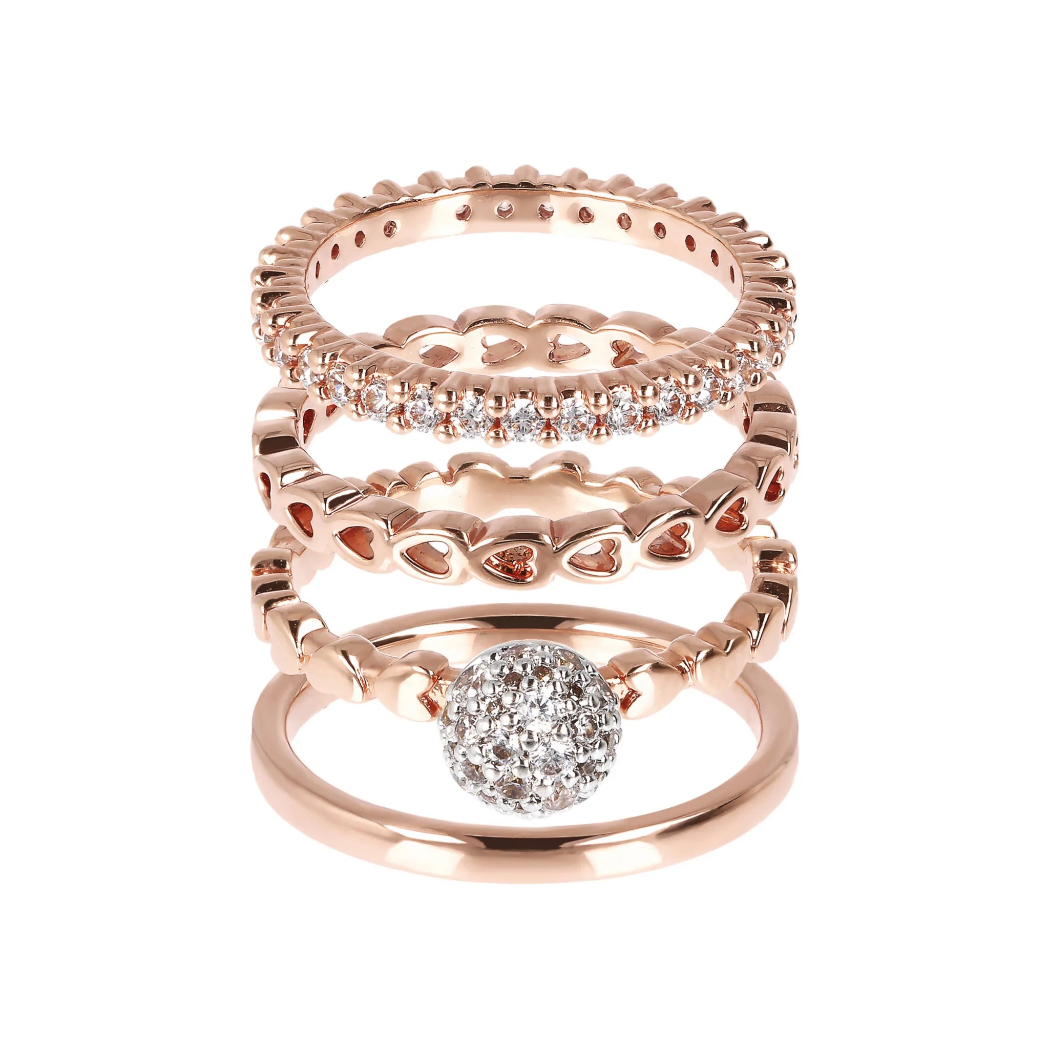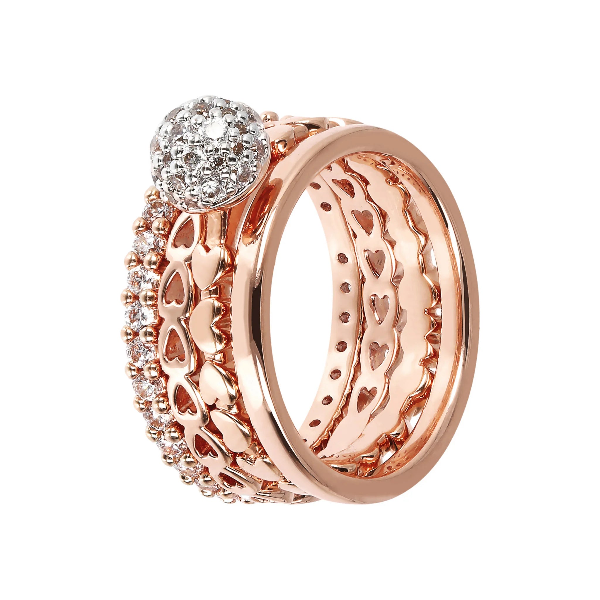 Set di anelli Bronzallure realizzati in lega Golden Rosé, placcata oro rosa 18kt. Il set è composto da 4 anelli: una veretta coperta interamente da cubic zirconia luminose, una fedina traforata a cuori, un solitario con punto luce in in cubic zirconia e una fedina liscia.