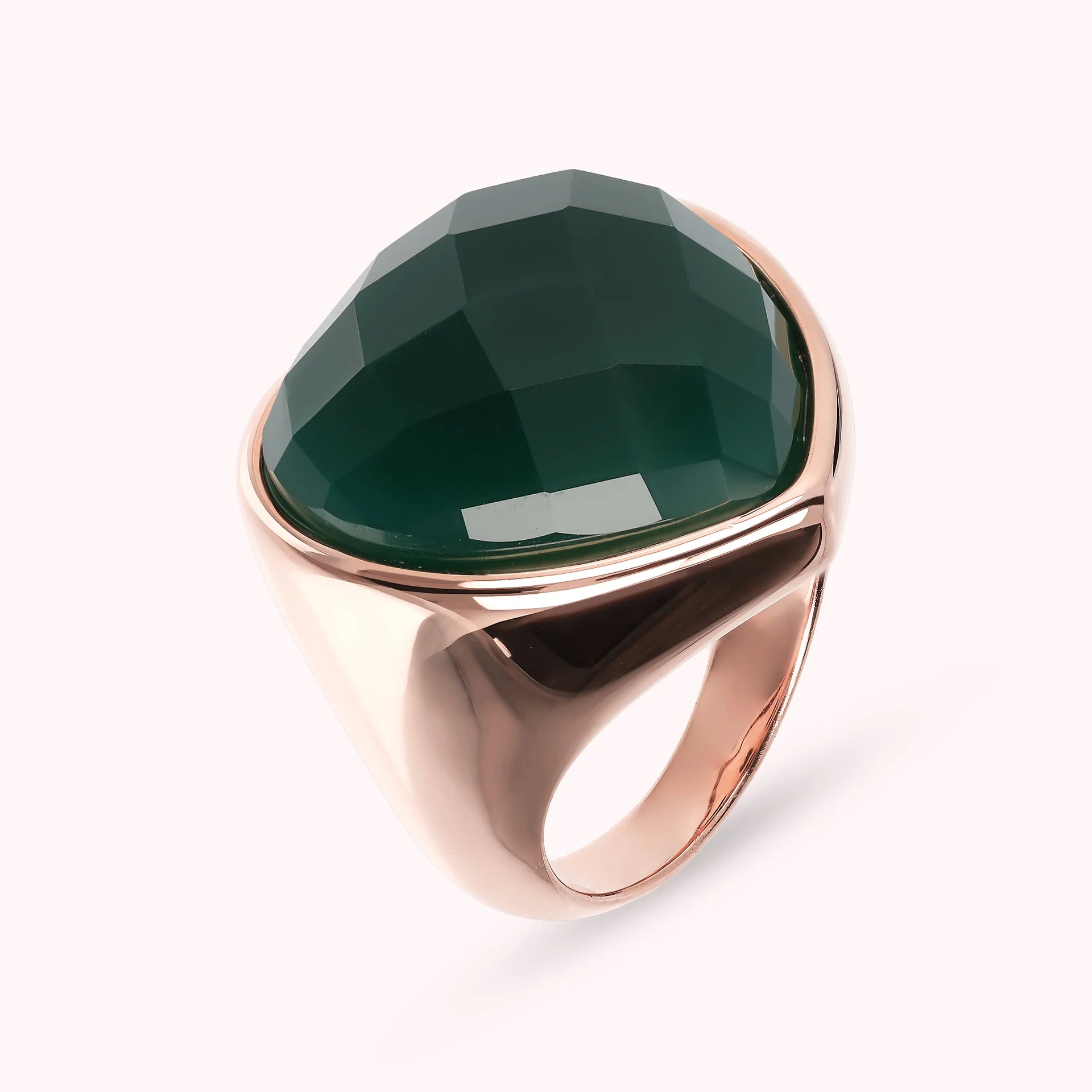 Anello chevalier Bronzallure realizzato in lega Golden Rosé, placcato oro rosa 18kt, impreziosito da un cuore in pietra naturale (23 mm) dai colori luminosi e dalla superficie sfaccettata.