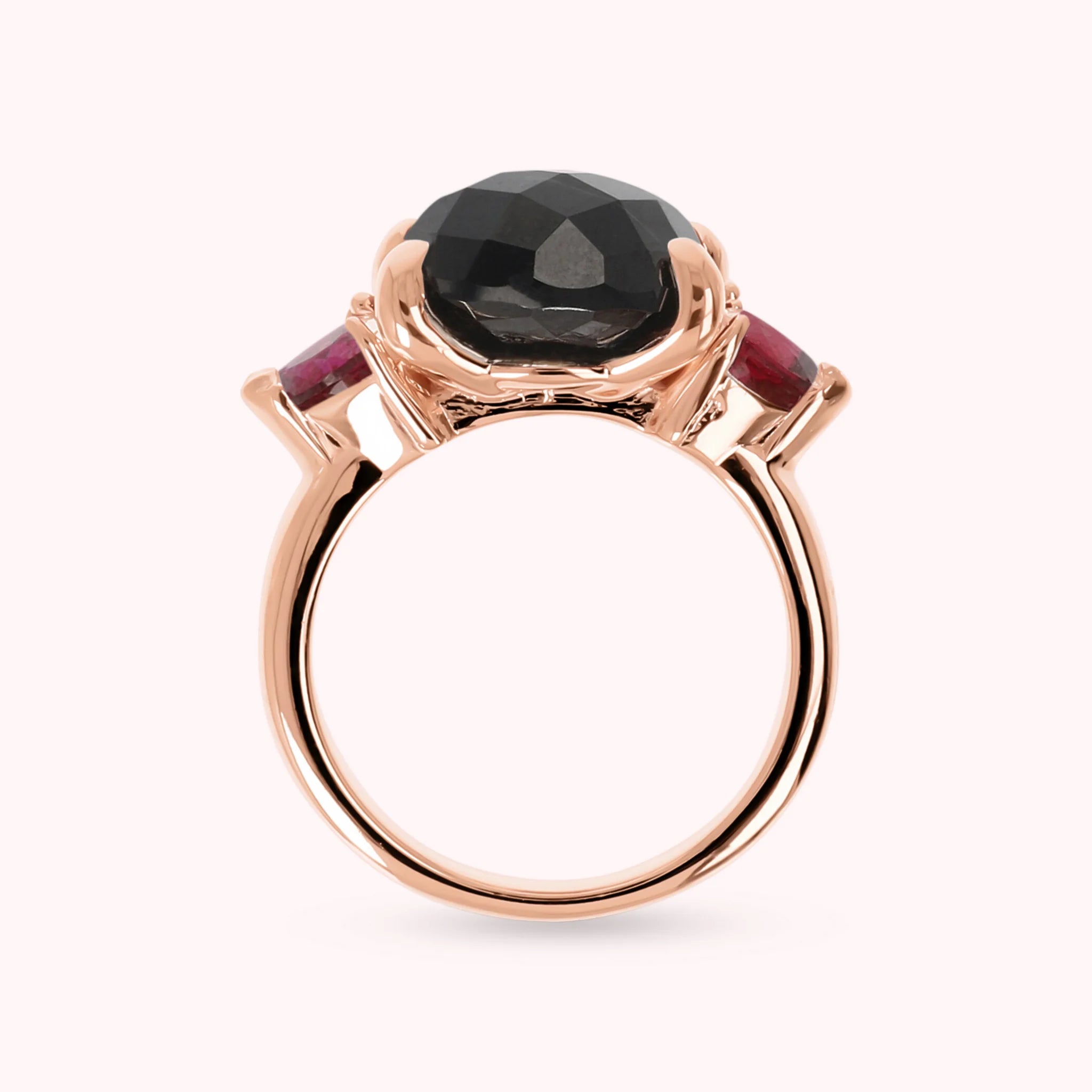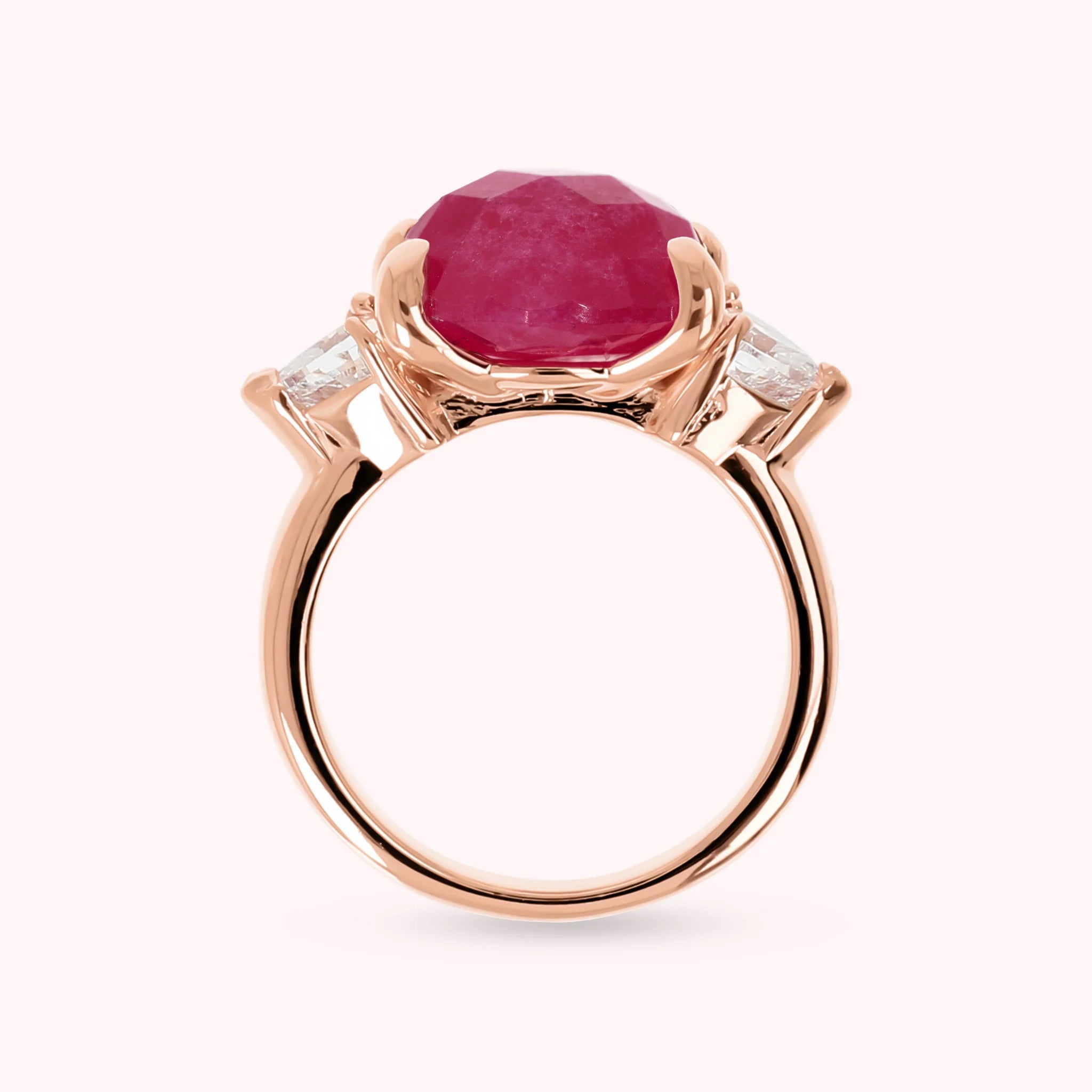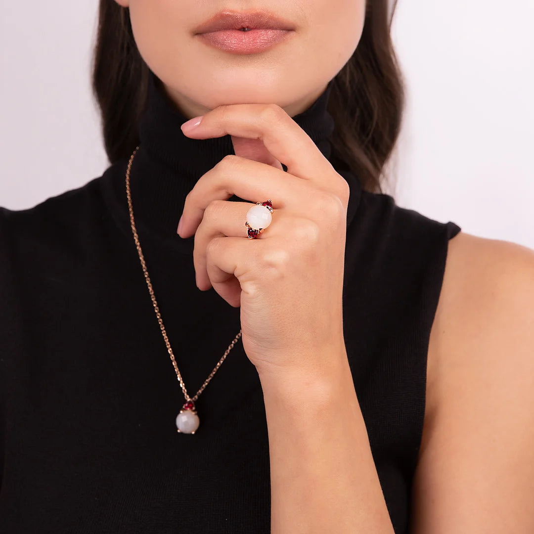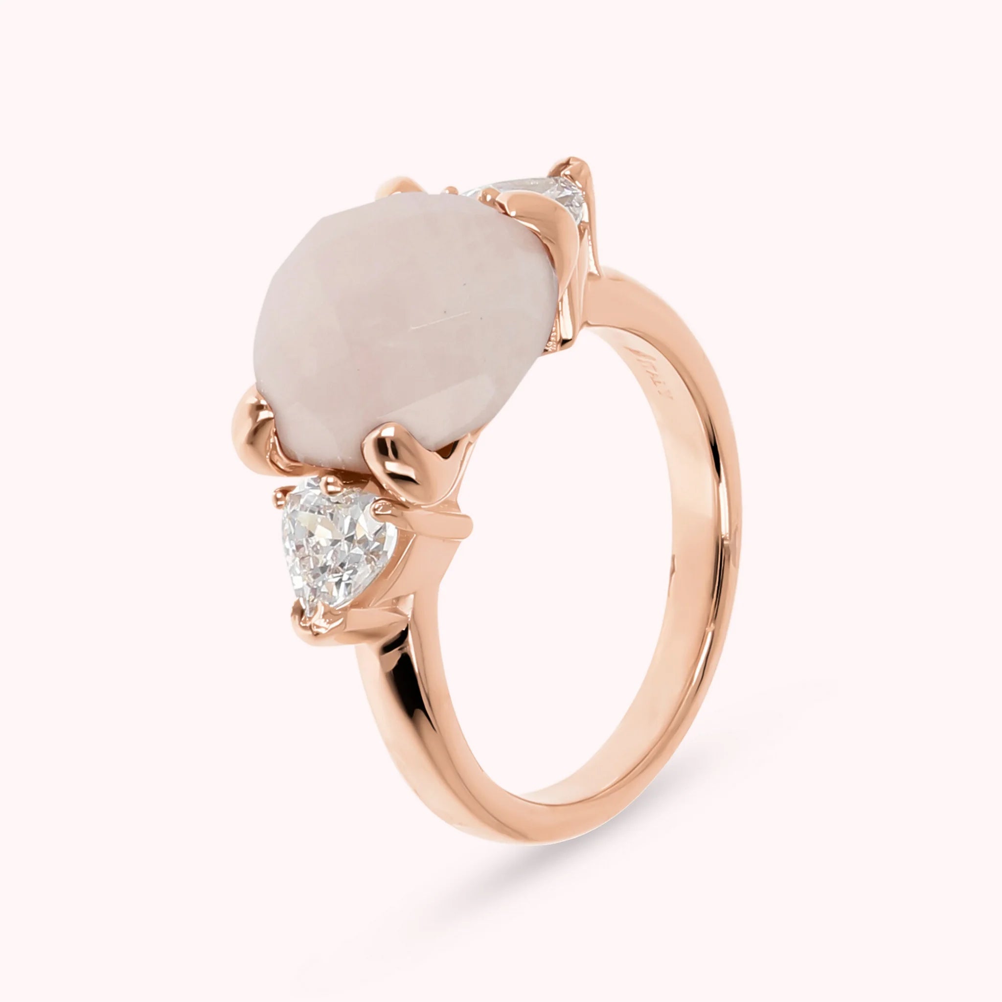 Anello cocktail Bronzallure realizzato in lega Golden Rosé, placcato oro rosa 18kt, impreziosito da una pietra naturale centrale dalla forma tonda (12 mm) e da due cuori laterali (5x5 mm) in cubic zirconia, qualità luminosa.