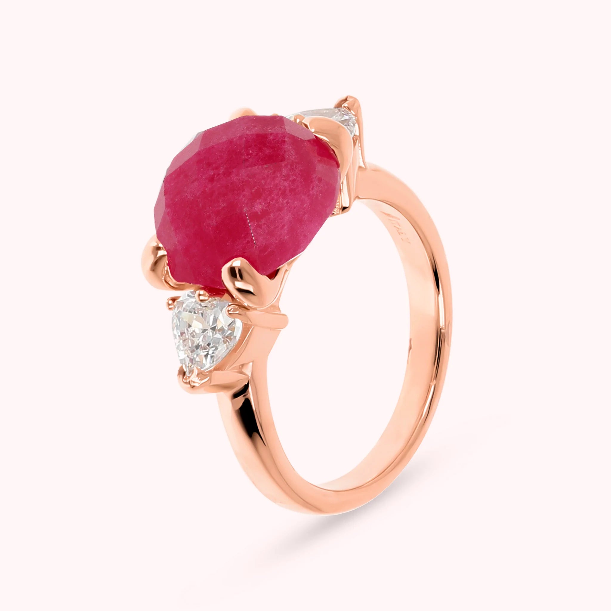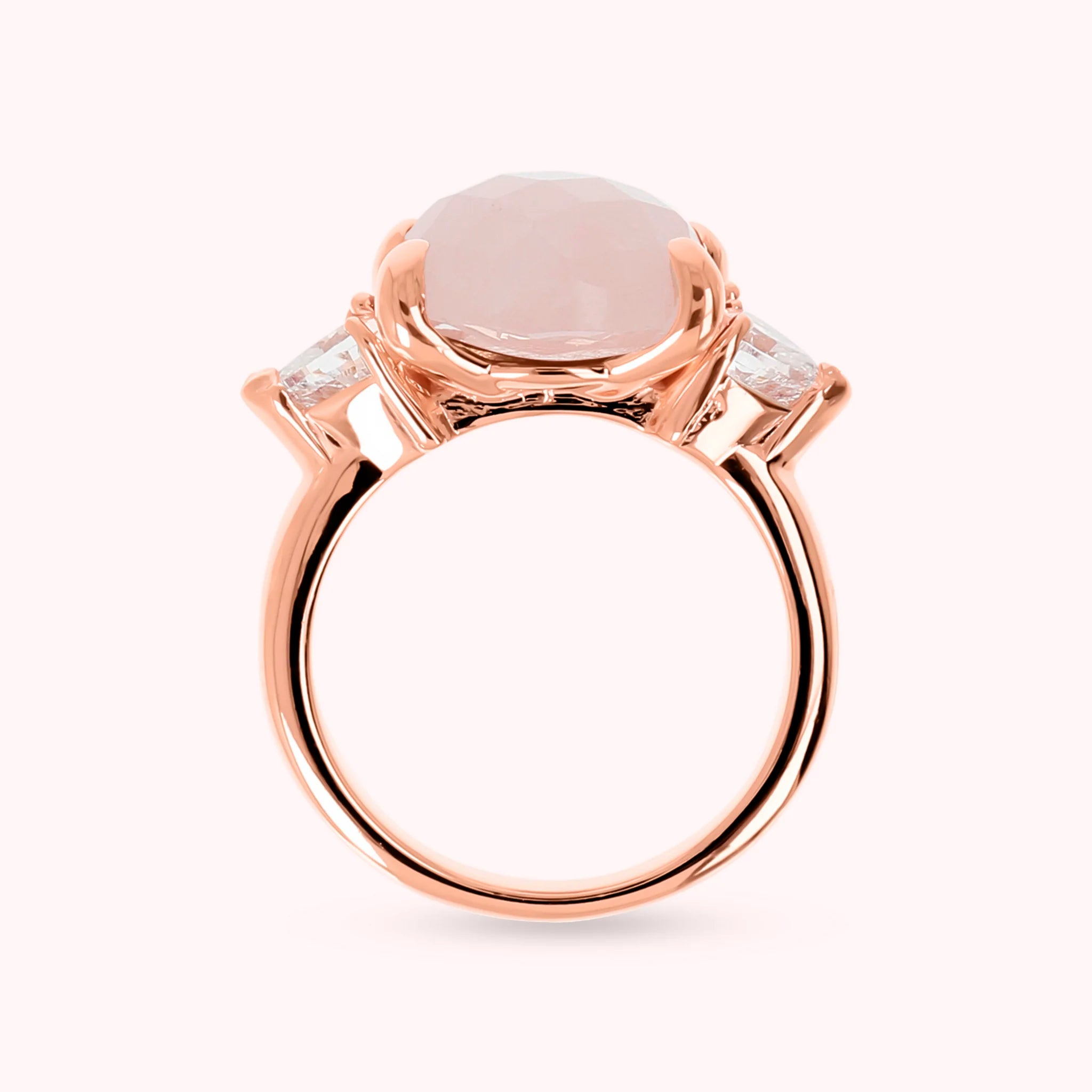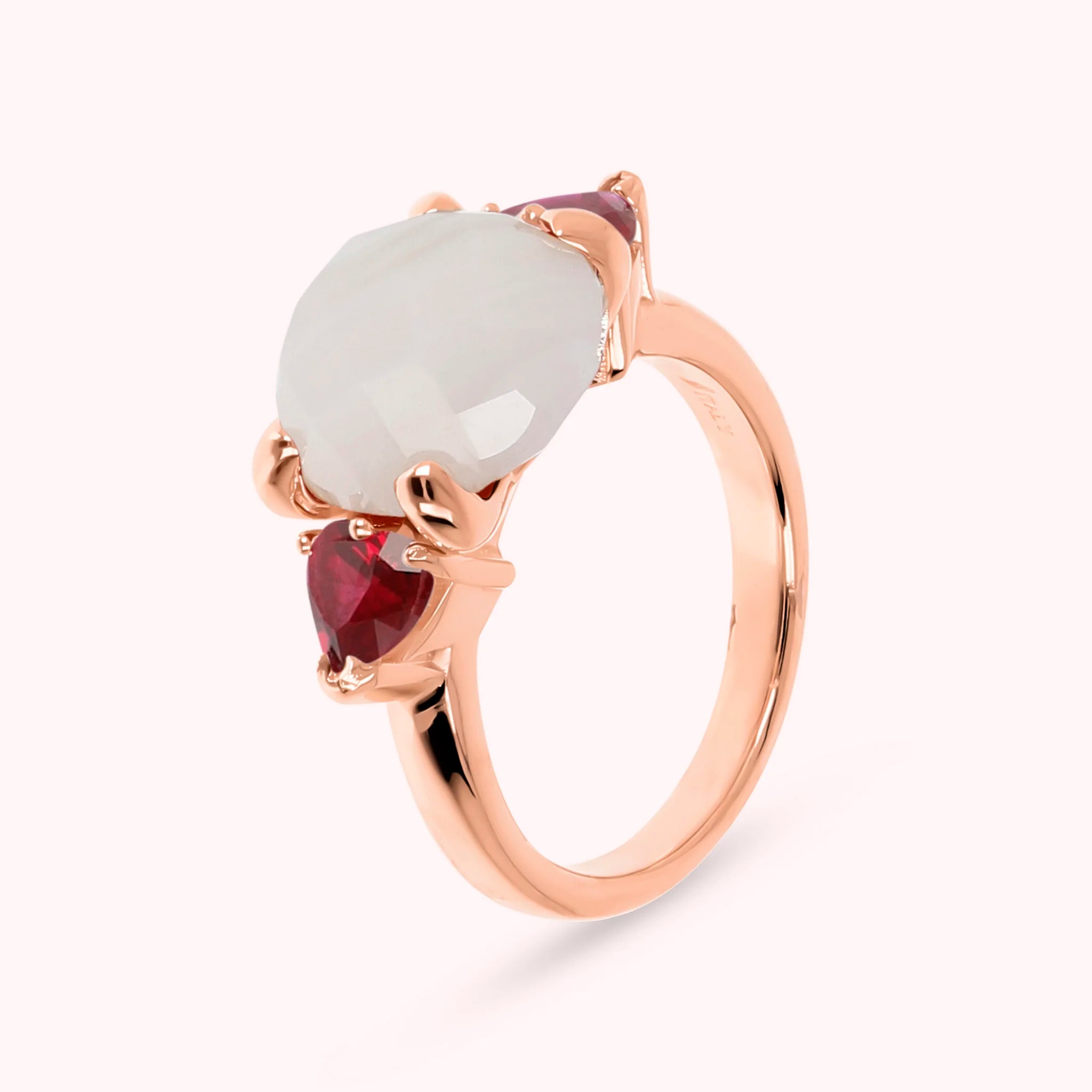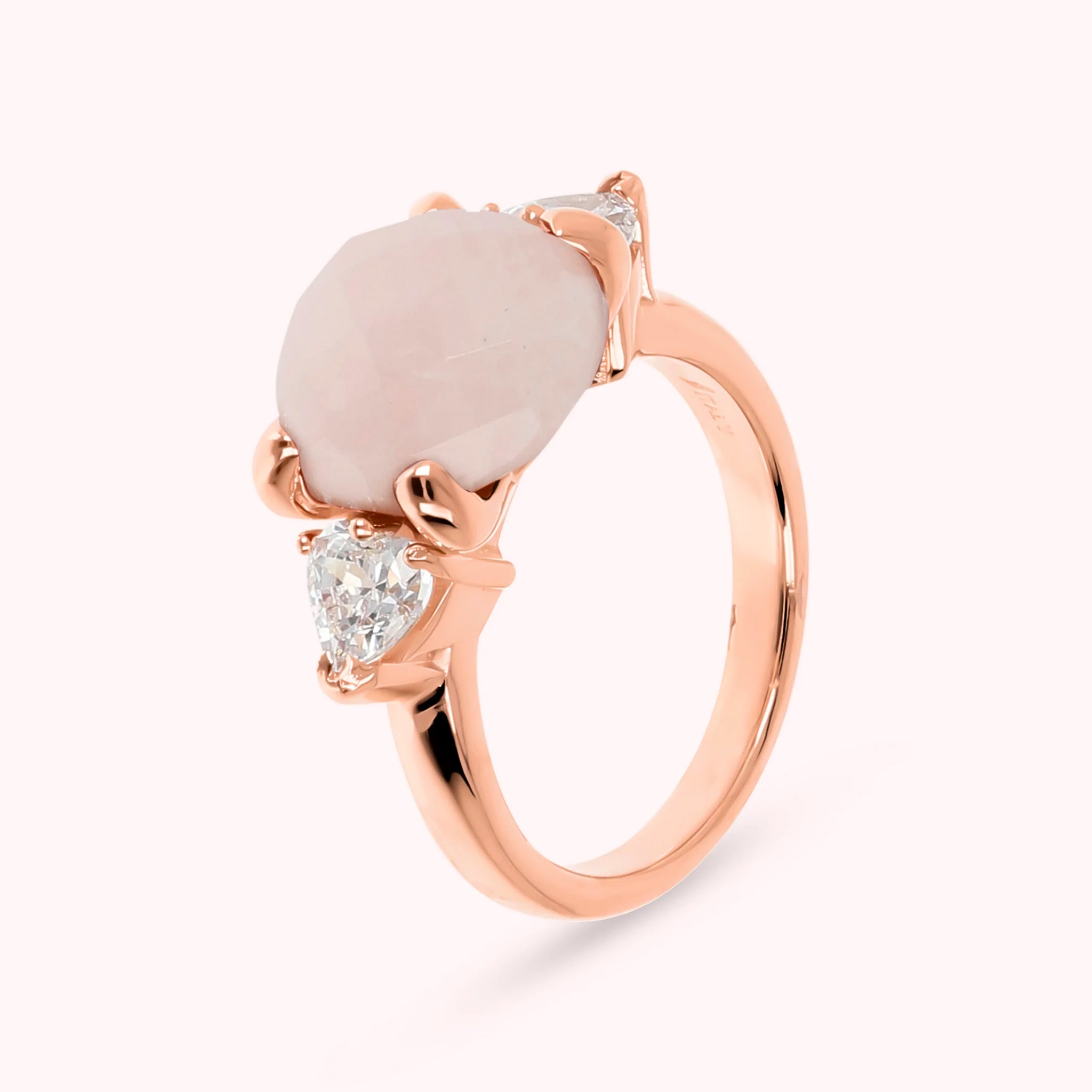 Anello cocktail Bronzallure realizzato in lega Golden Rosé, placcato oro rosa 18kt, impreziosito da una pietra naturale centrale dalla forma tonda (12 mm) e da due cuori laterali (5x5 mm) in cubic zirconia, qualità luminosa.