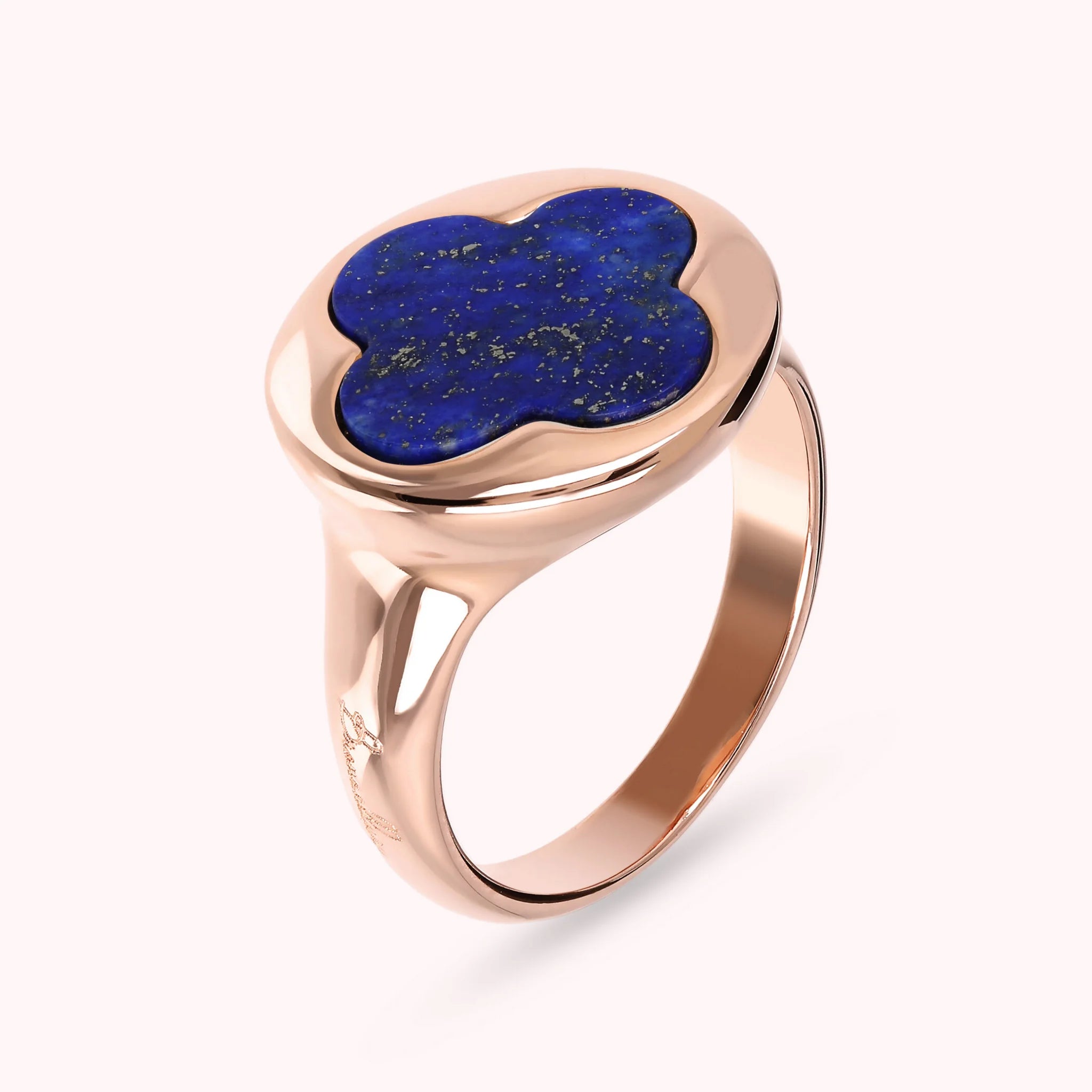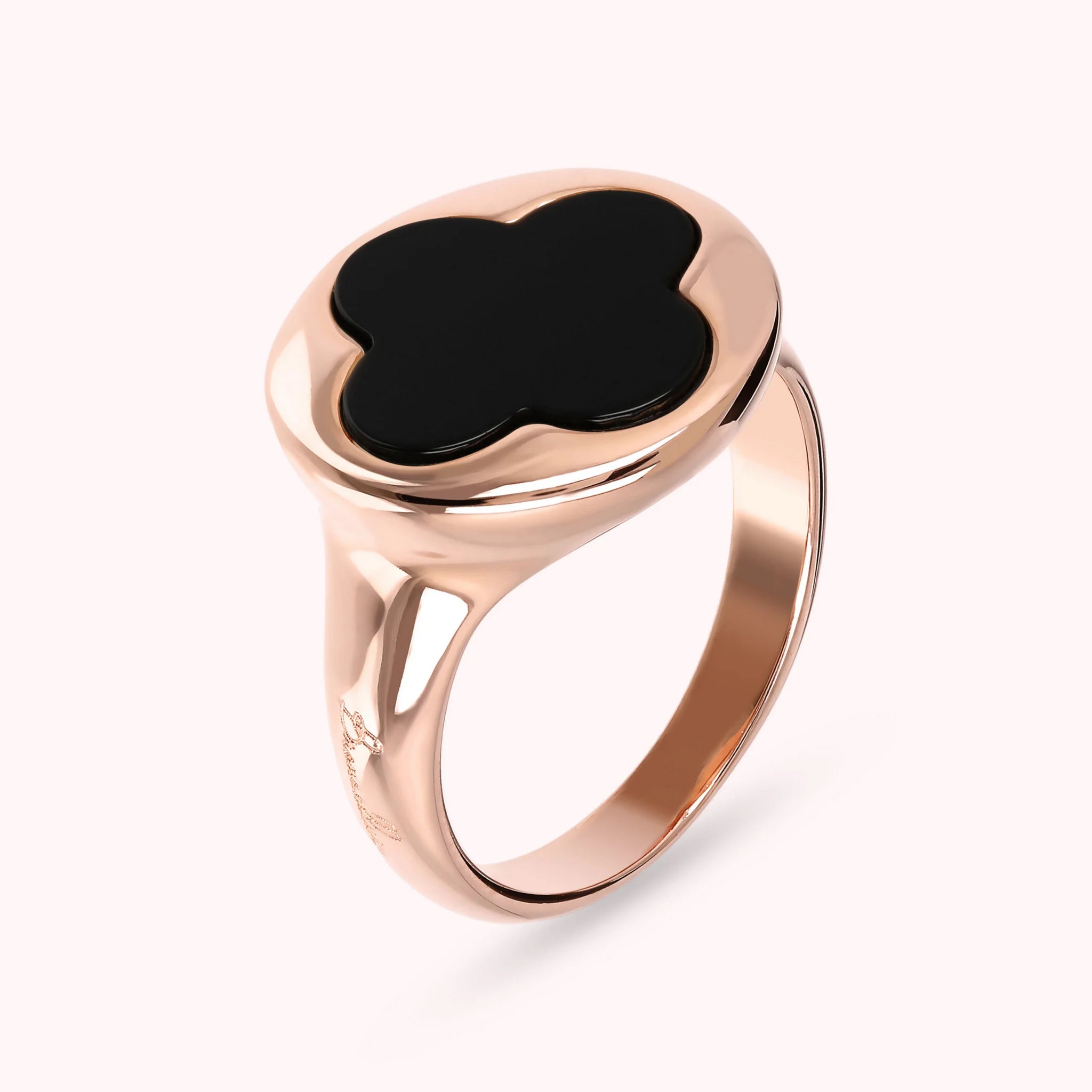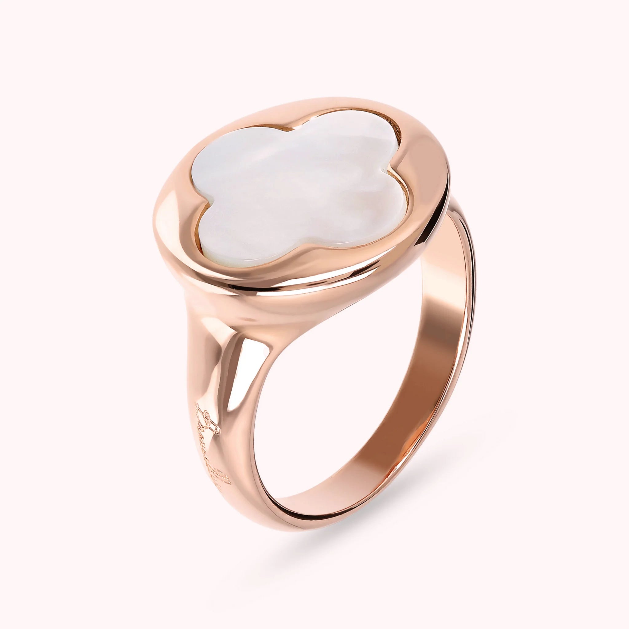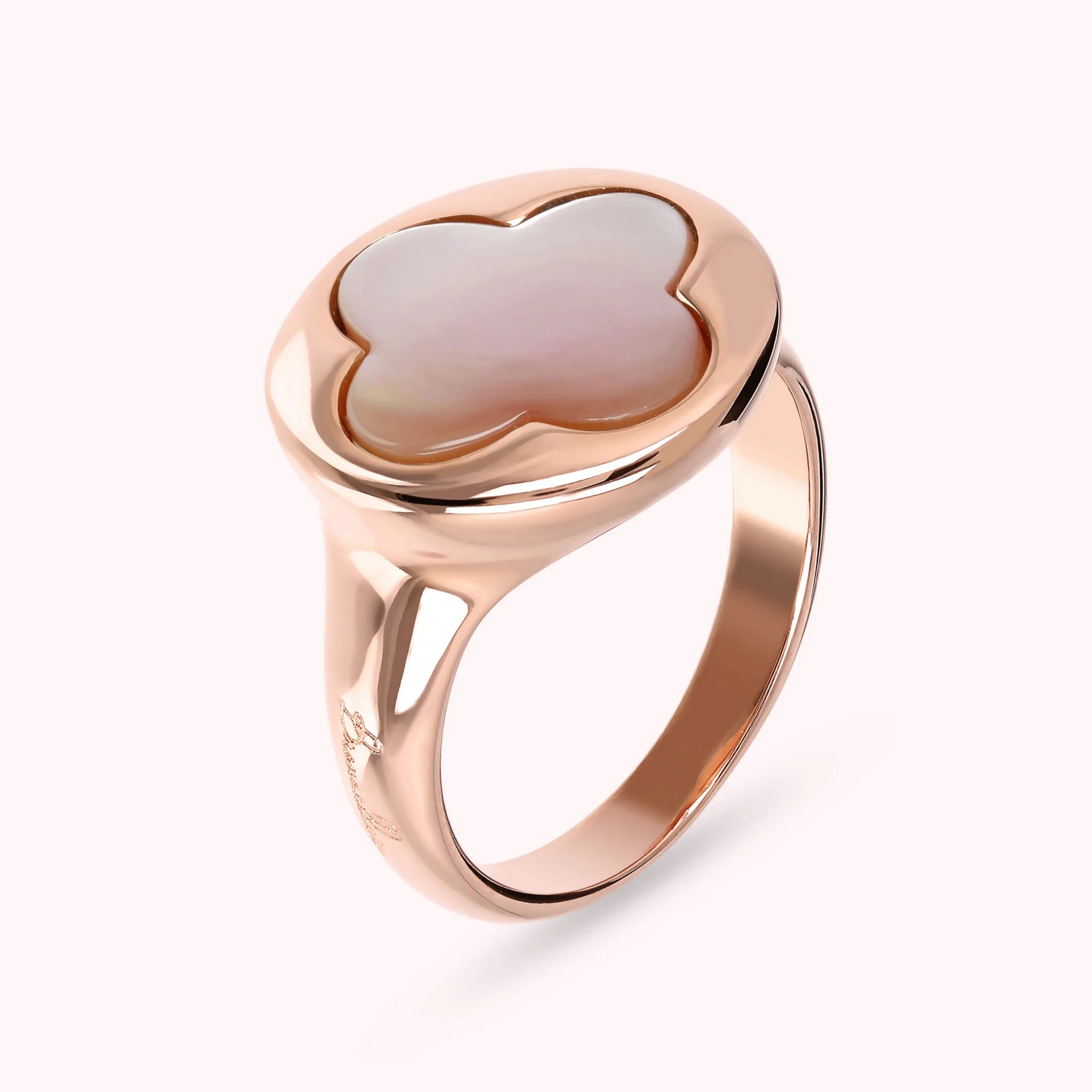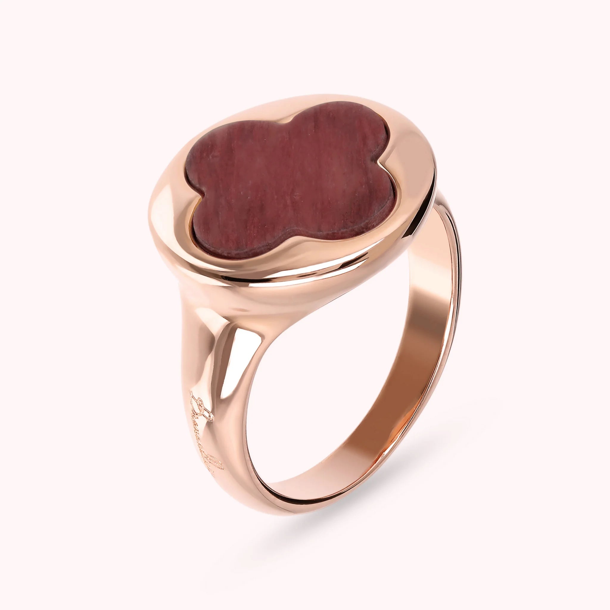 Anello cocktail Bronzallure realizzato in lega Golden Rosé, placcato oro rosa 18kt, impreziosito da un tondo (15 mm) con quadrifoglio in pietra naturale dalla superficie liscia.