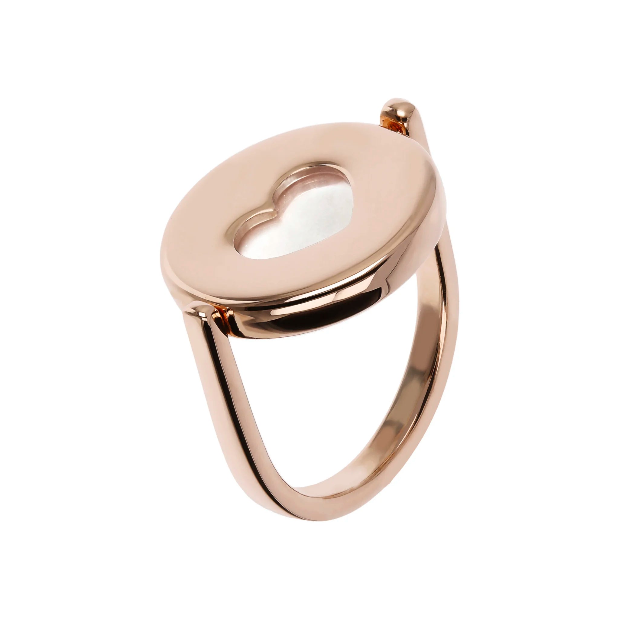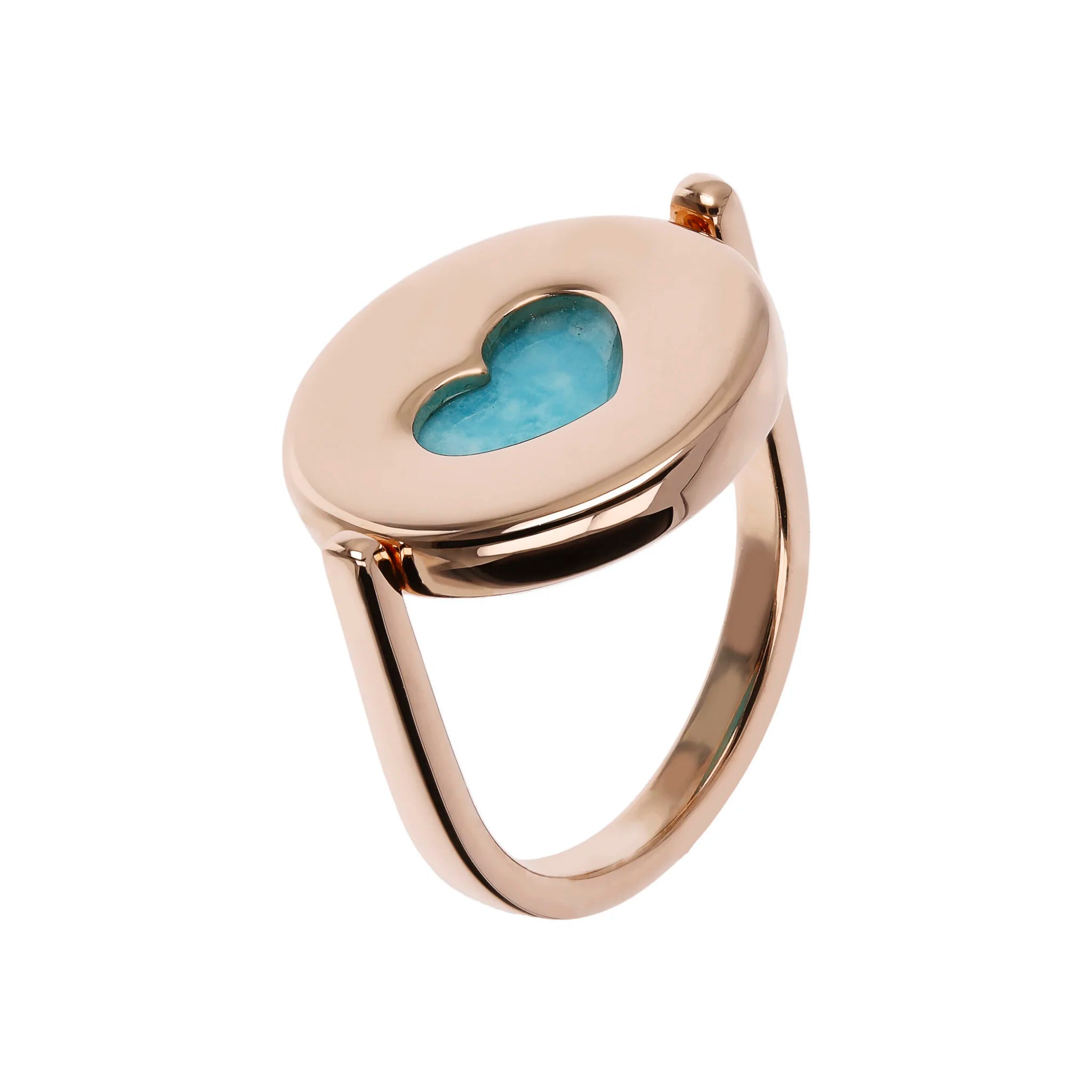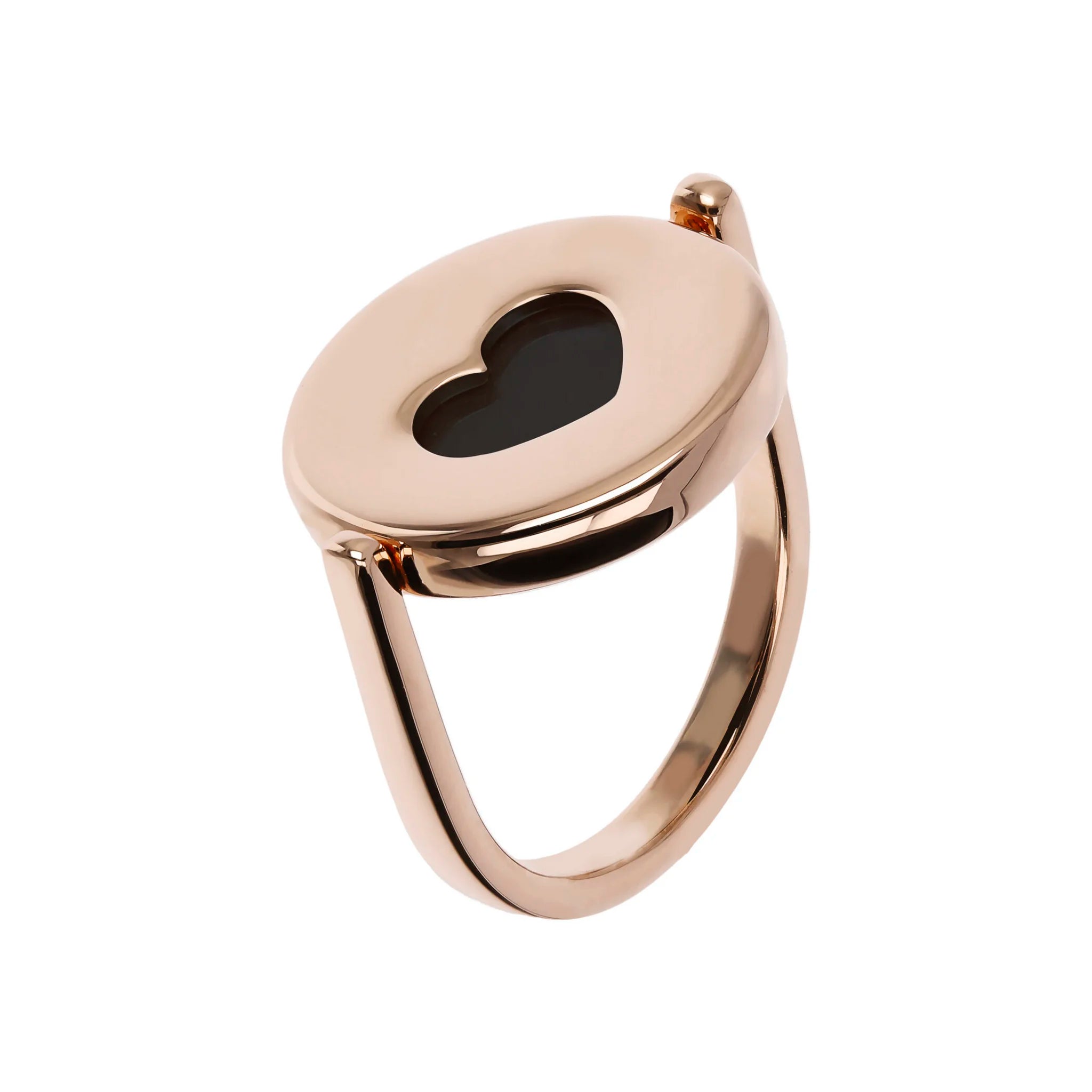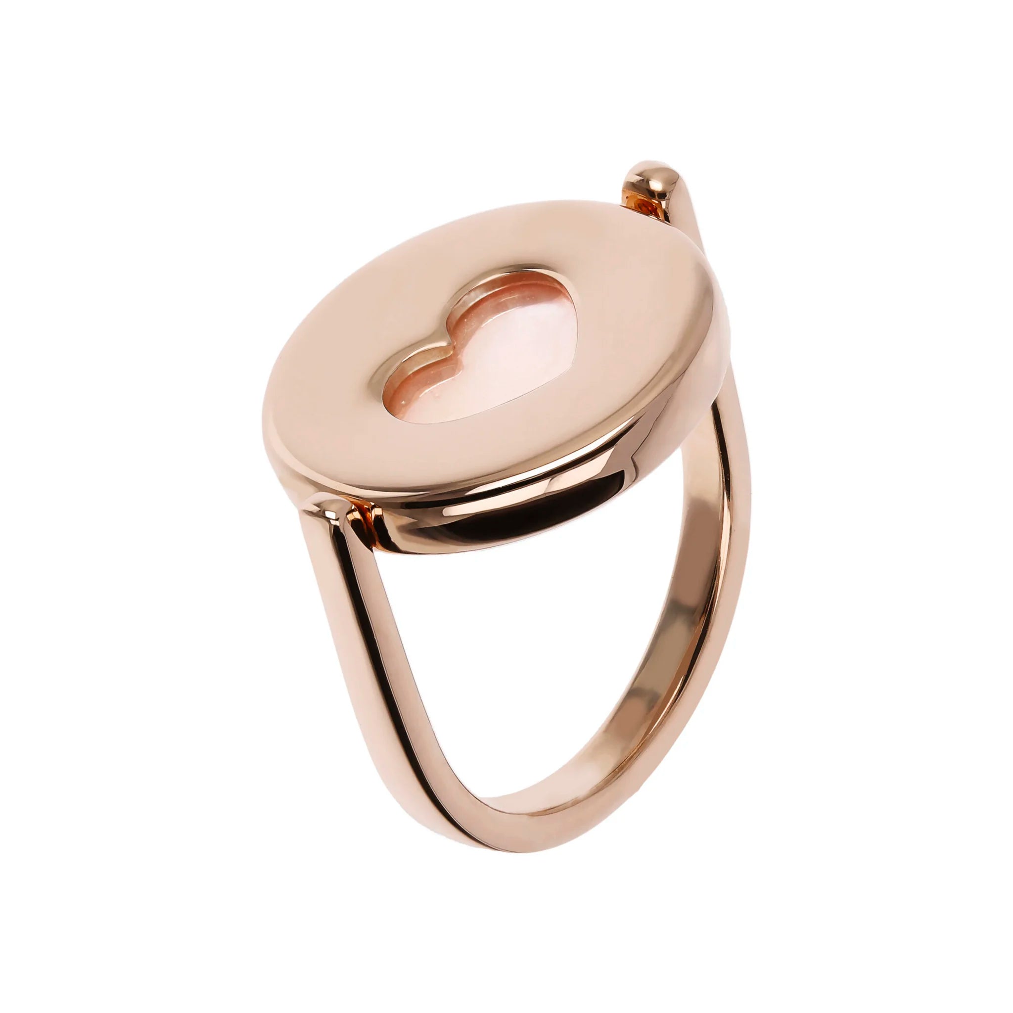 Anello cocktail girevole Bronzallure realizzato in lega Golden Rosé, placcato oro rosa 18kt, impreziosito da un lato da un tondo in pietra naturale e dall'altro da un elemento a forma di cuore traforato.