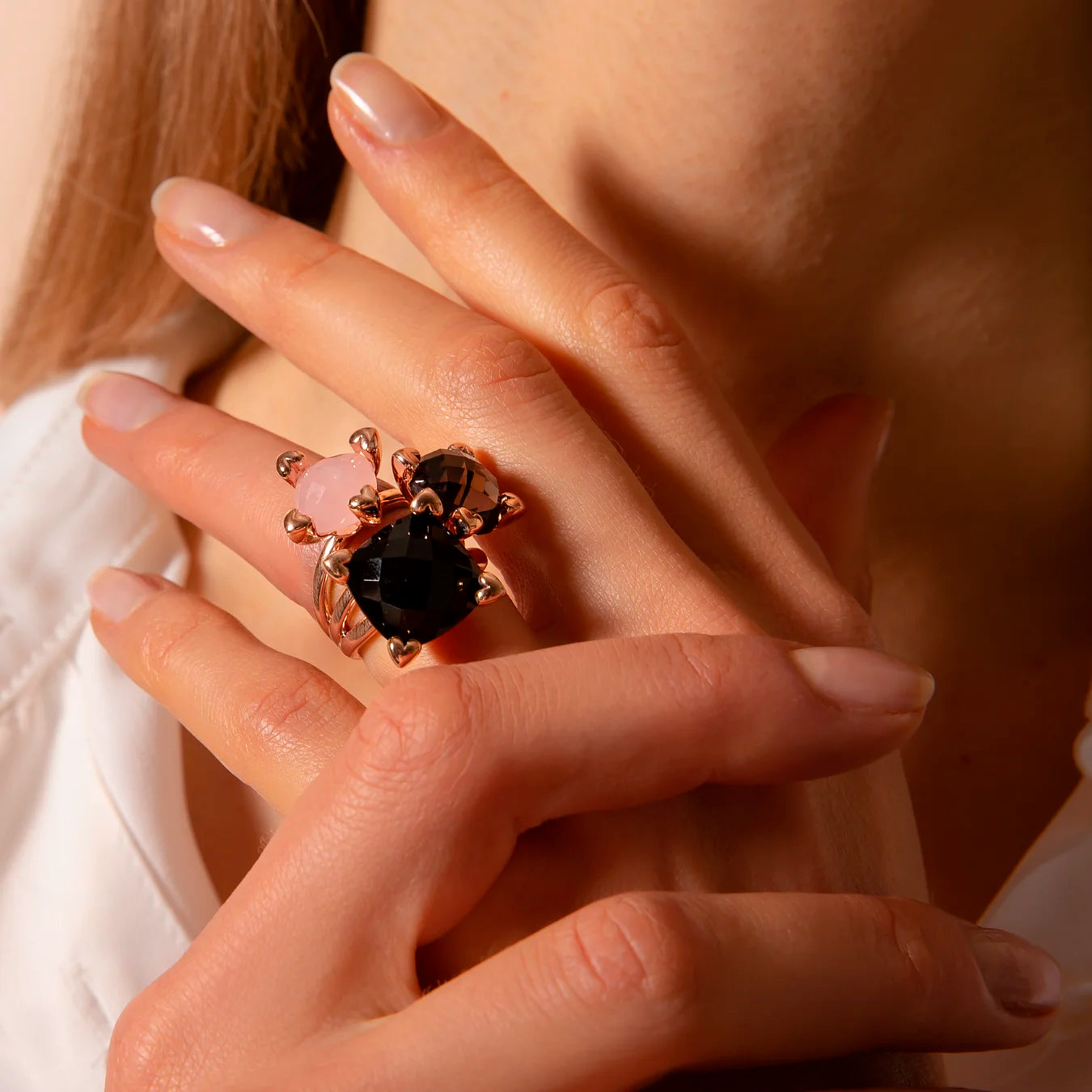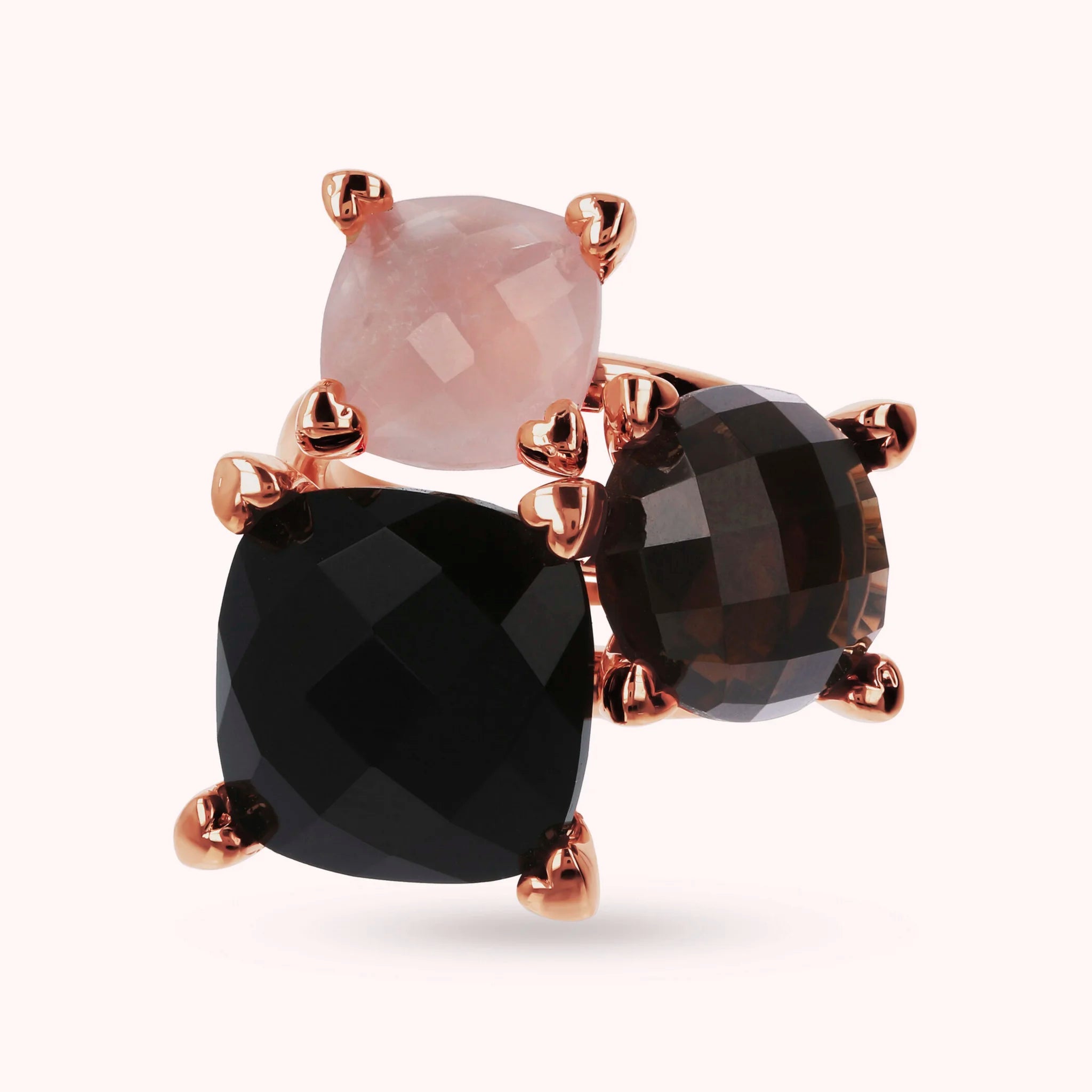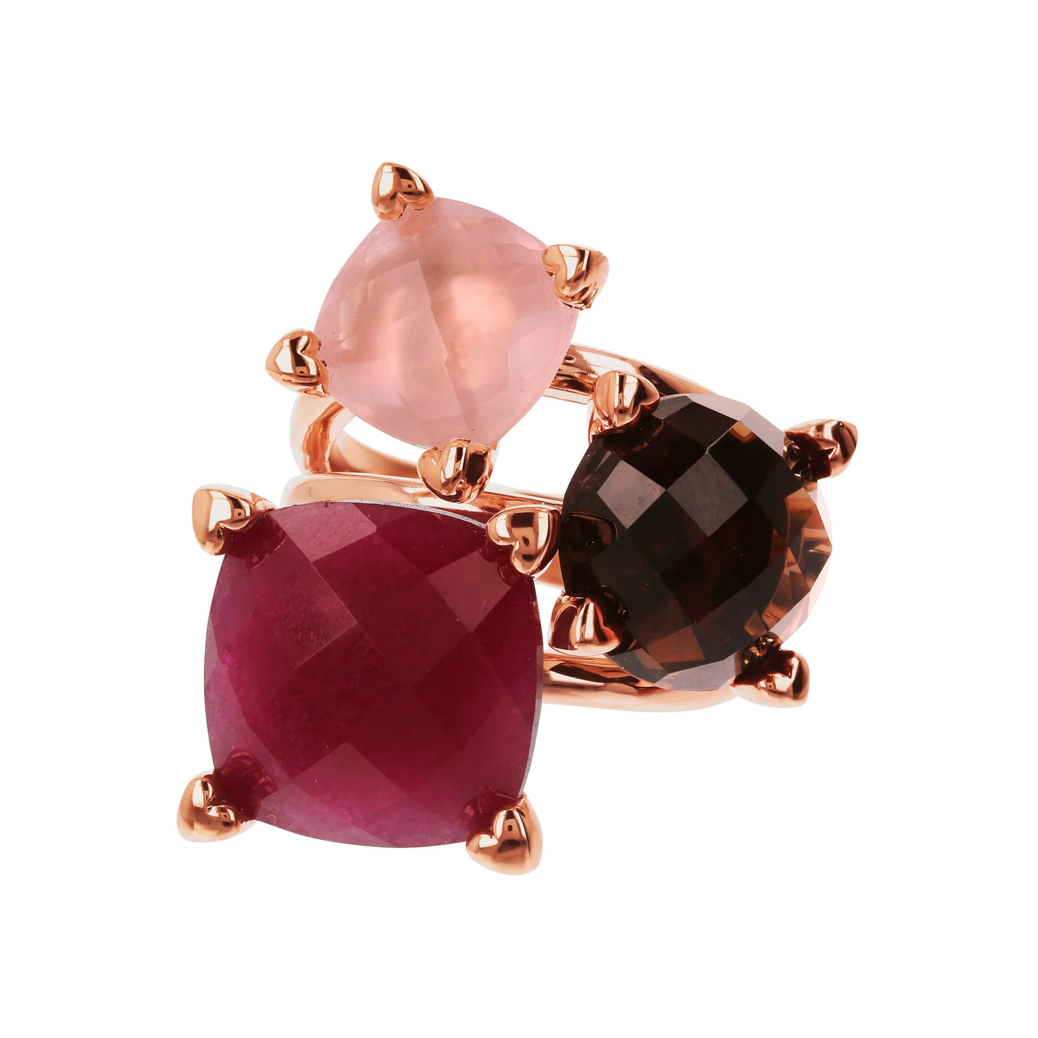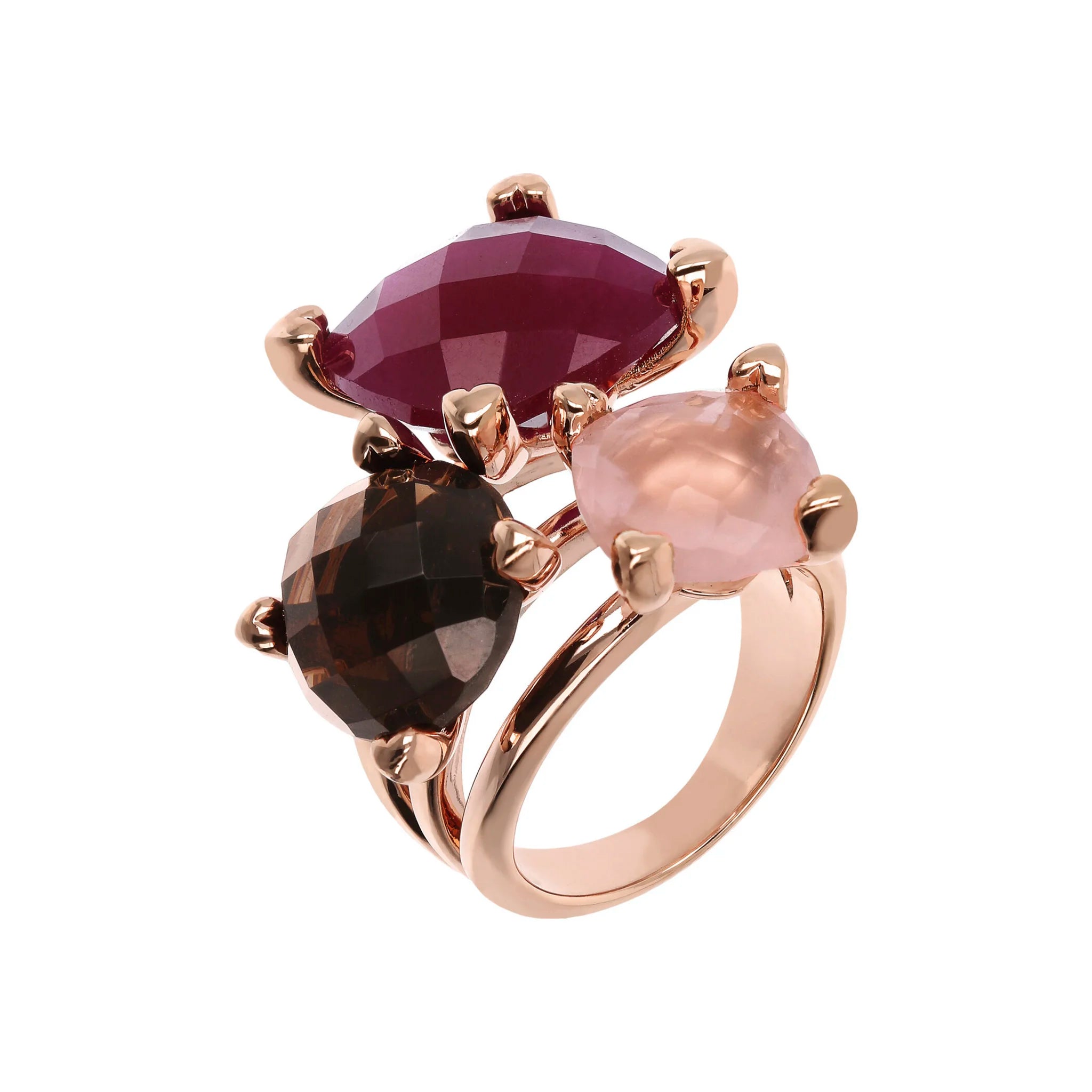 Anello trilogy multi-filo Bronzallure realizzato in lega Golden Rosé, placcato oro rosa 18kt, con castoni a forma di cuore e impreziosito da tre pietre naturali (10/12/14 mm) dai colori luminosi e dalla superficie sfaccettata.
