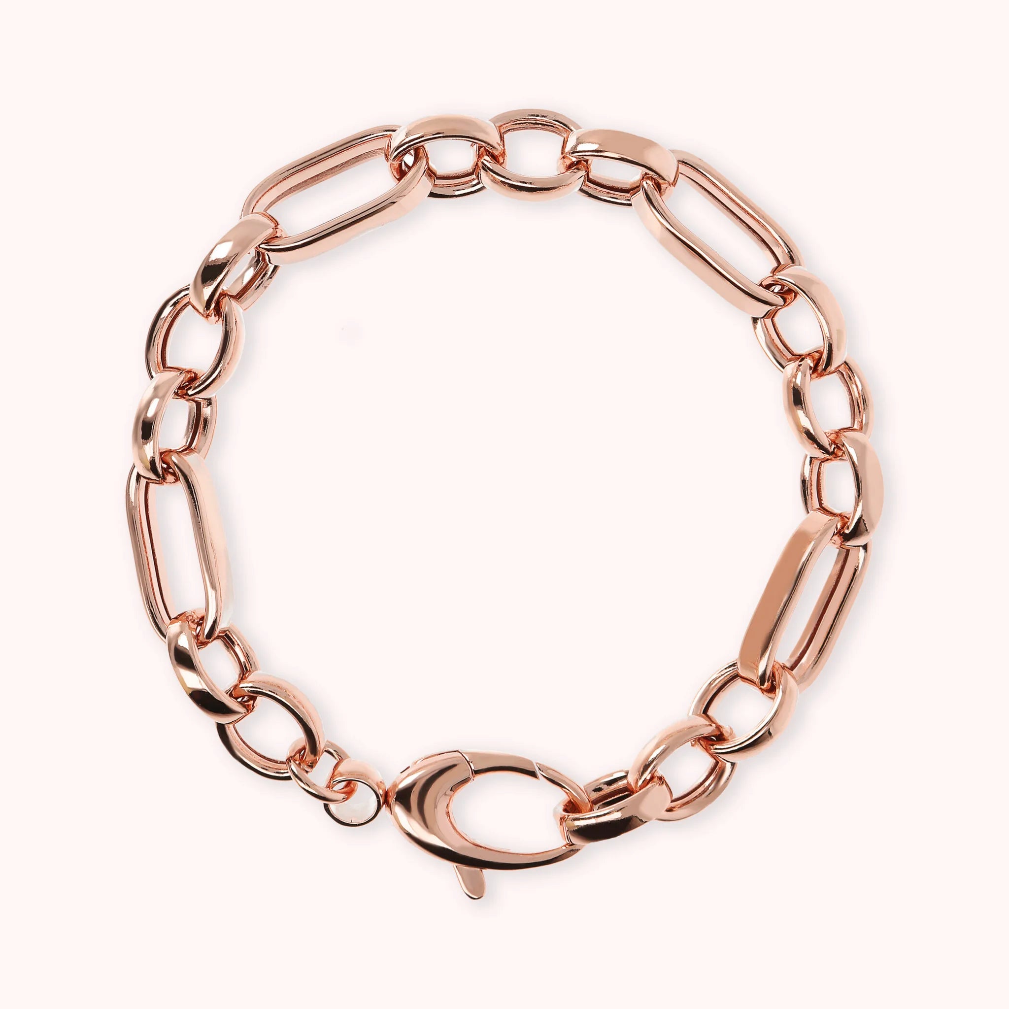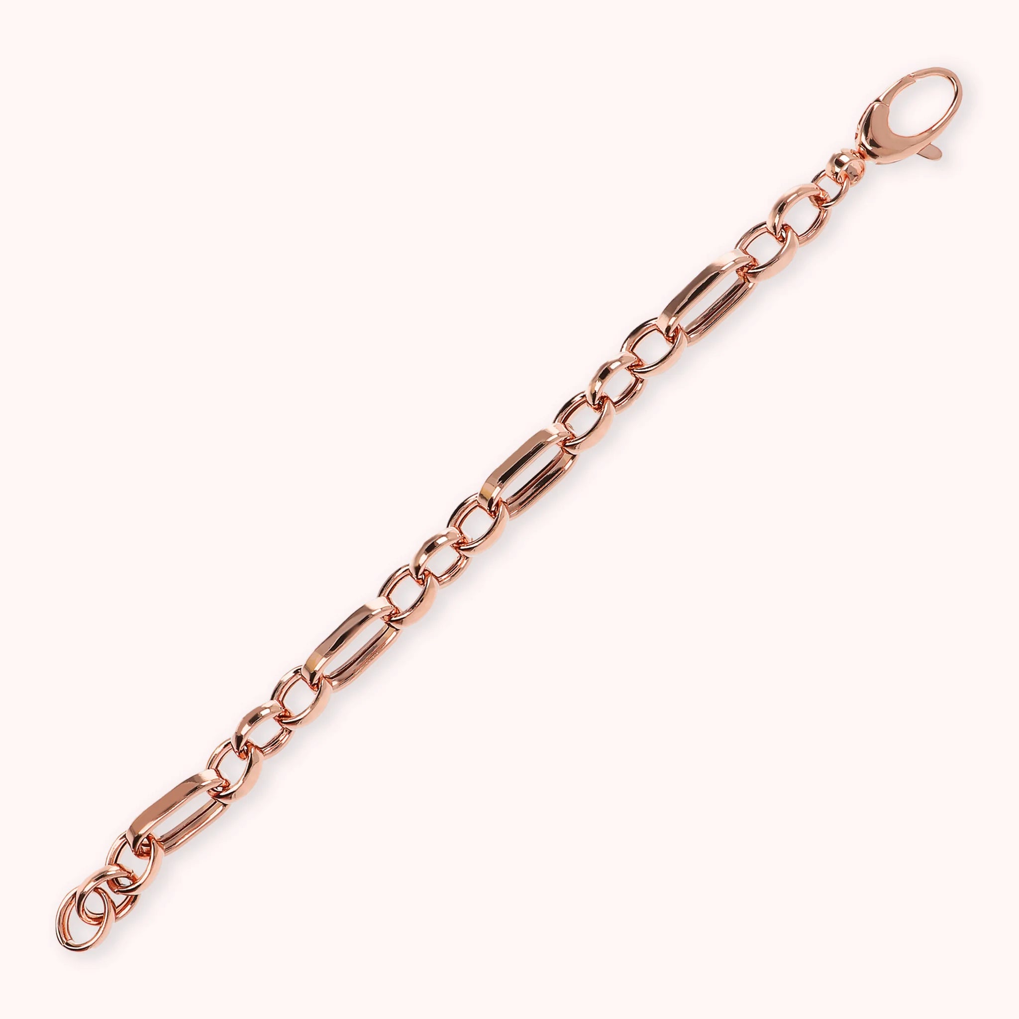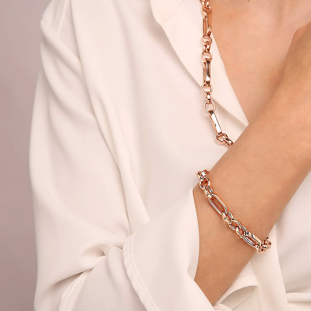 Bracciale realizzato in lega Golden Rosé, placcato oro rosa 18kt, impreziosito da catena rolo alternata 3+1; chiusura a moschettone.