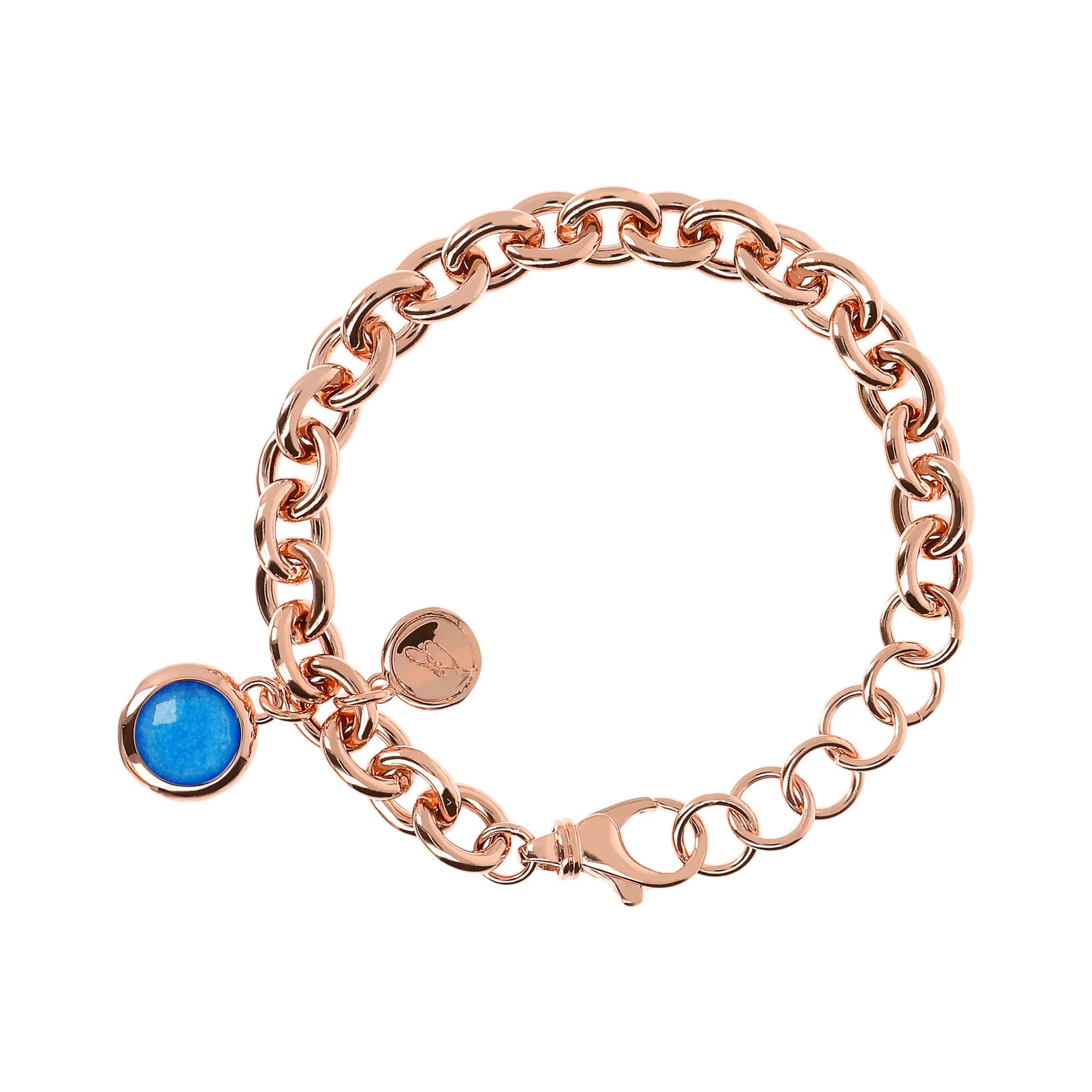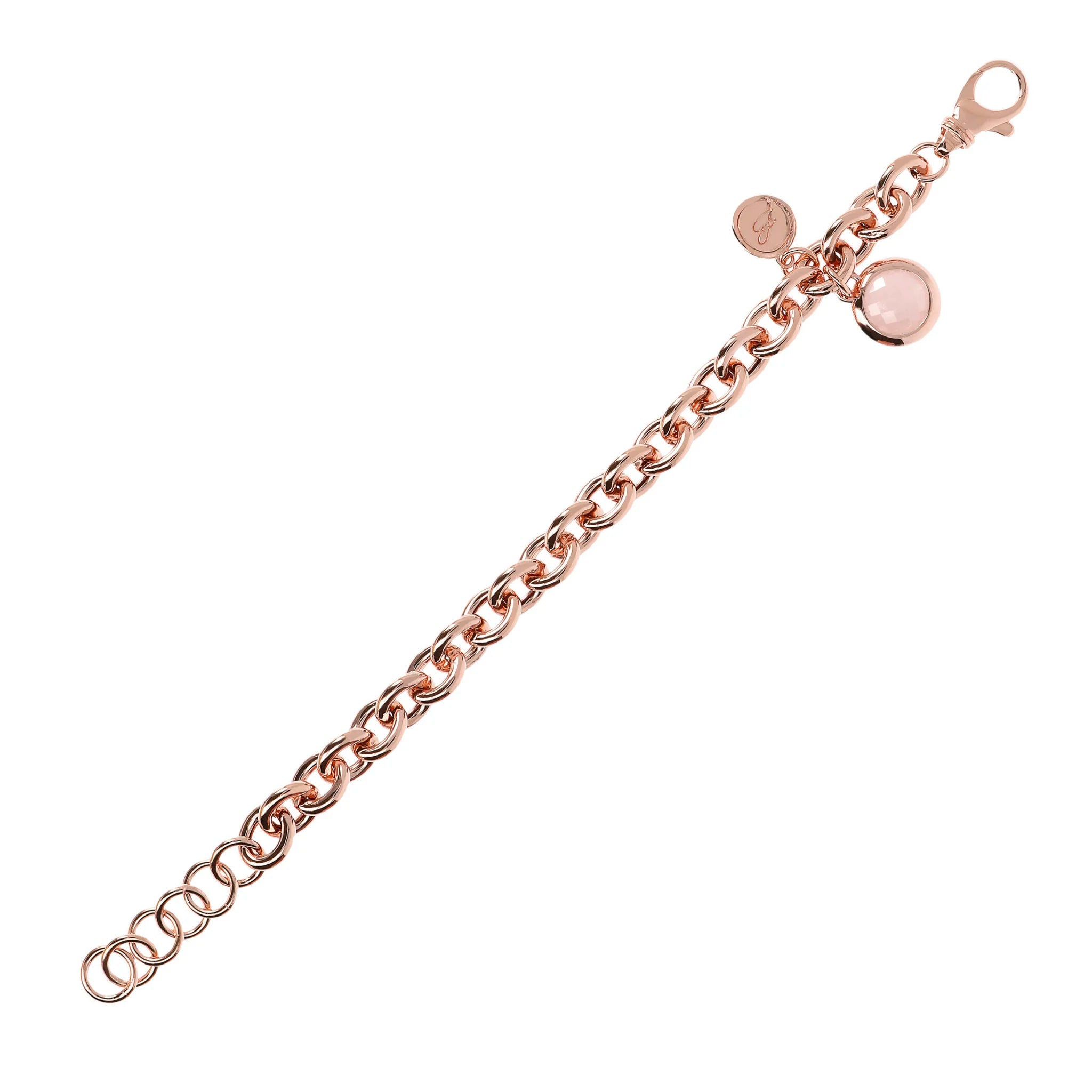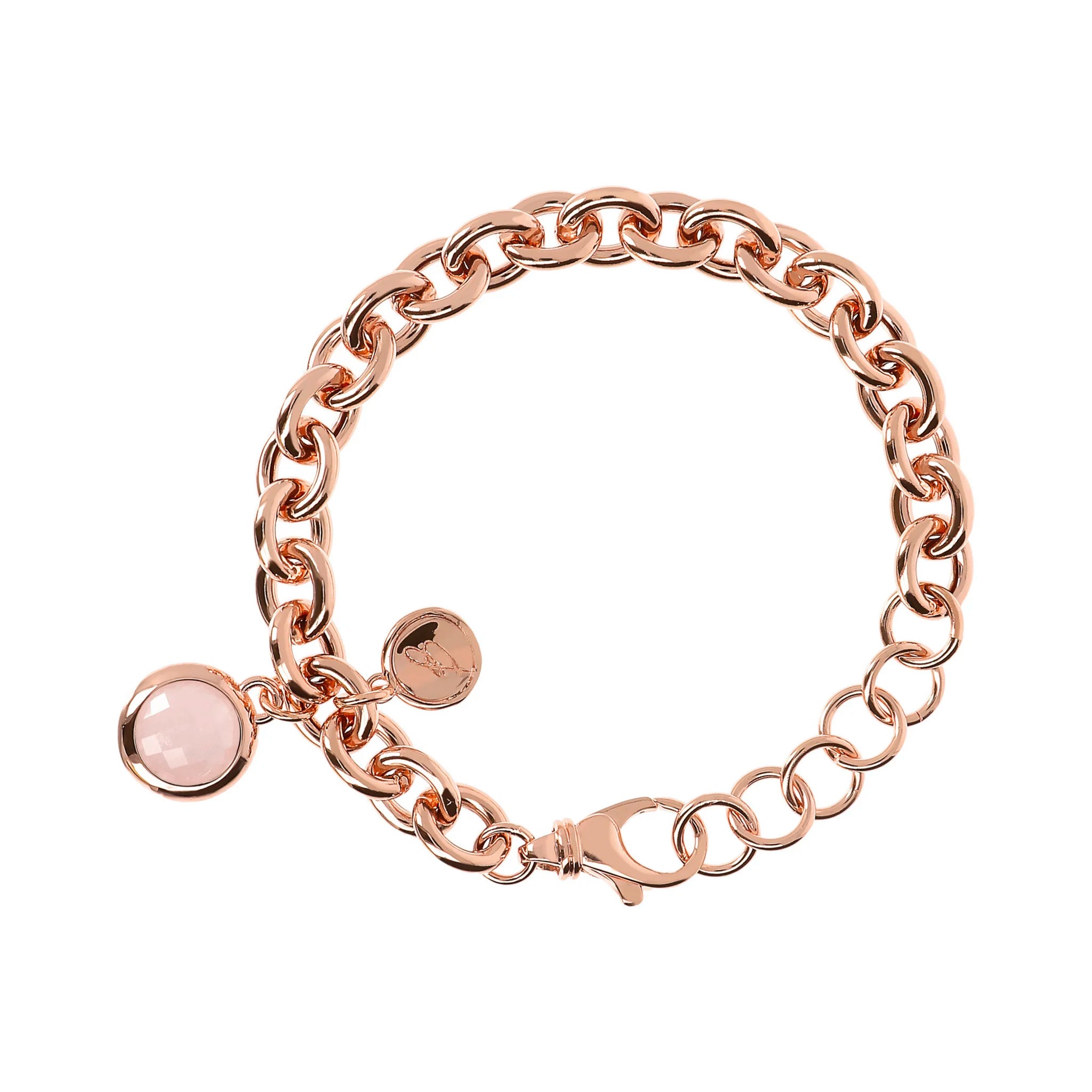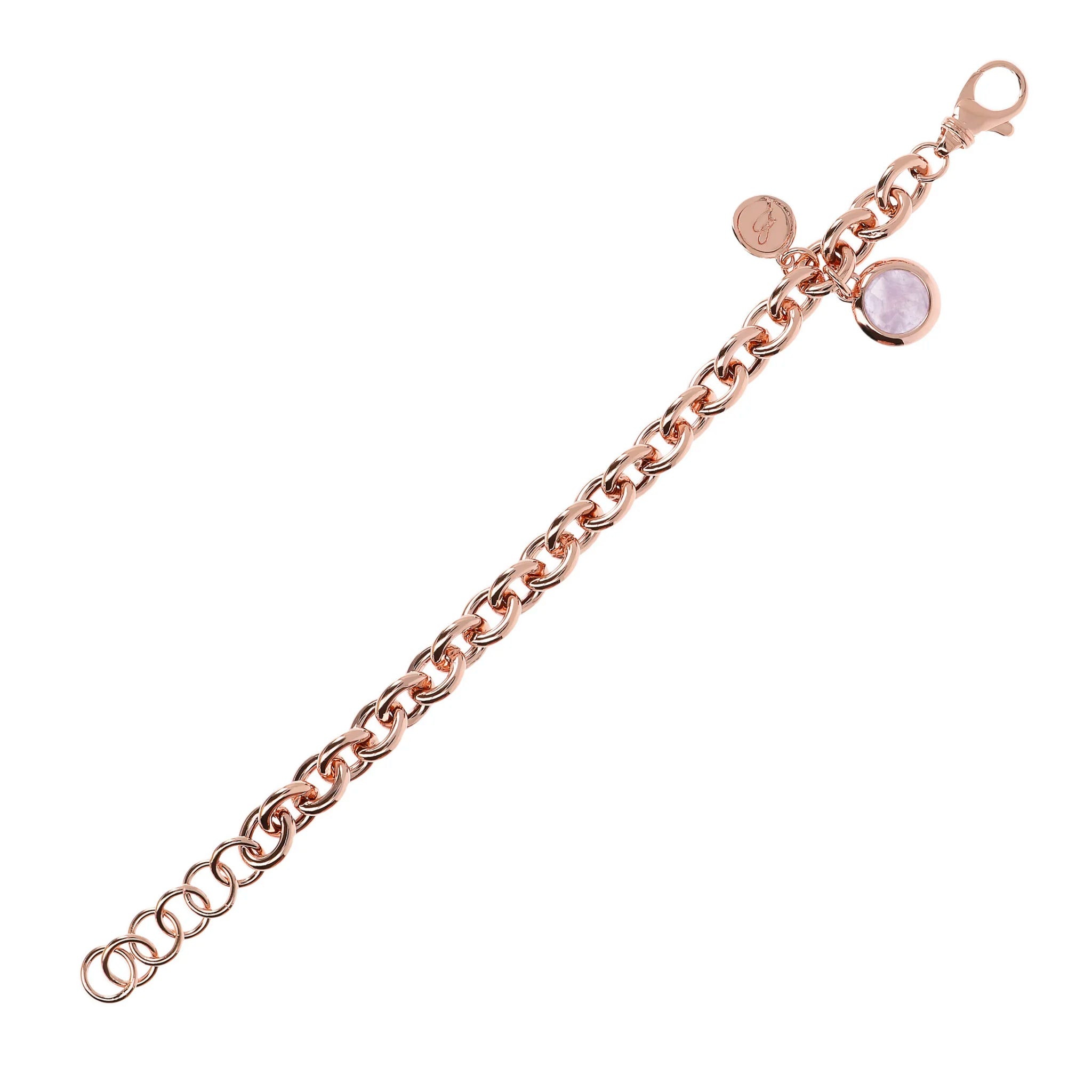 Bracciale Bronzallure realizzato in lega Golden Rosé, placcato oro rosa 18kt, impreziosito da catena rolo e ciondolo in pietra naturale tonda (12 mm); chiusura a moschettone ed extender.