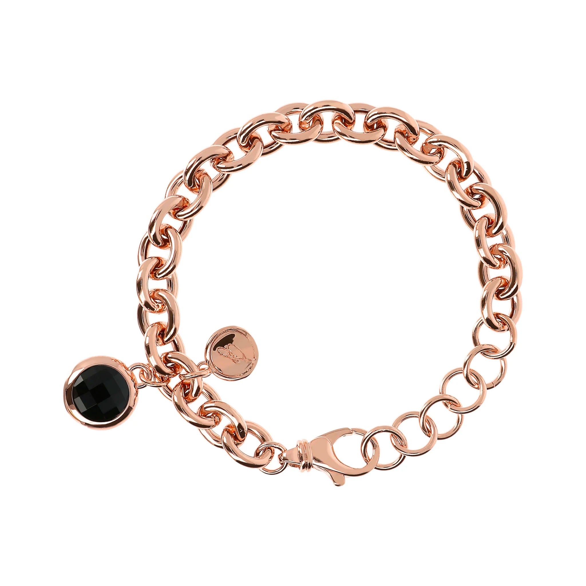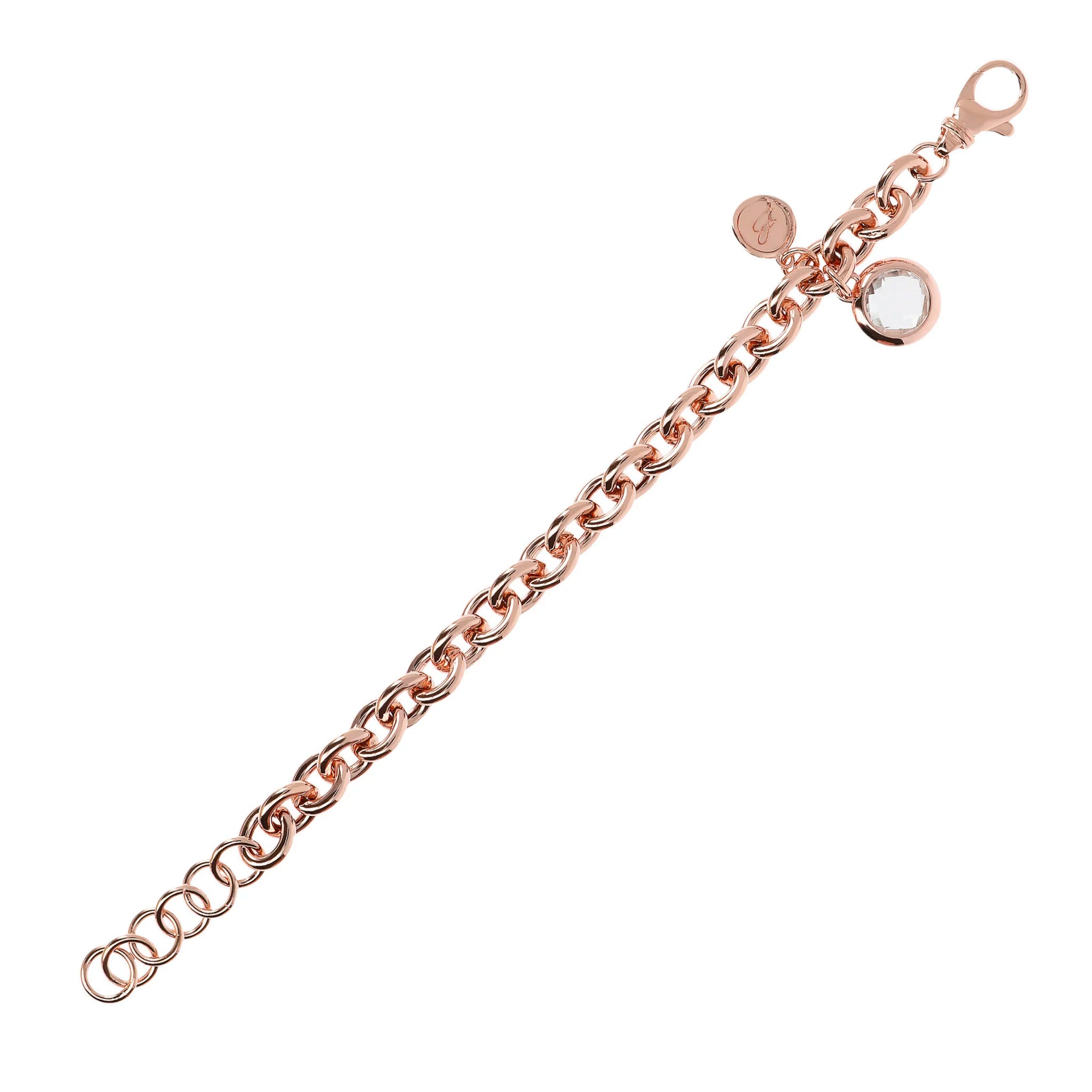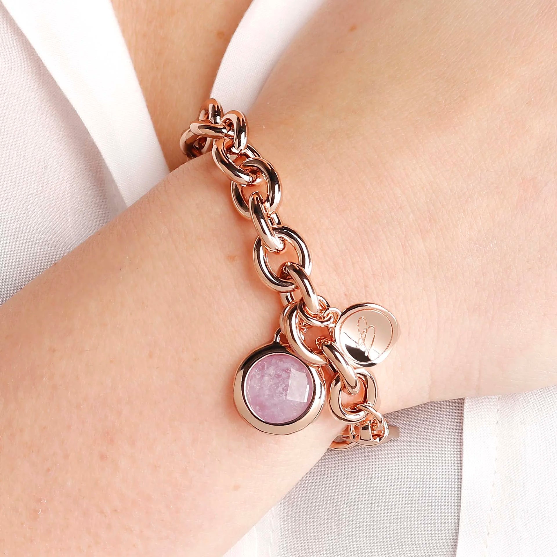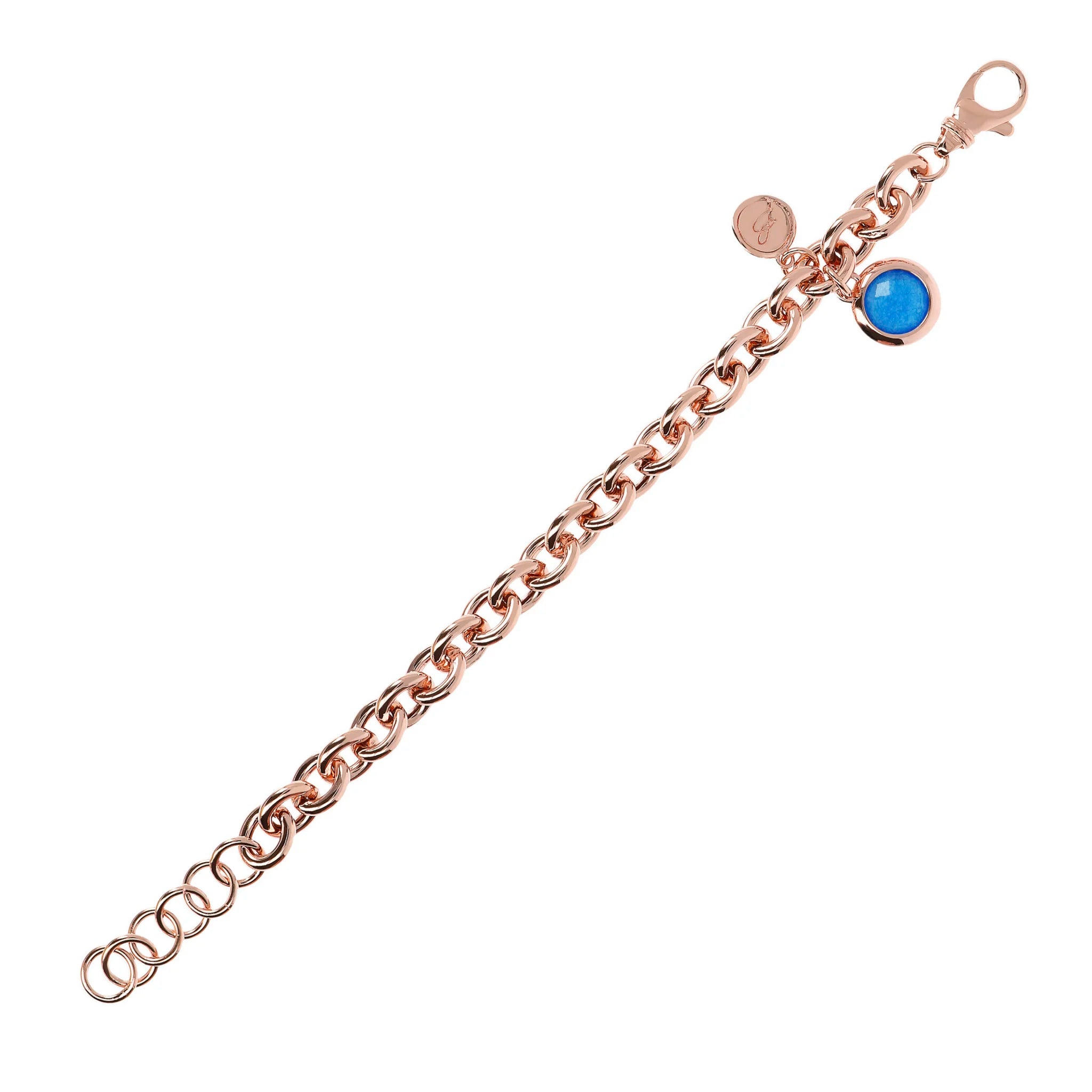 Bracciale Bronzallure realizzato in lega Golden Rosé, placcato oro rosa 18kt, impreziosito da catena rolo e ciondolo in pietra naturale tonda (12 mm); chiusura a moschettone ed extender.