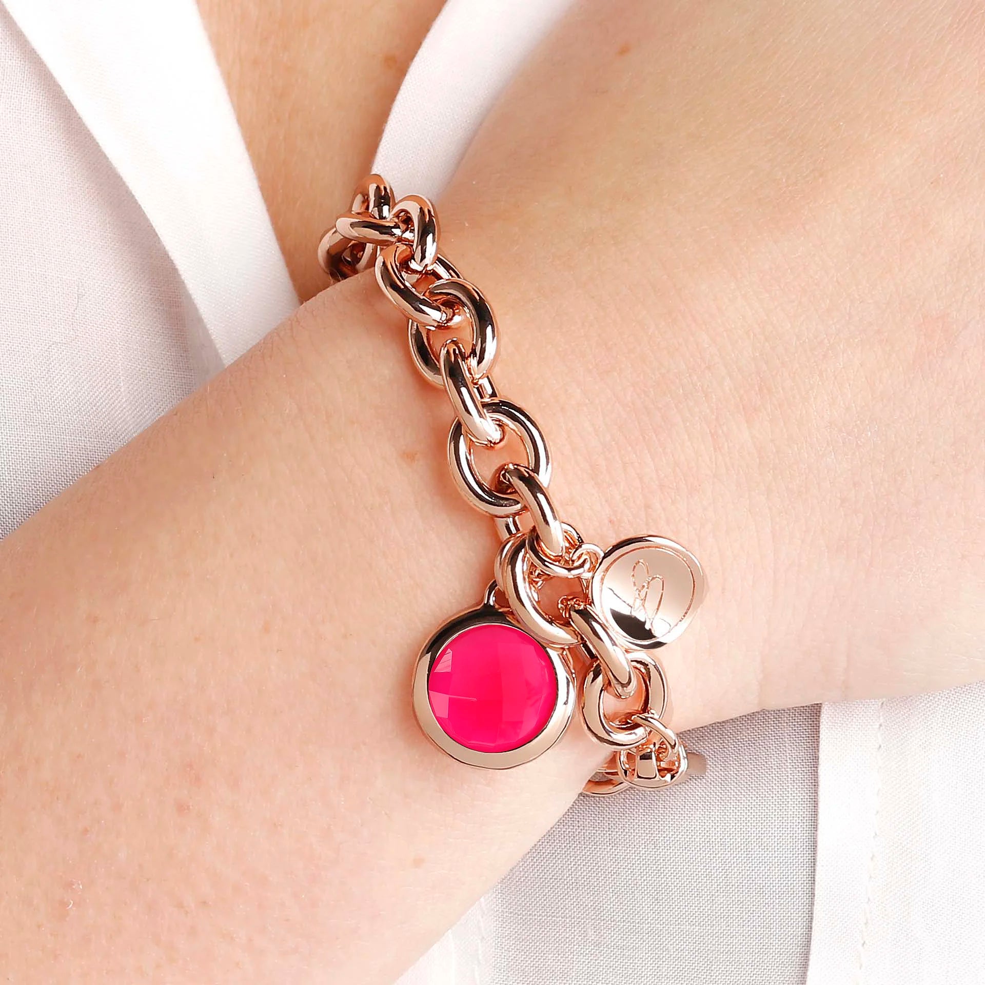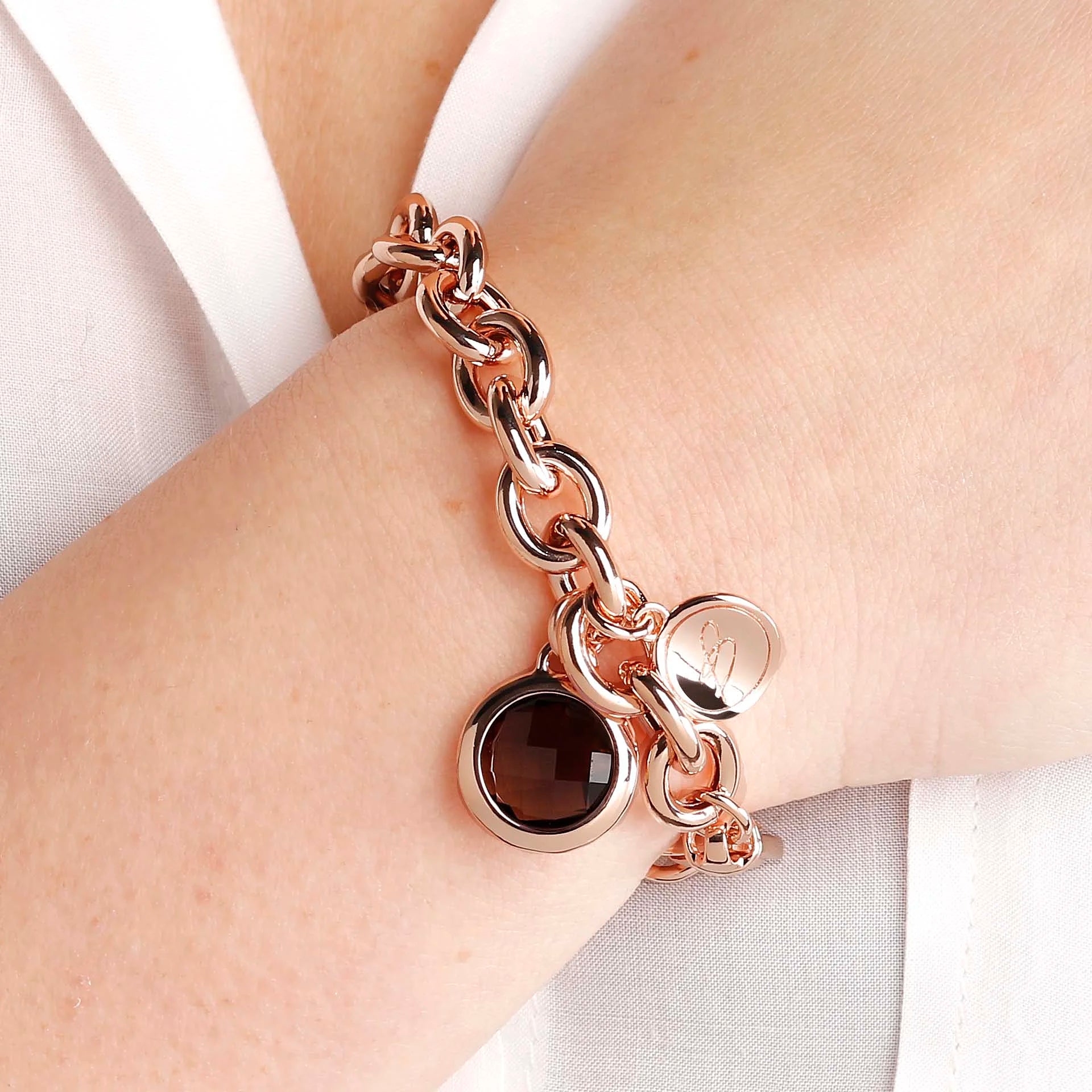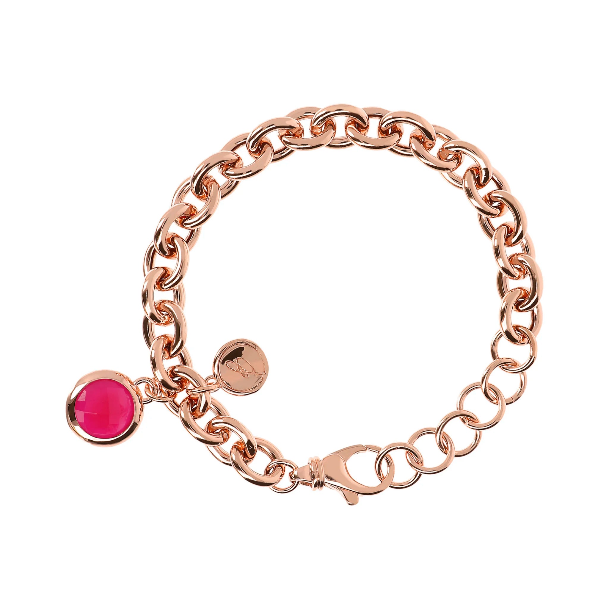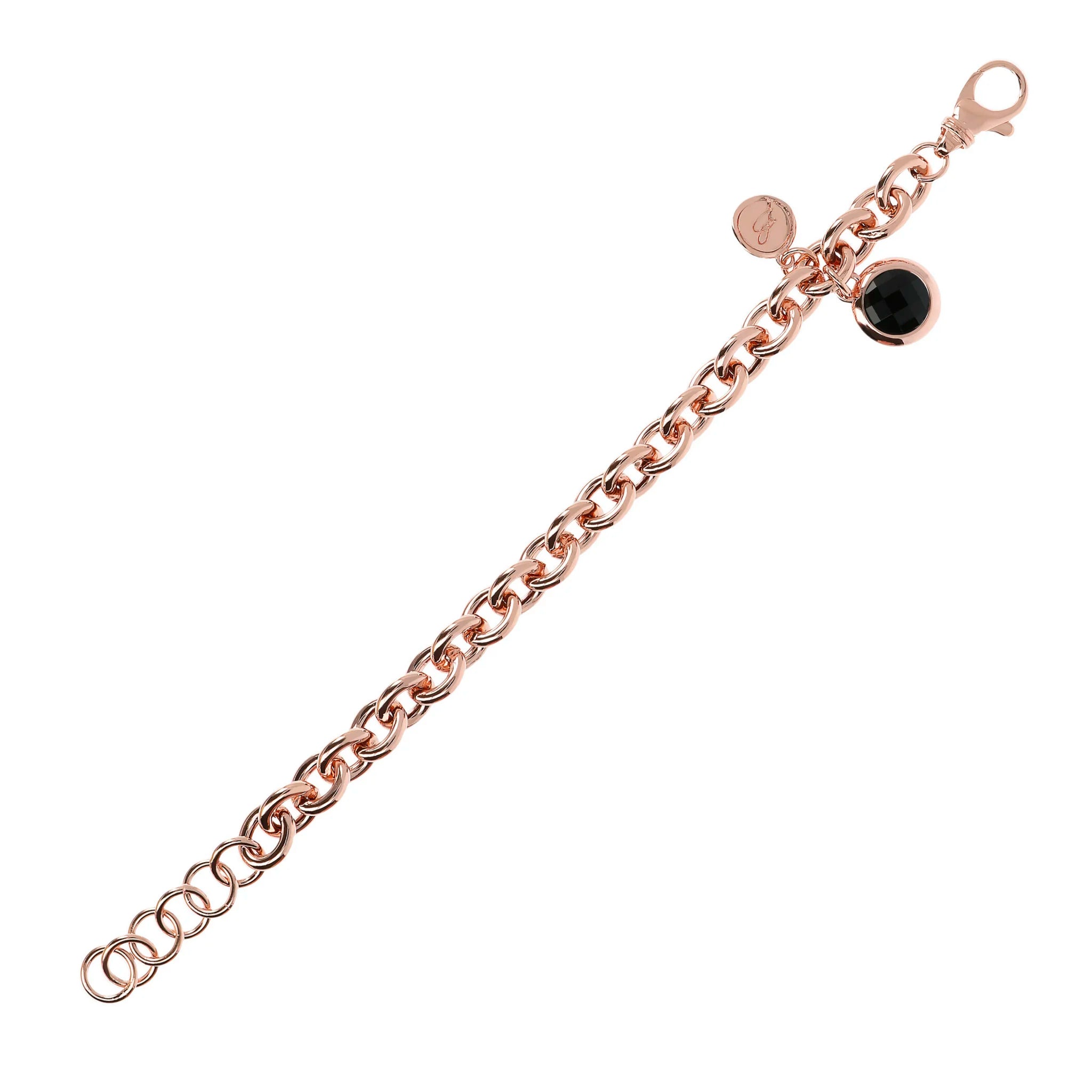 Bracciale Bronzallure realizzato in lega Golden Rosé, placcato oro rosa 18kt, impreziosito da catena rolo e ciondolo in pietra naturale tonda (12 mm); chiusura a moschettone ed extender.