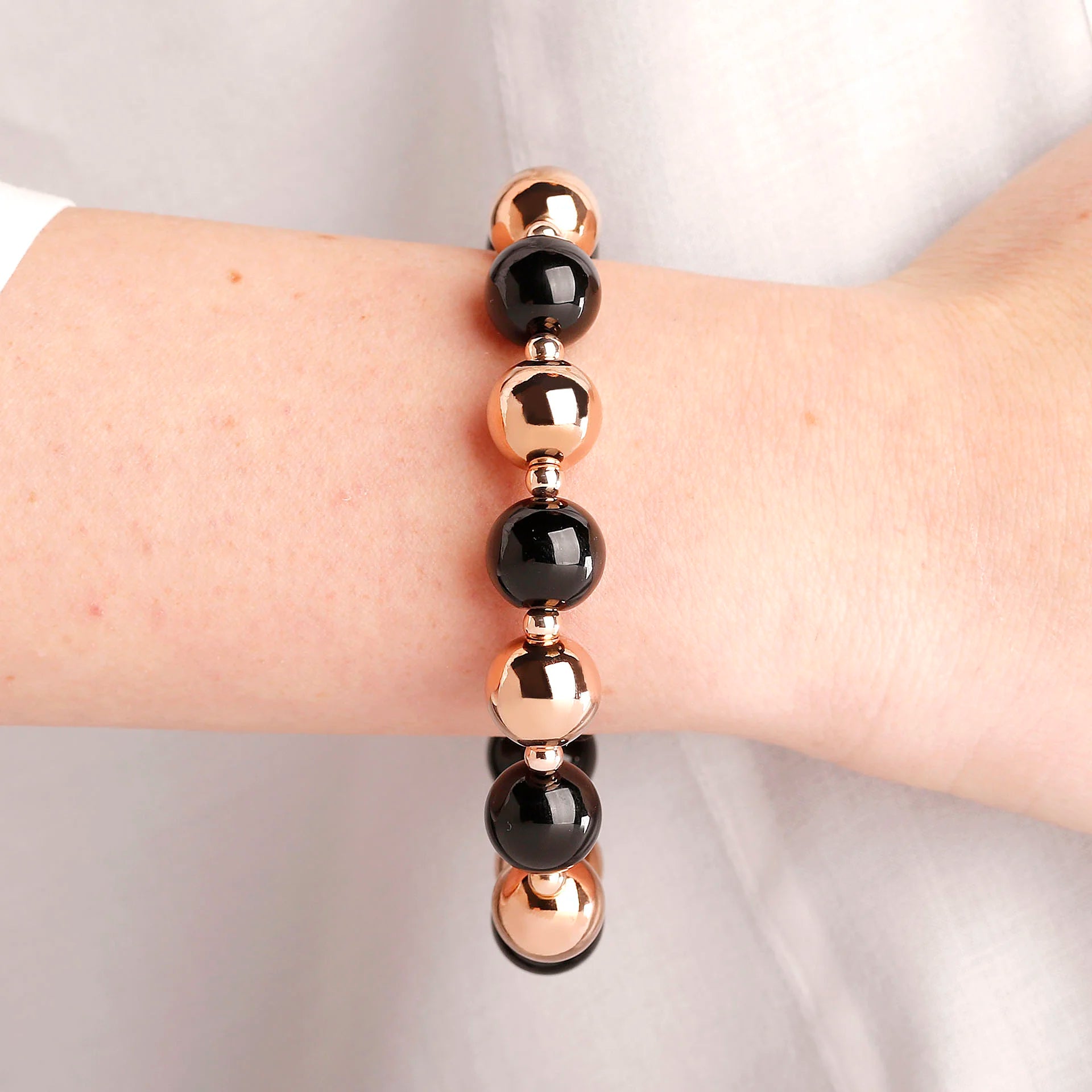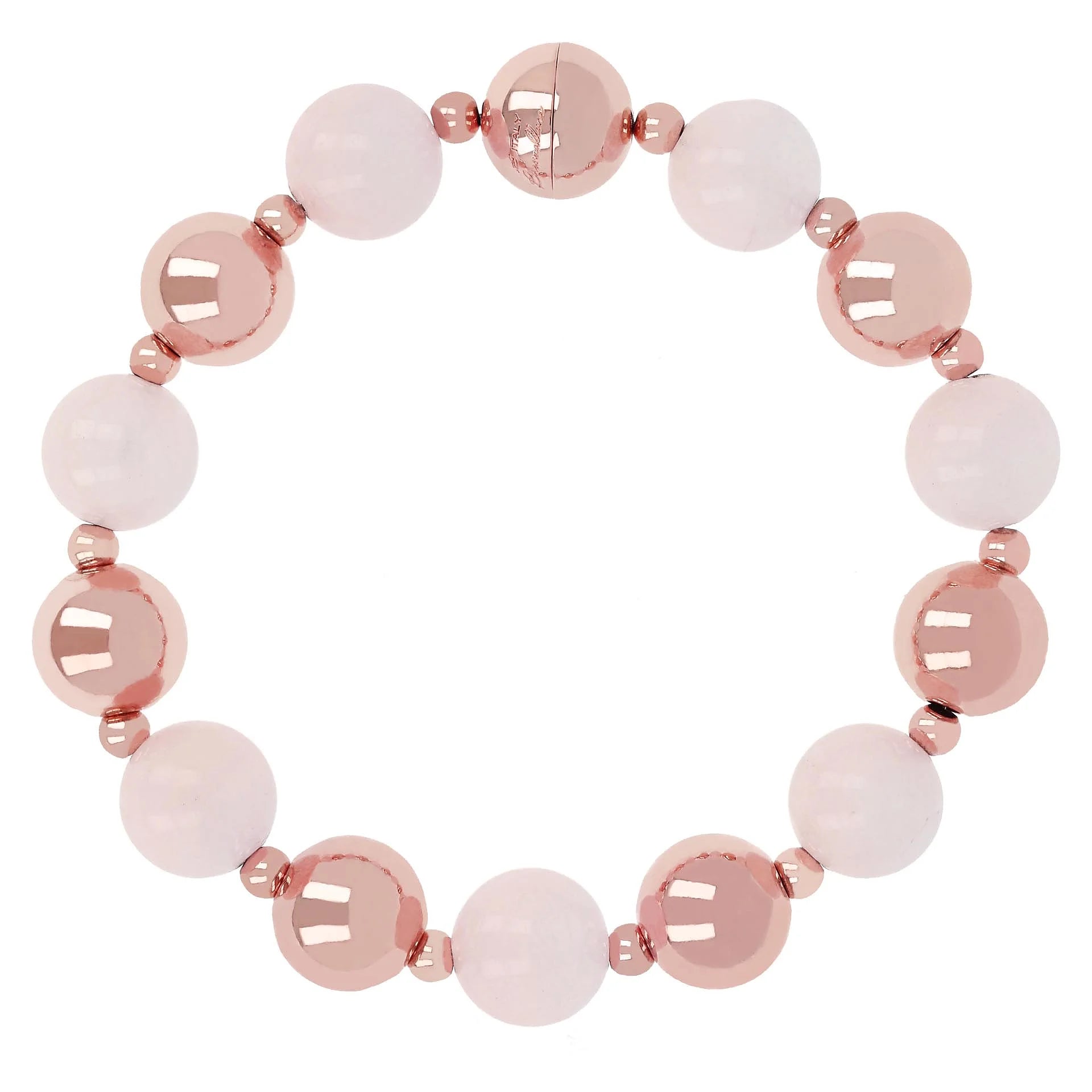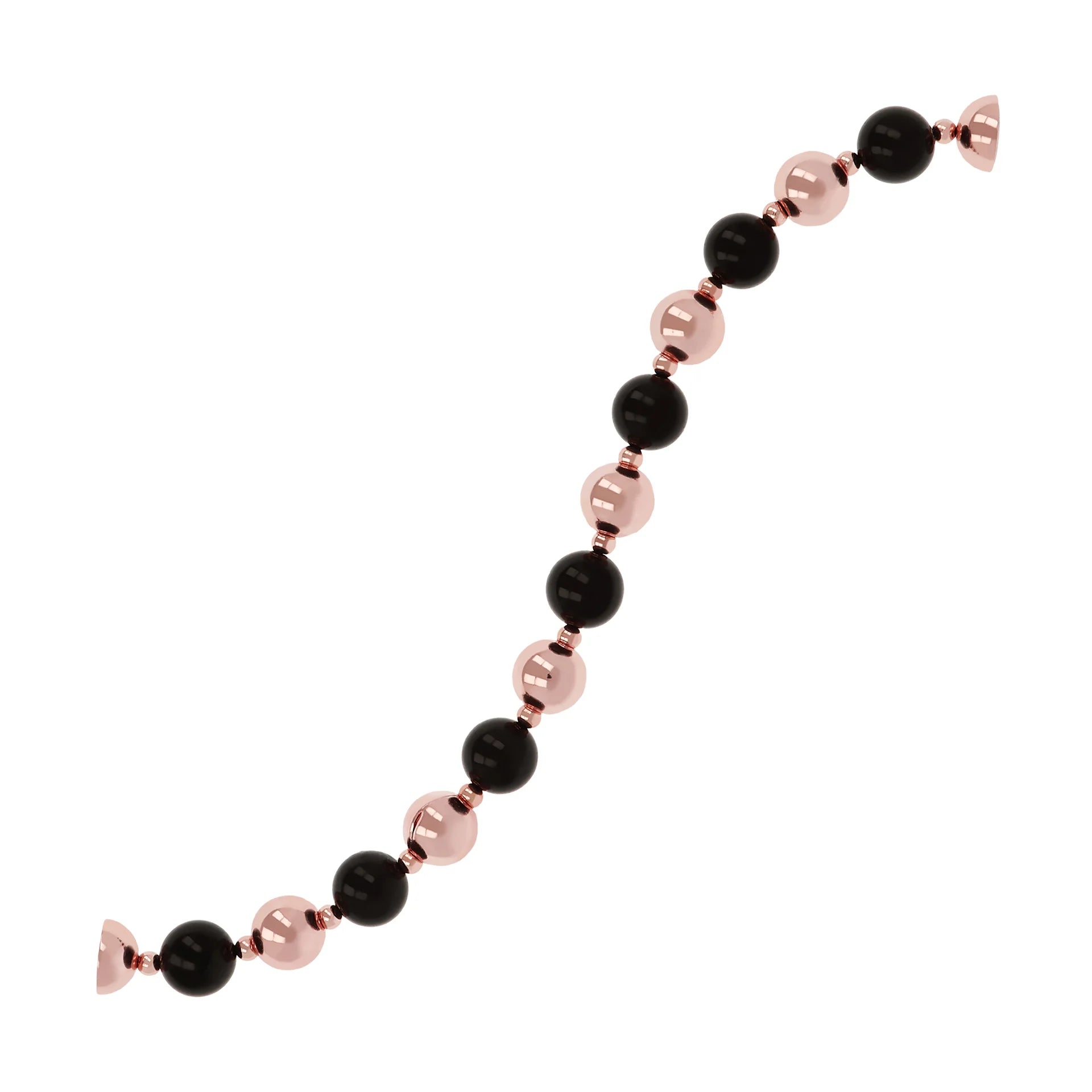 Bracciale Bronzallure realizzato in lega Golden Rosé, placcata Oro rosa 18kt, impreziosito un alternarsi di bead lucide piccole e grandi (4/12 mm) e da sfere in pietra natutale sfaccettata (12 mm). Chiusura magnetica.