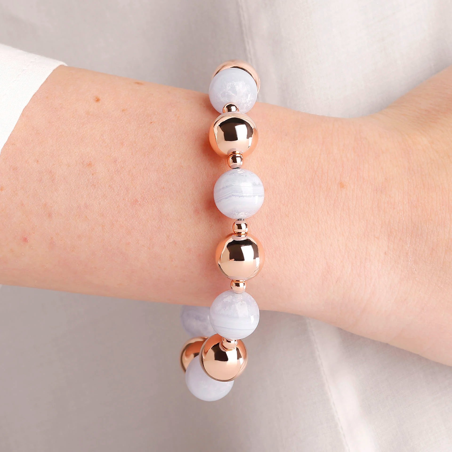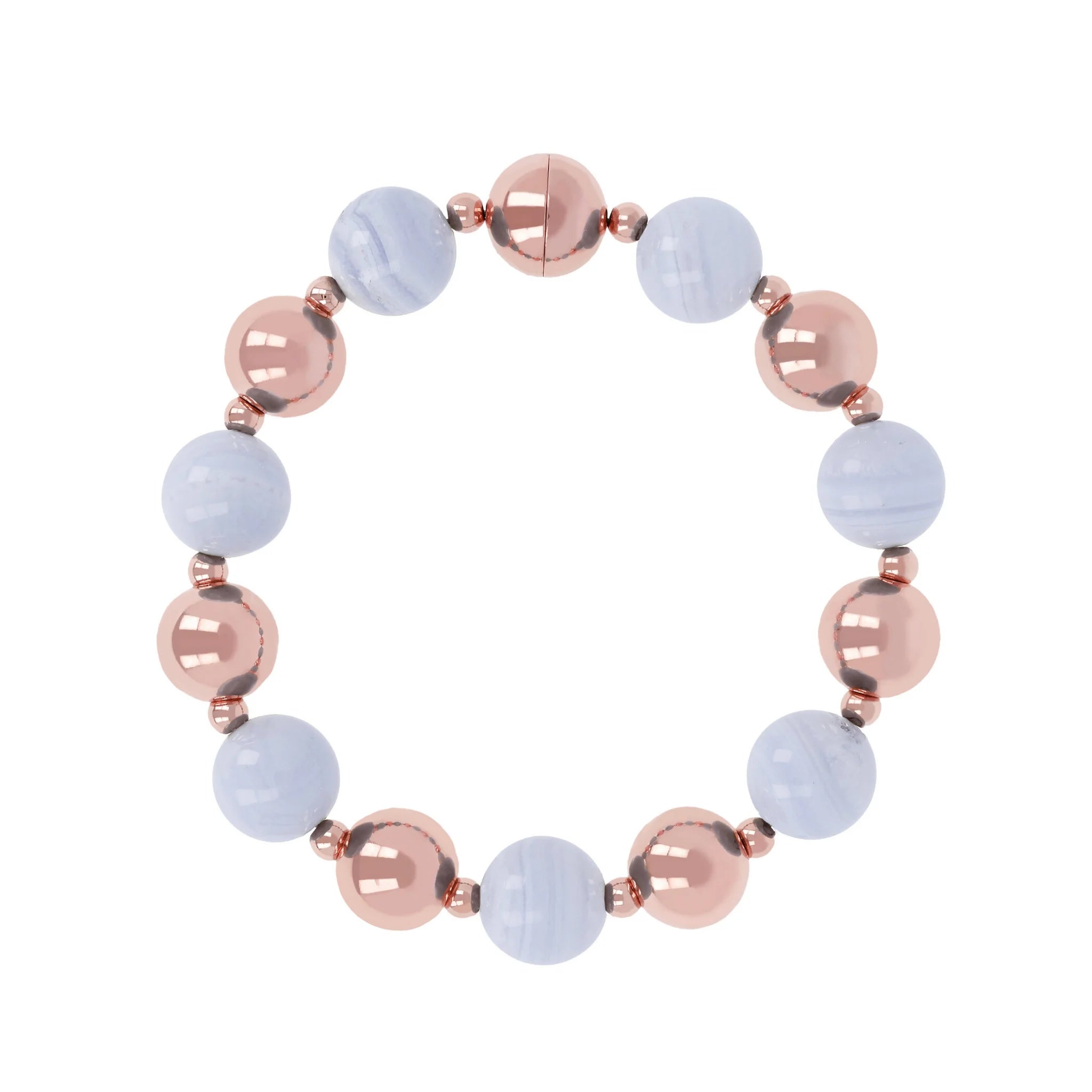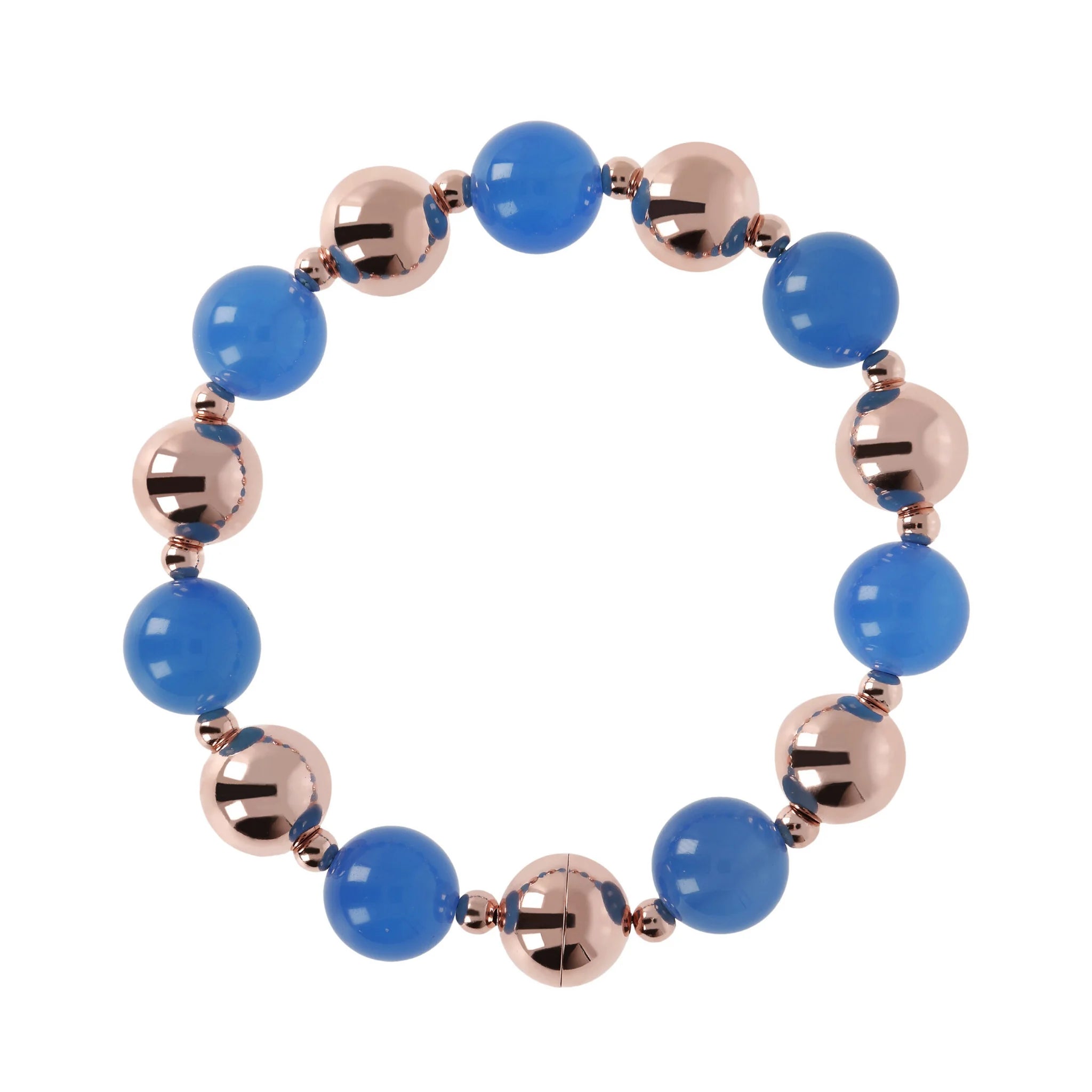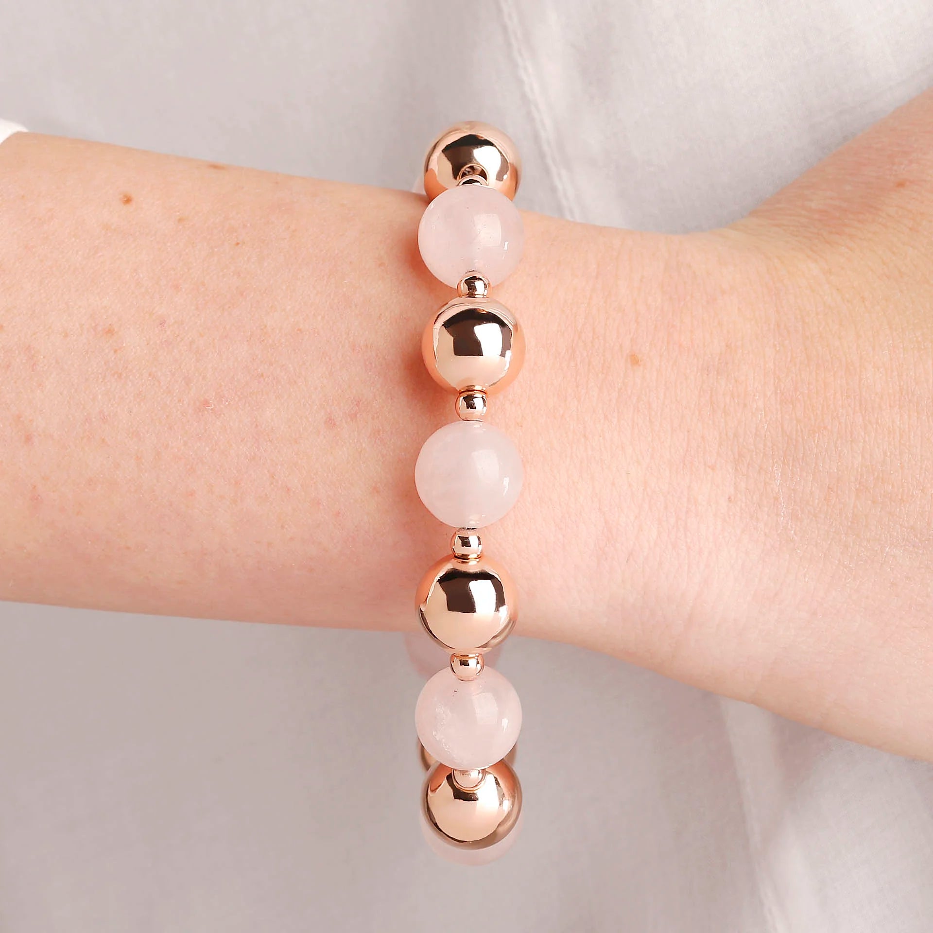 Bracciale Bronzallure realizzato in lega Golden Rosé, placcata Oro rosa 18kt, impreziosito un alternarsi di bead lucide piccole e grandi (4/12 mm) e da sfere in pietra natutale sfaccettata (12 mm). Chiusura magnetica.