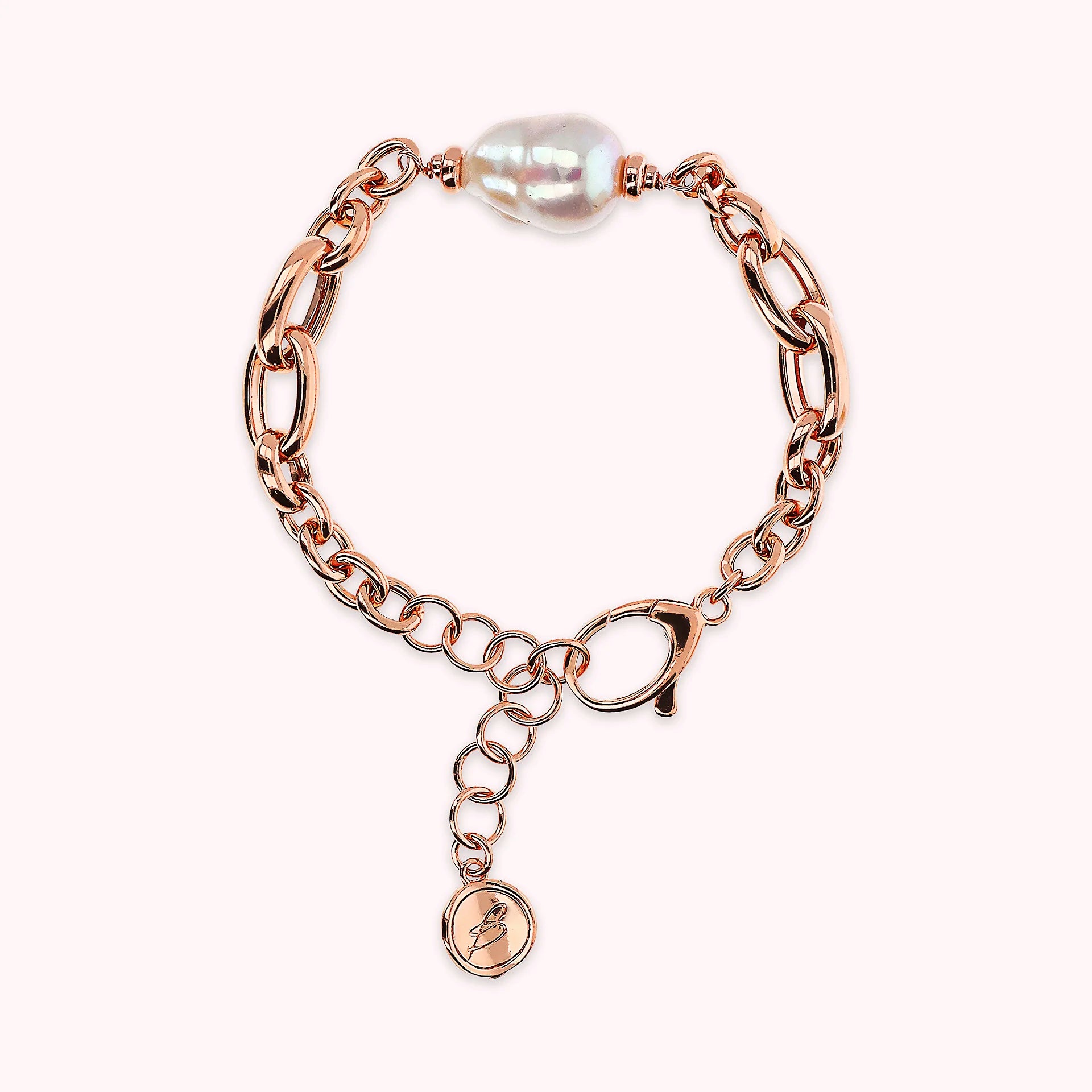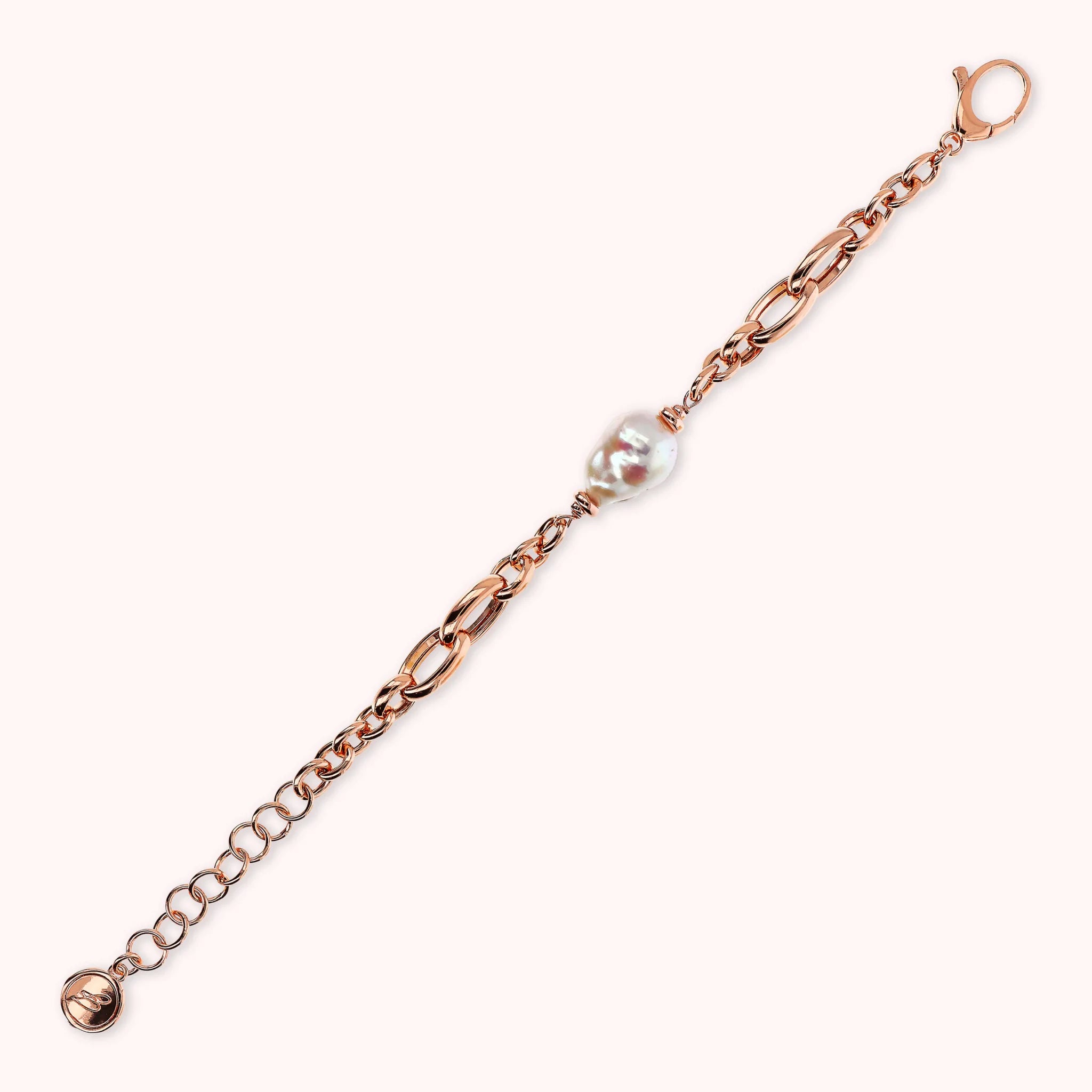 Bracciale Bronzallure realizzato in lega Golden Rosé, placcata Oro rosa 18kt, con catena rolo impreziosita da due station di maglie ovali intrecciate (16x10 mm) con una perla Barocca bianca coltivate d'acqua dolce con diametro di circa 13/13.5 mm. Lunghezza 18.5+4.5 cm di estensione. Chiusura a moschettone.