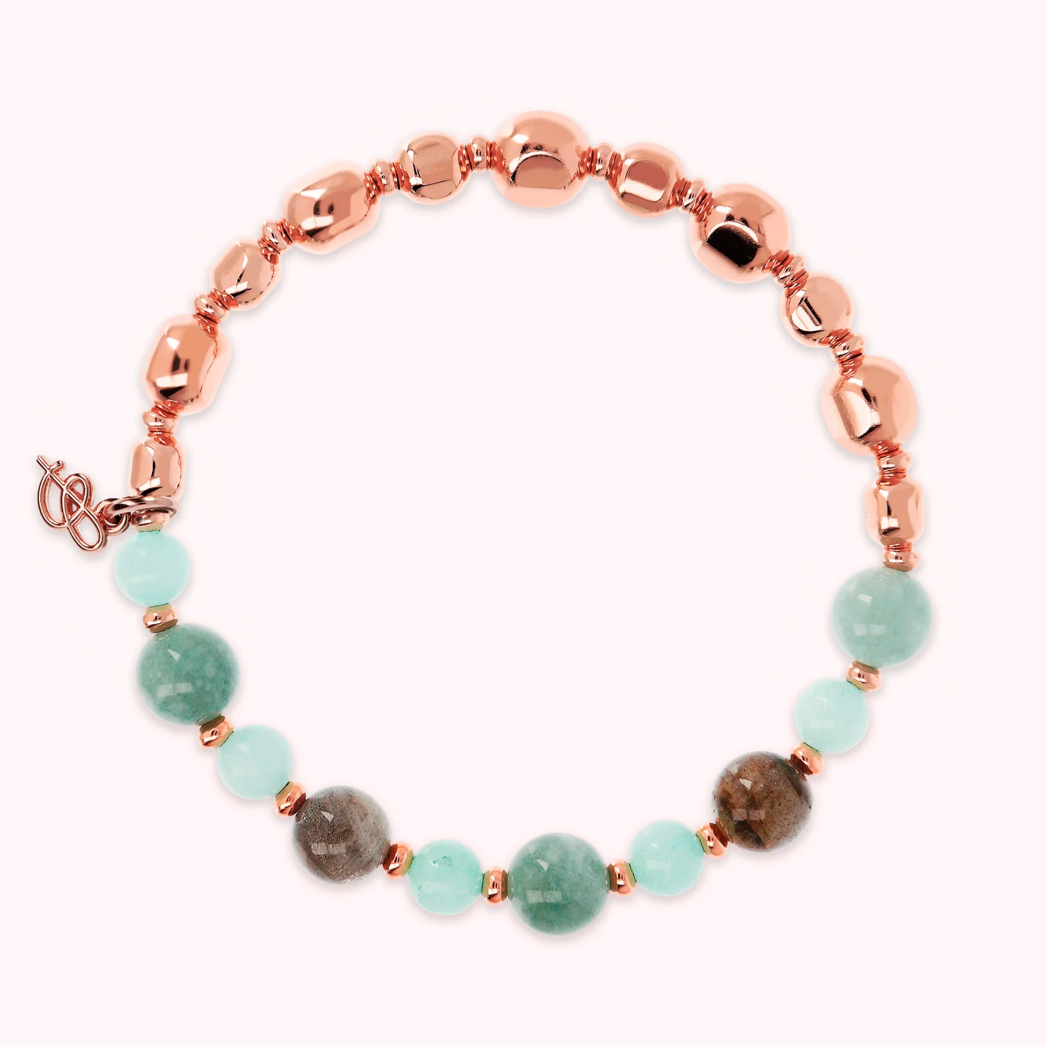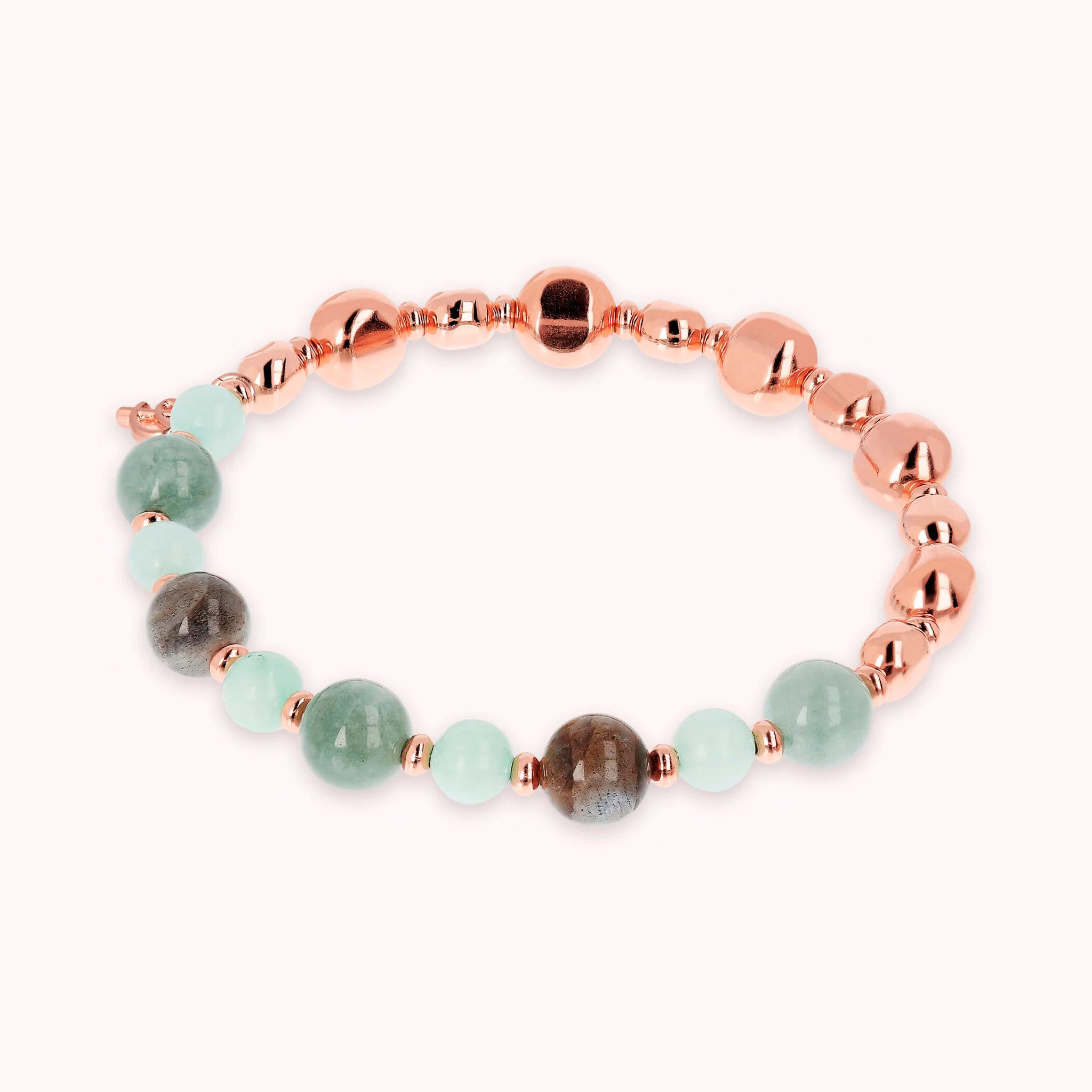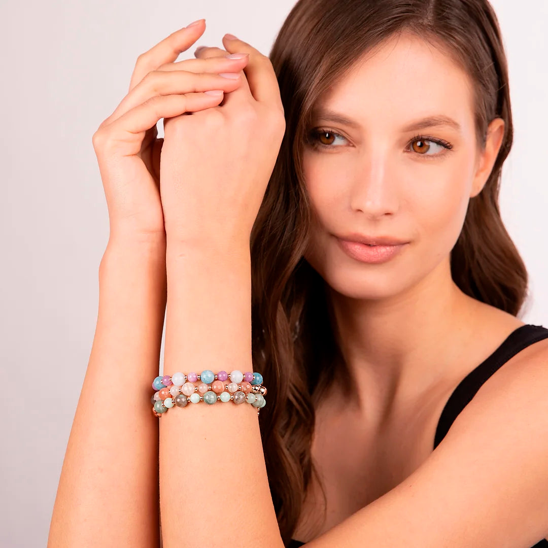 Bracciale elastico Bronzallure realizzato in lega Golden Rosé, placcato oro rosa 18kt, impreziosito da sfere (6/8 mm) in pietre naturali alternate a pepite irregolari (6/8 mm) e a piccole rondelle (3 mm) in golden rosé.