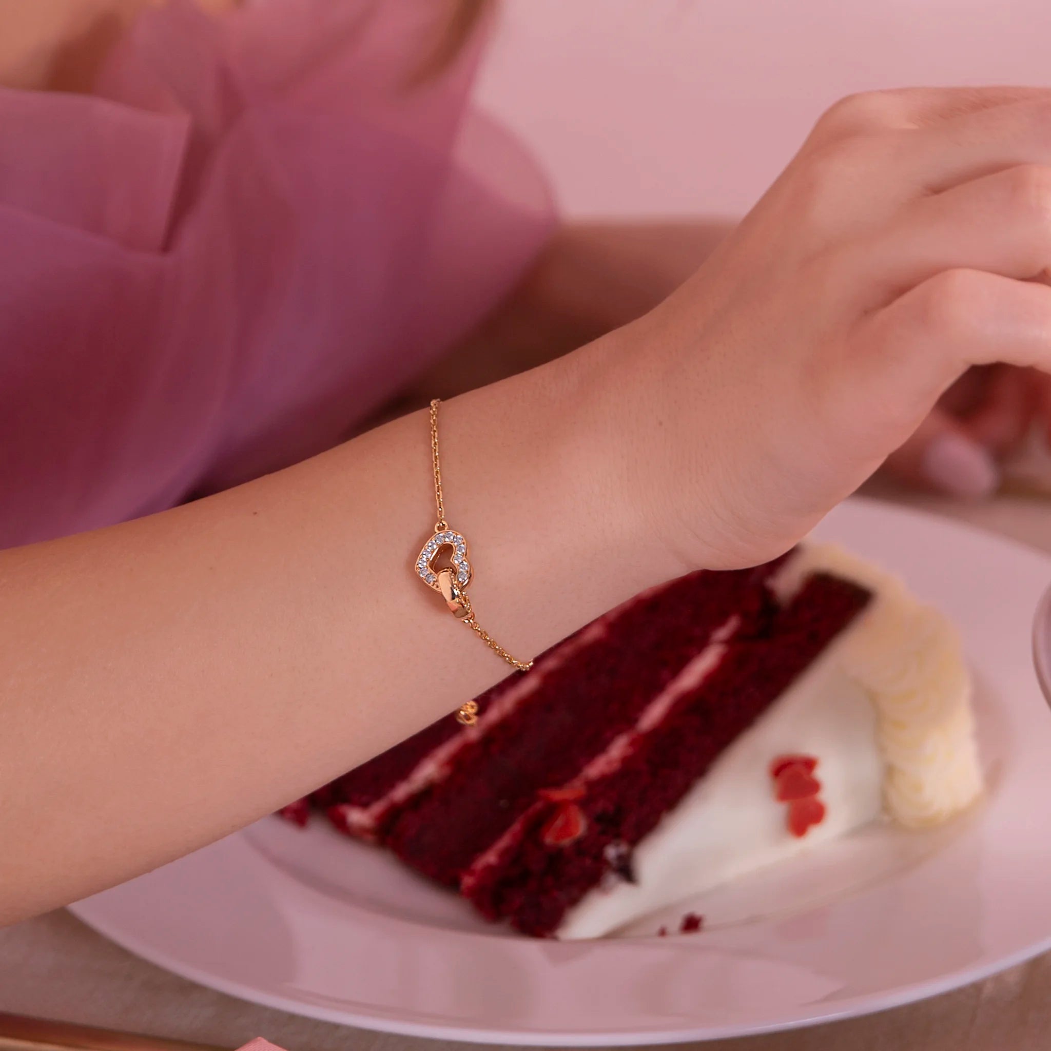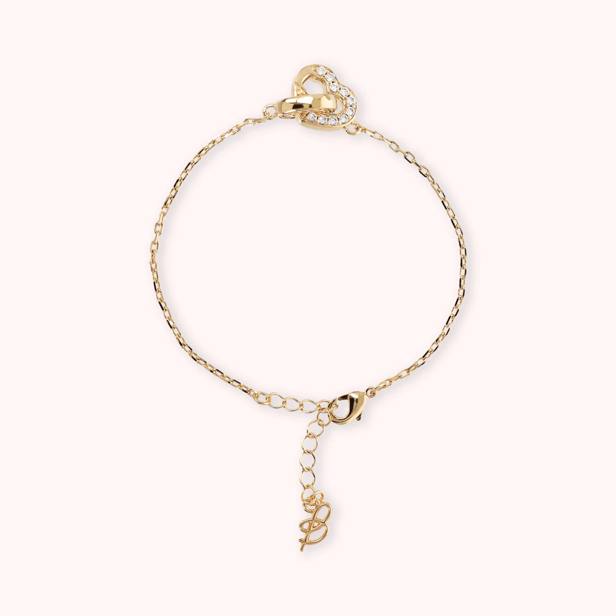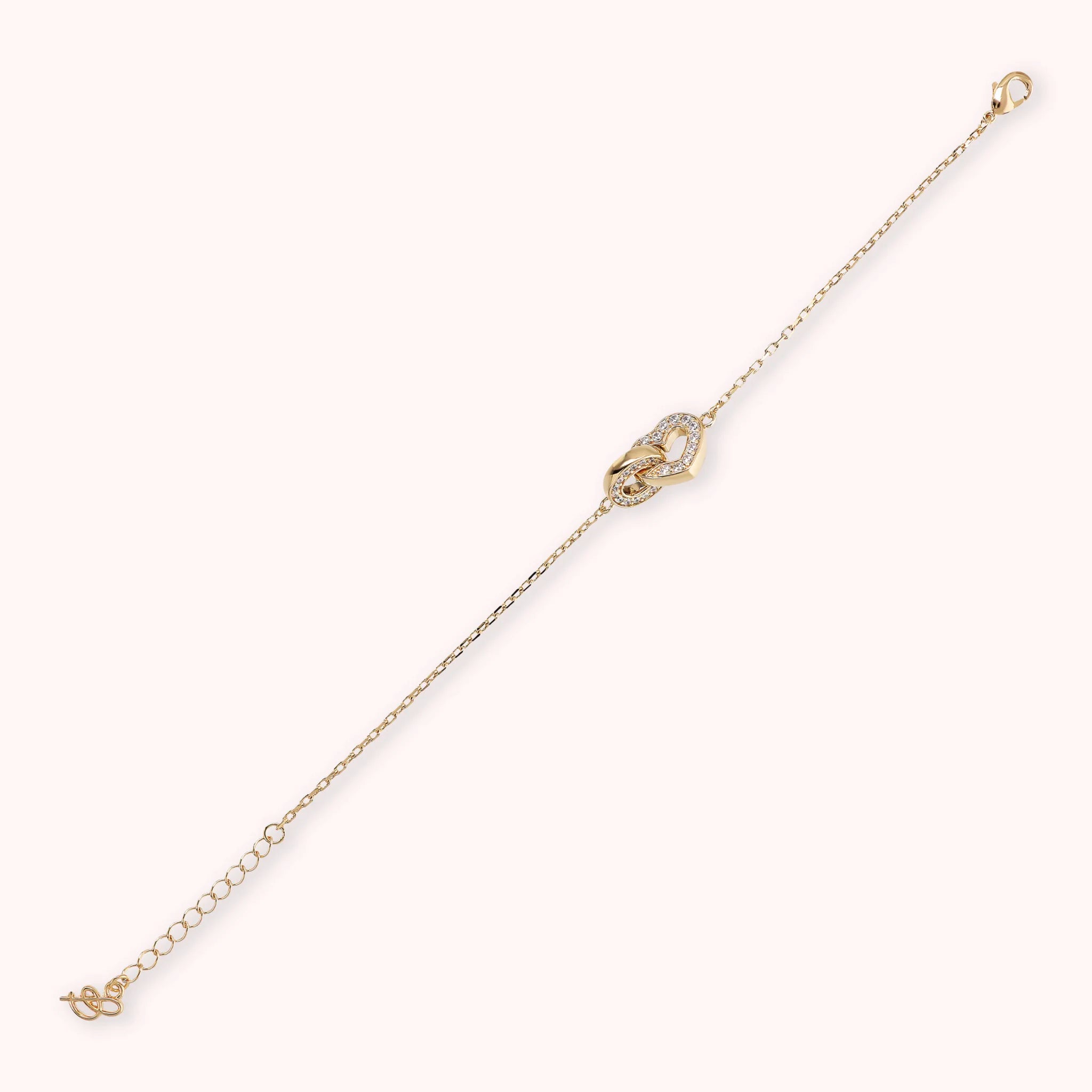 Bracciale realizzato in lega Golden Rosé, placcata Oro giallo 18kt, con catena forzatina impreziosita da un doppio ciondolo intrecciato a forma di cuore e maglia ovale. Entrambi gli elementi sono impreziositi da piccoli punti luce in cubic zirconia, qualità luminosa. Chiusura a moschettone.