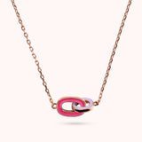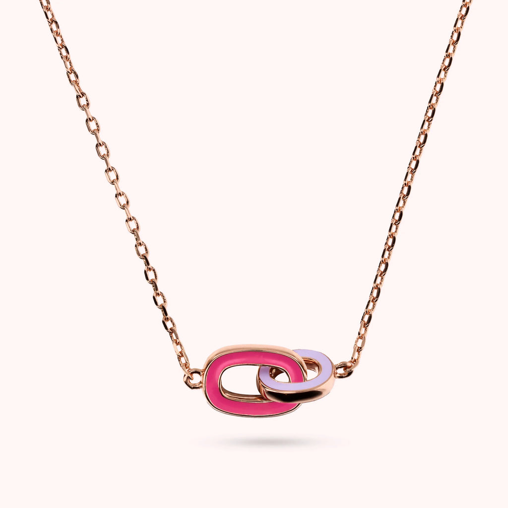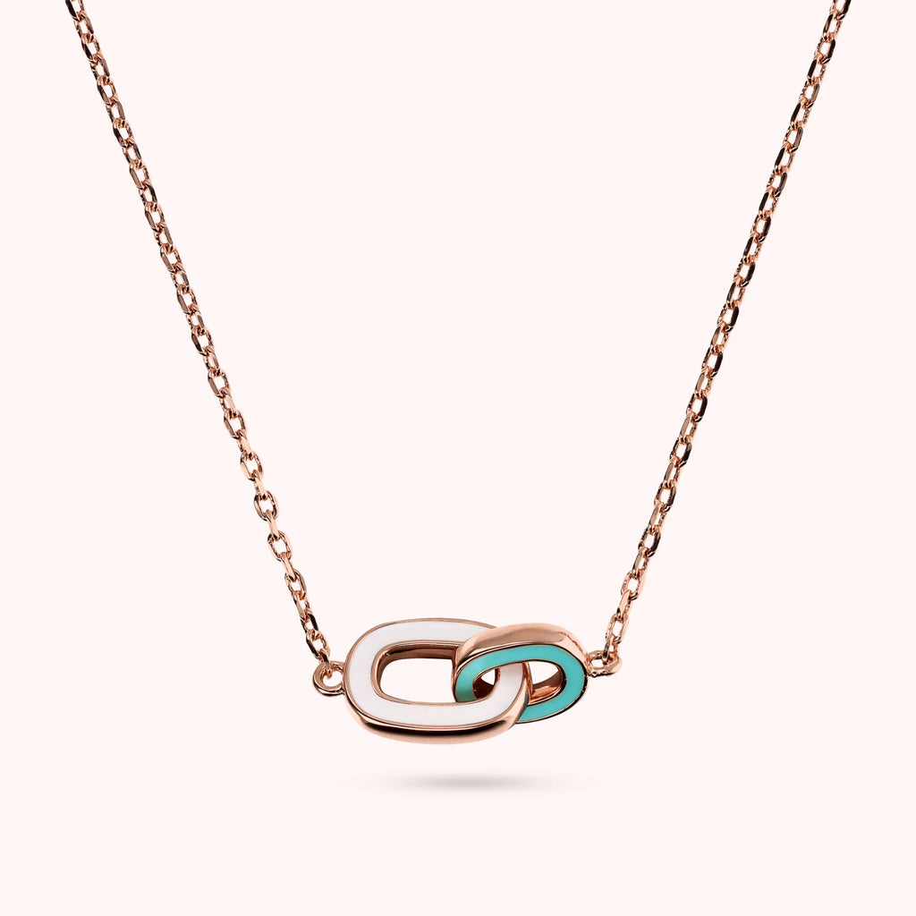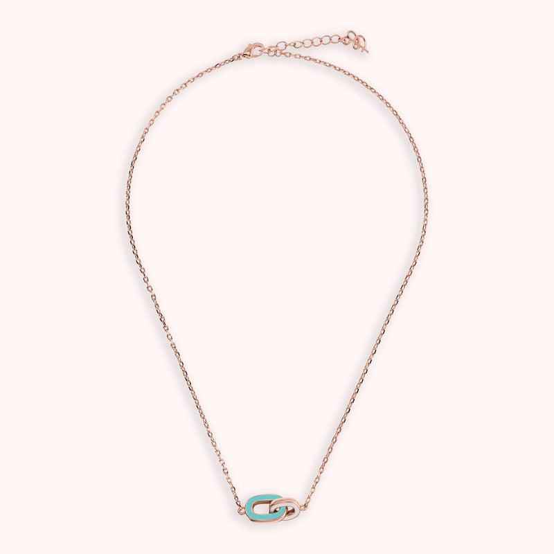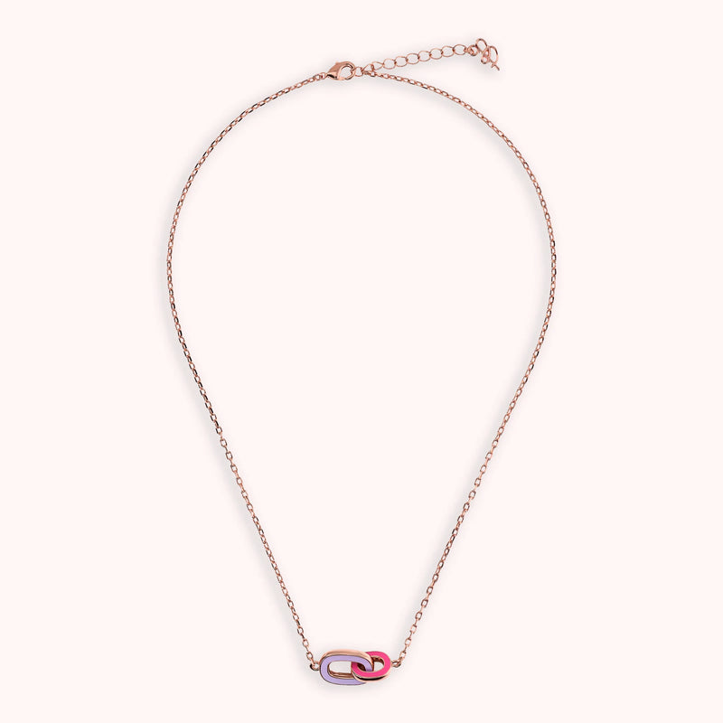 Collana Bronzallure realizzata in lega Golden Rosé, placcata oro rosa 18kt, con catena forzatina impreziosita da un pendente con due maglie bicolori concatenate dalla forma ovale (11x9 mm) e rettangolare (14.5x10.5 mm) con superficie smaltata; chiusura a moschettone con extender.
