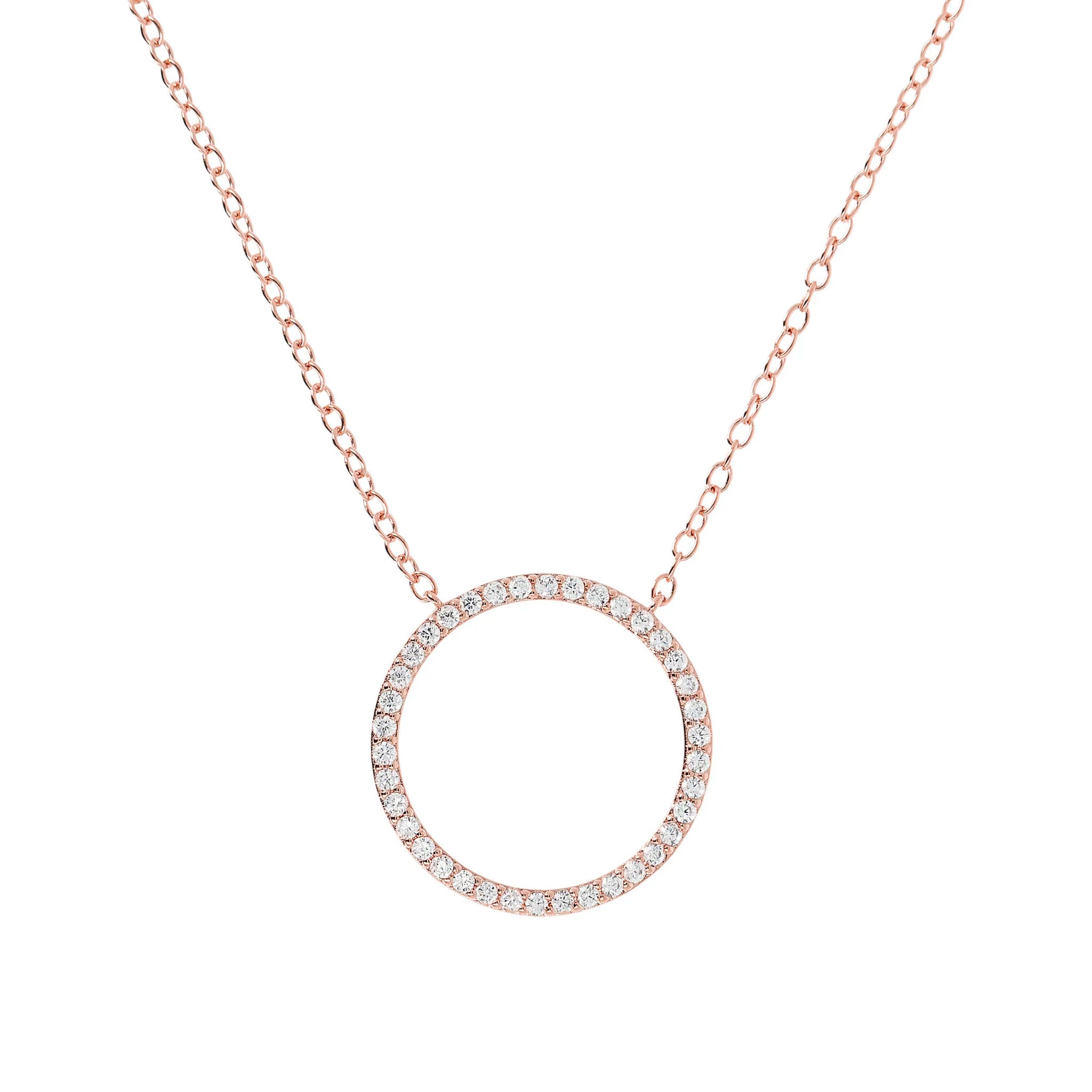 Collana Bronzallure realizzata in lega Golden Rosé, placcata oro rosa 18kt, con catena rolo impreziosita da un pendente a cerchio con pavé in cubic zirconia di colore bianco, qualità luminosa. Chiusura a moschettone e lunghezza 47 cm con anellini interposti a 41 e 44 cm.