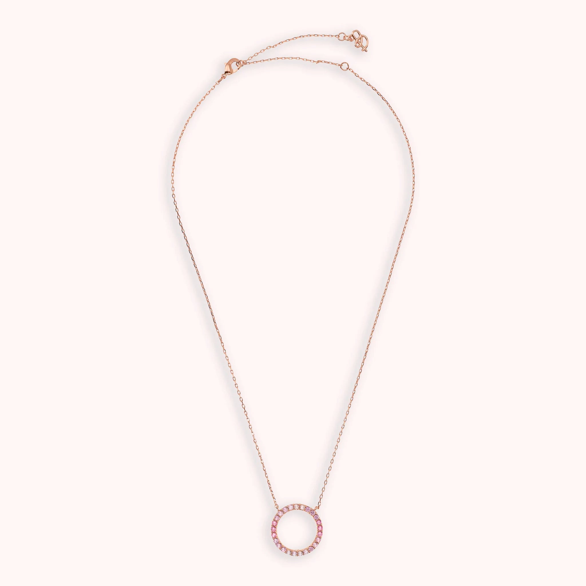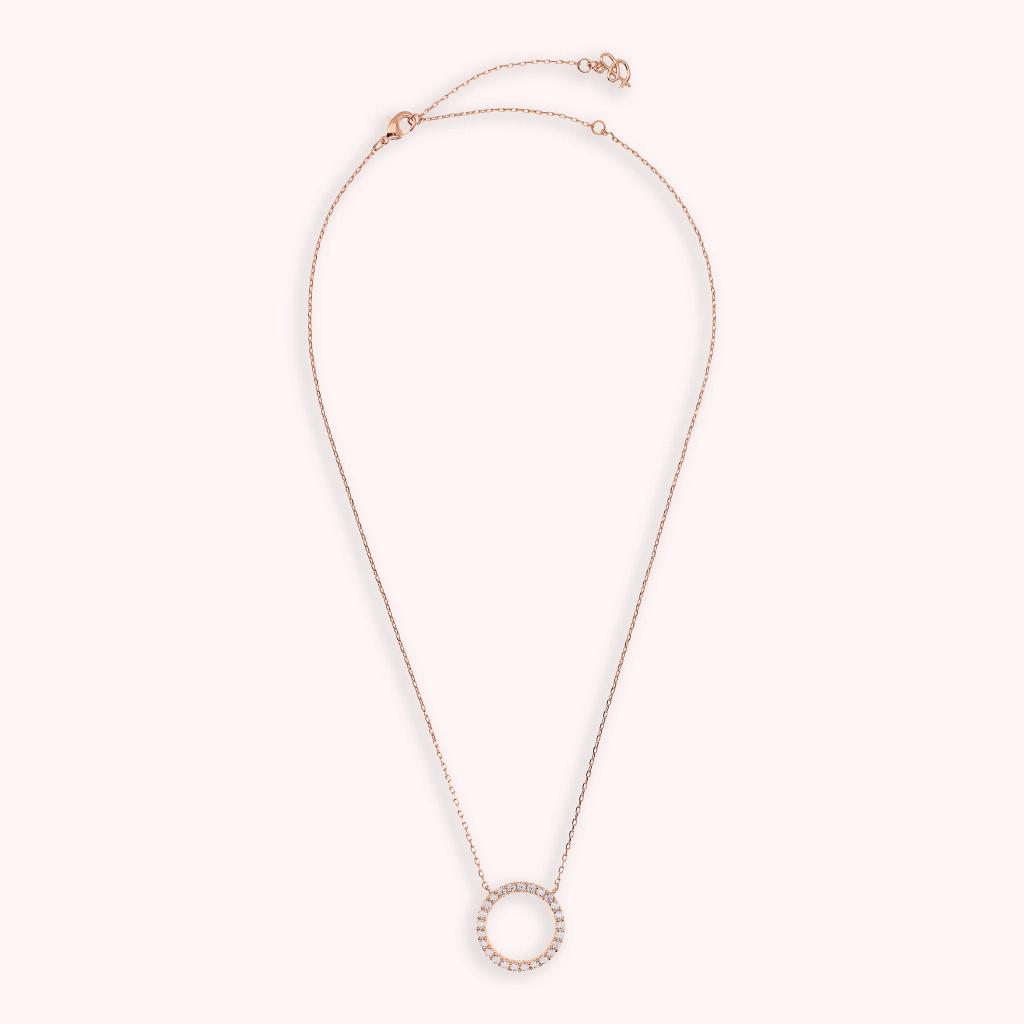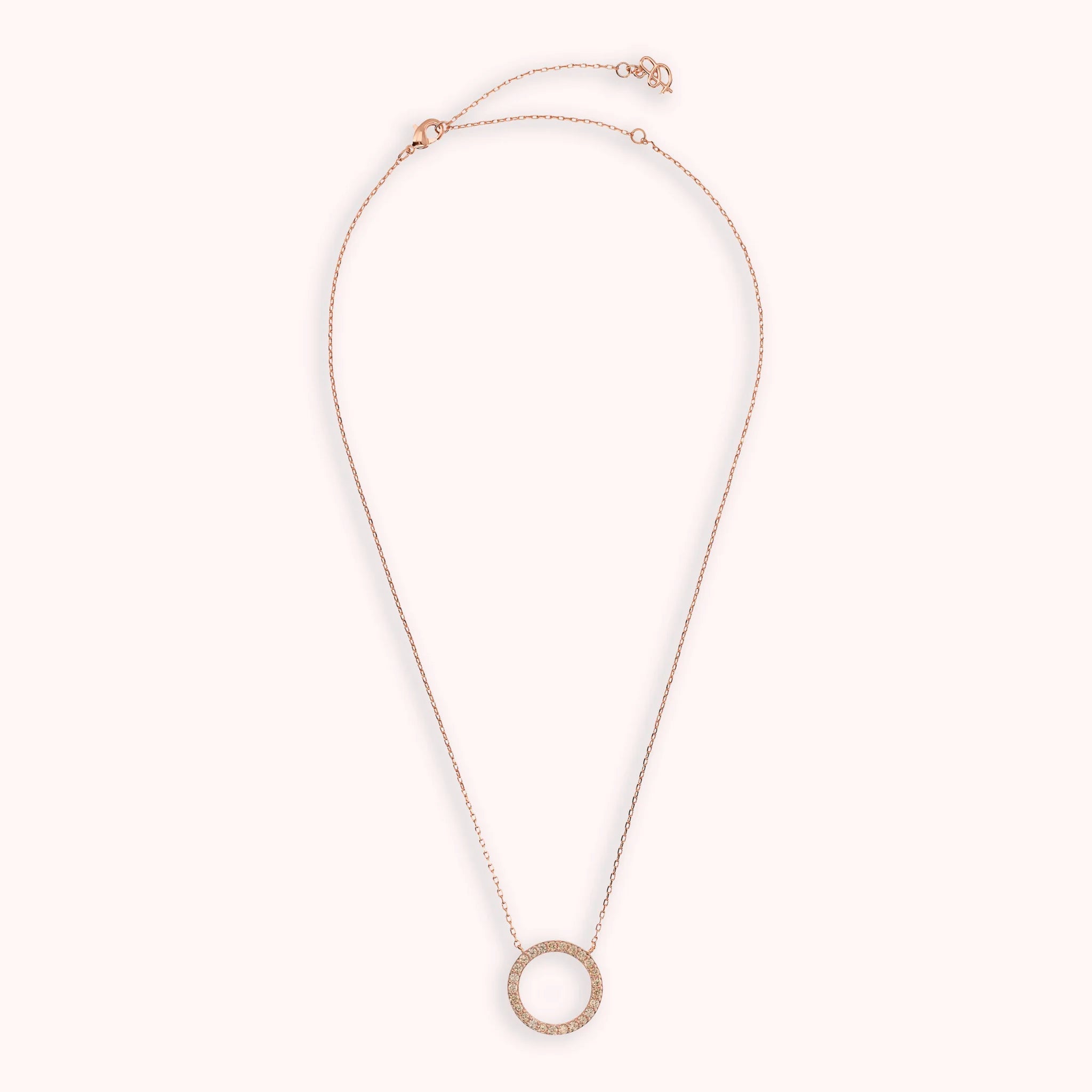 Collana Bronzallure realizzata in lega Golden Rosé, placcata Oro rosa 18kt, con catena forzatina e pendente fisso a forma di anello (20 mm) con cubic zirconia, qualità luminosa. Chiusura a moschettone. Lunghezza 47 cm con anellini interposti a 41 e 44 cm.