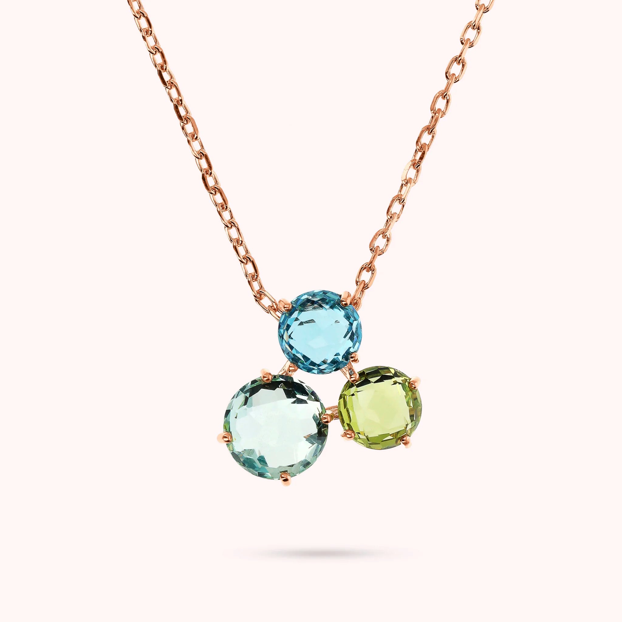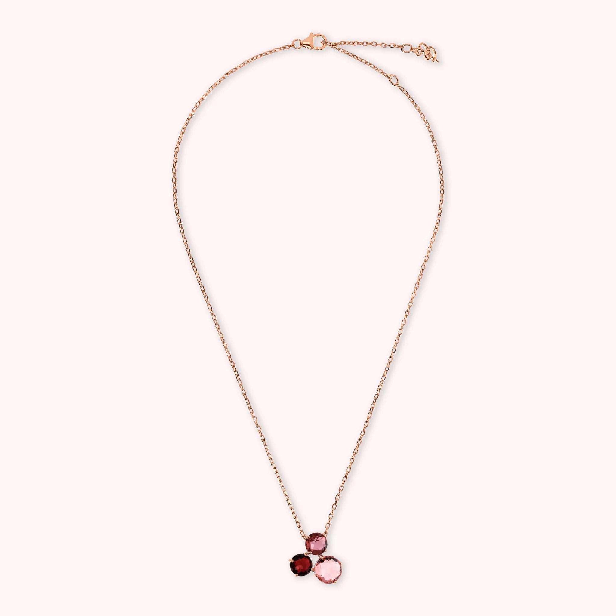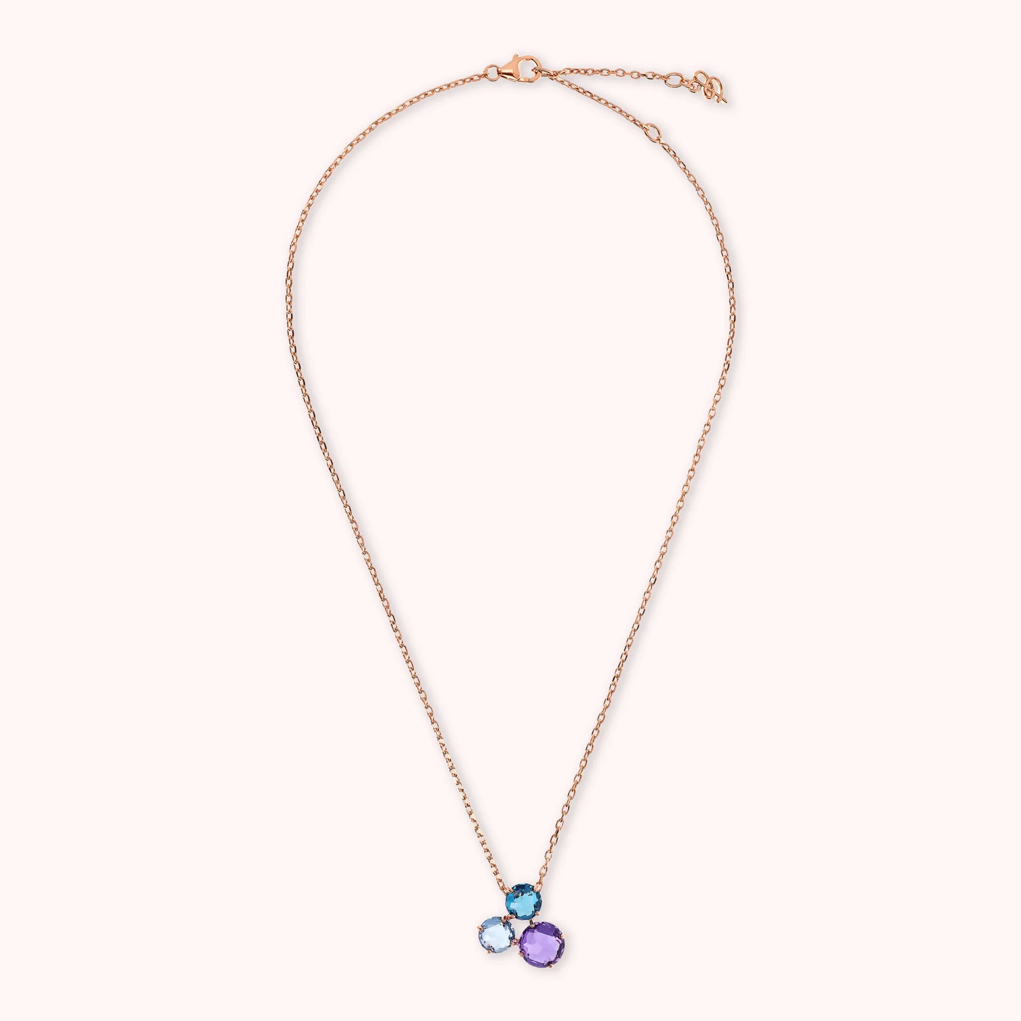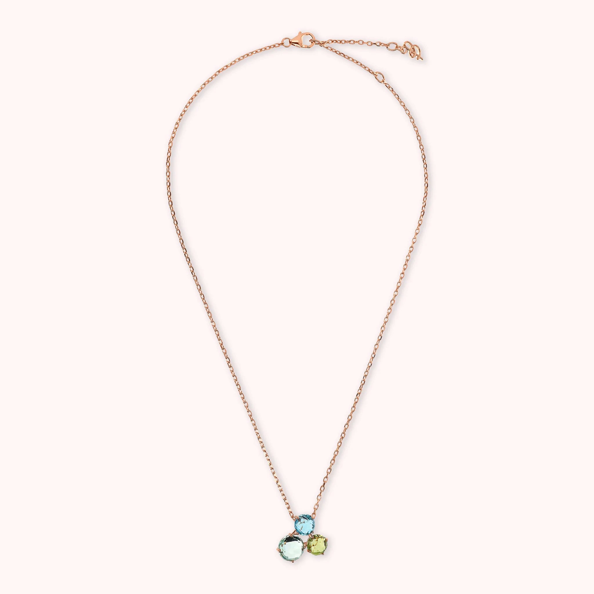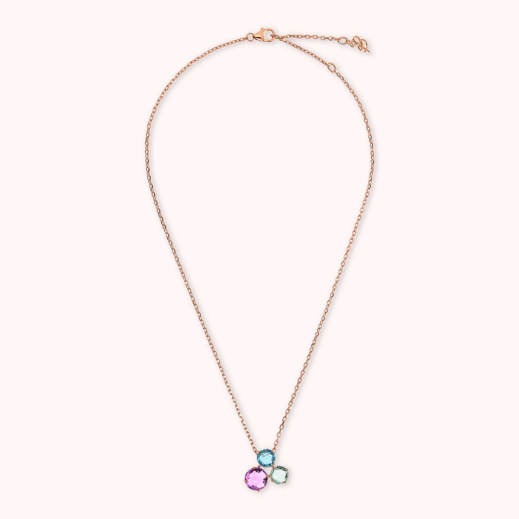 Collana Bronzallure realizzata in lega Golden Rosé, placcata Oro rosa 18kt, con pendente trilogy impreziosito da tre pietre prisma gem tonde (8/10 mm) dal taglio a mosaico. Lunghezza 47 cm regolabile da due anellini interposti a 41 e 44 cm. Chiusura a moschettone.