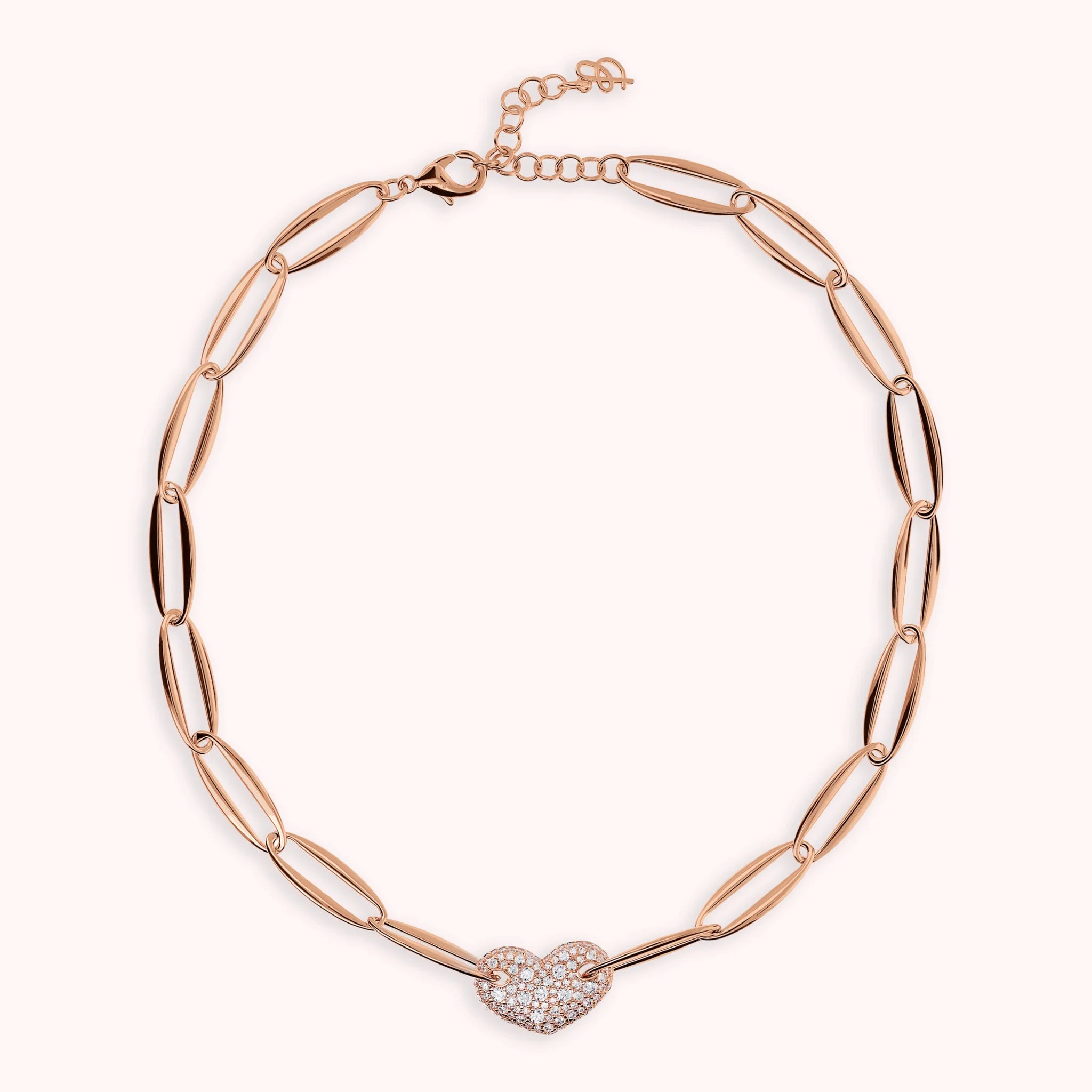 Collana girocollo Bronzallure realizzata in lega Golden Rosé, placcata Oro rosa 18kt, con maglie marquise lucide (25x10 mm) e pendente fisso a forma di cuore (23x13 mm) in pavé di cubic zirconia, qualità luminosa. Lunghezza 42+4 cm di estensione. Chiusura a moschettone.
