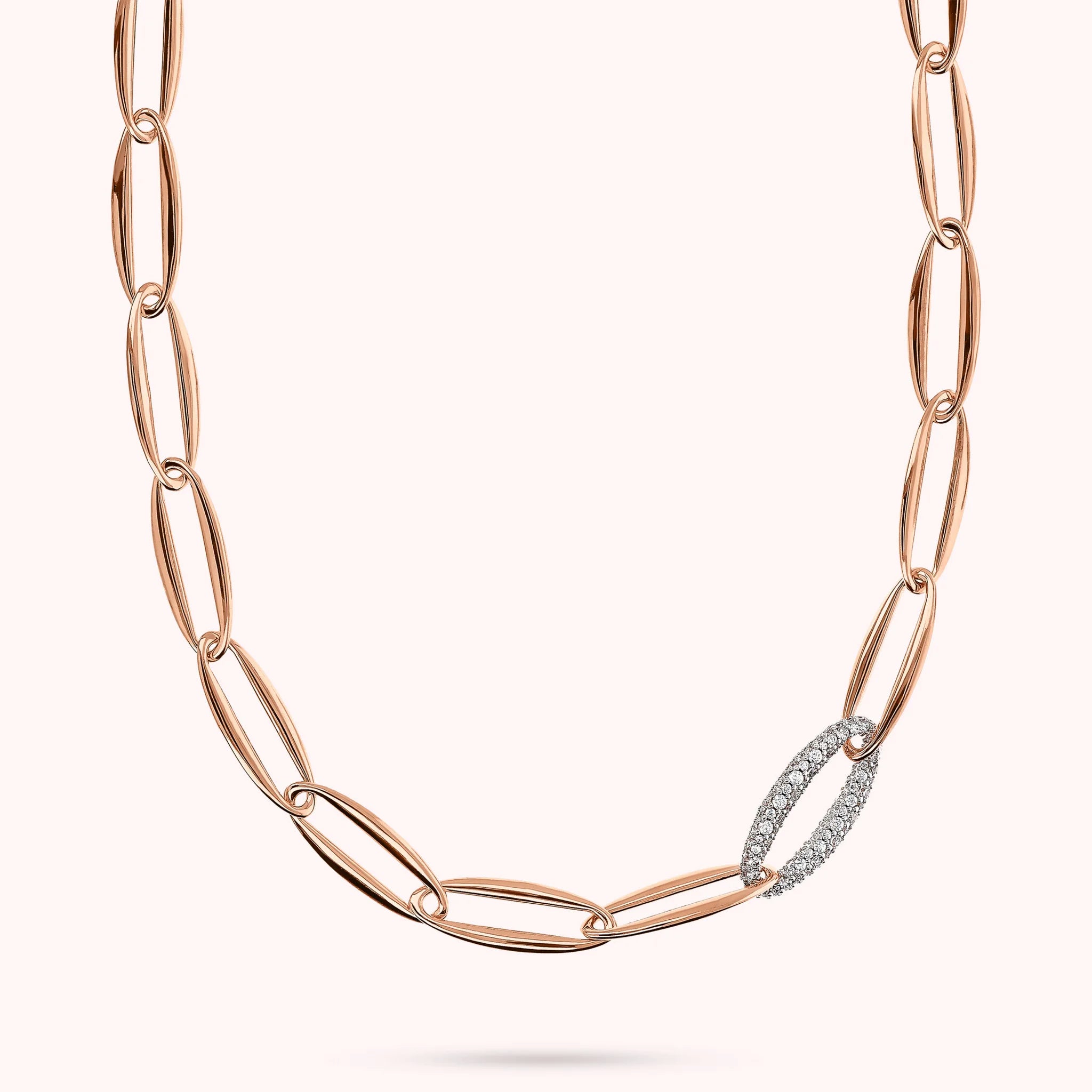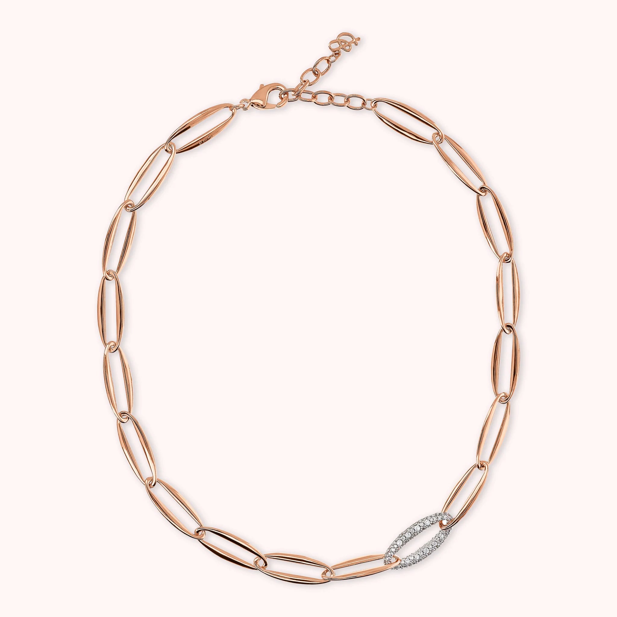 Collana girocollo Bronzallure realizzata in lega Golden Rosé, placcata Oro rosa 18kt, con maglie marquise lucide di cui una in pavé di cubic zirconia, qualità luminosa. Lunghezza 40+4 cm di estensione. Chiusura a moschettone.