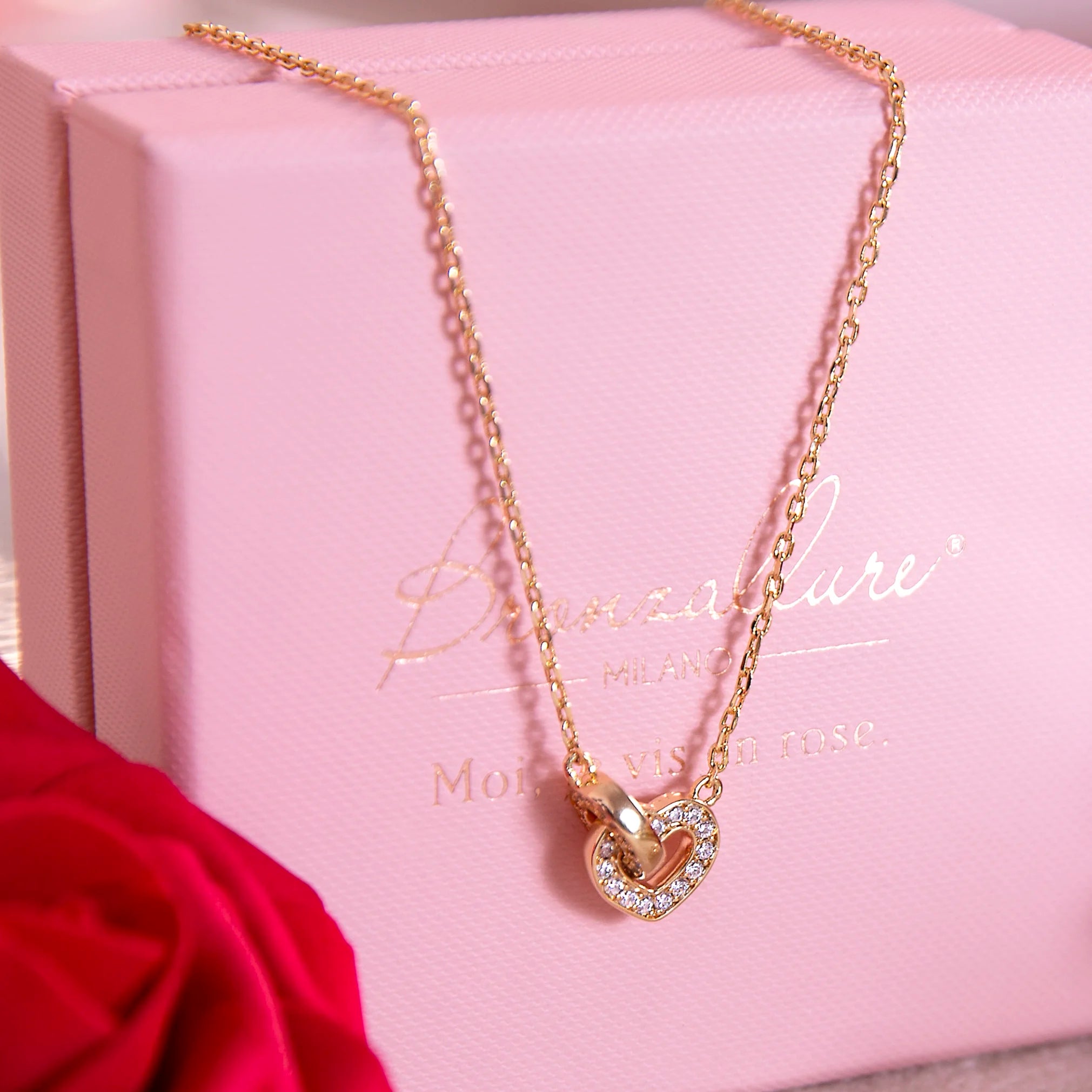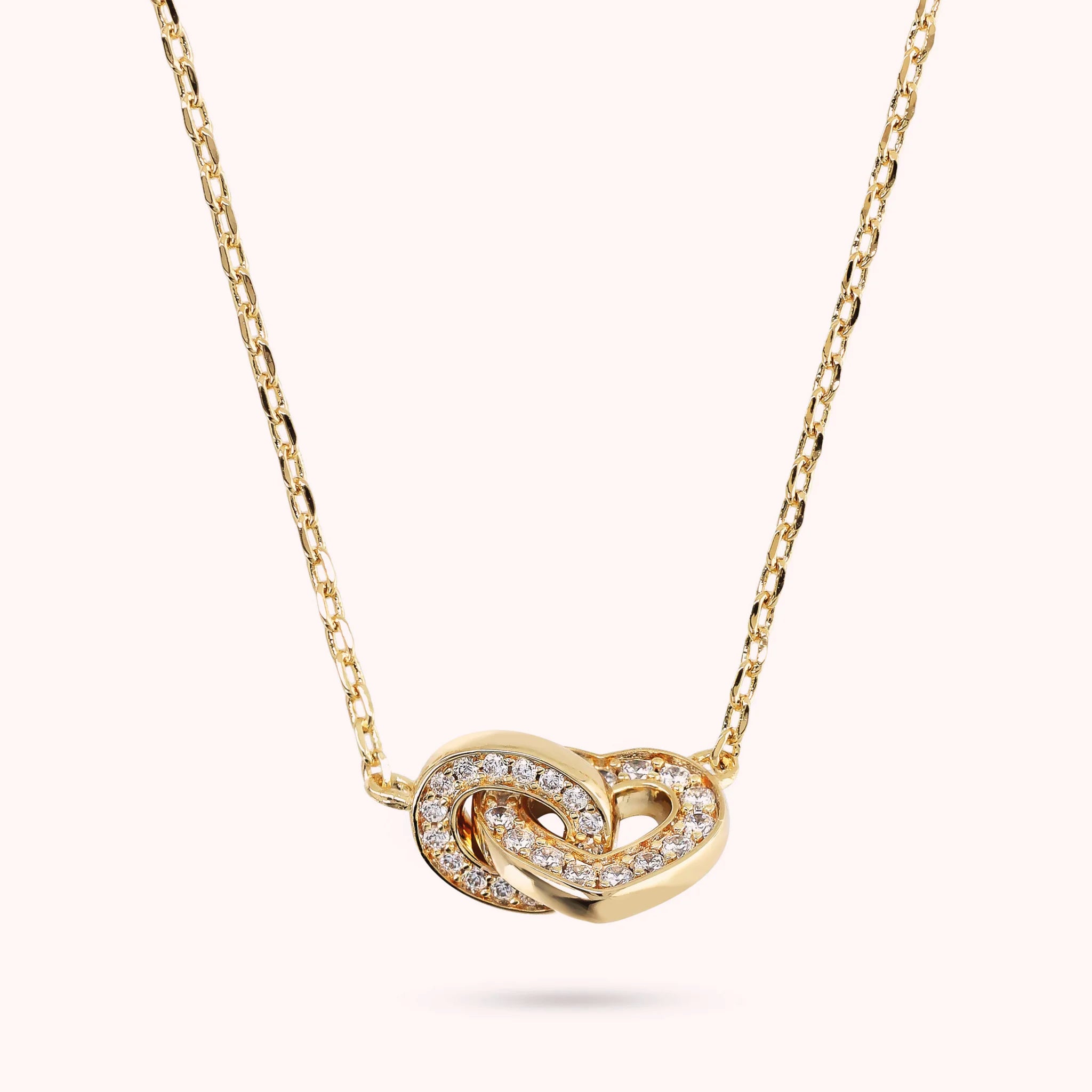 Collana realizzata in lega Golden Rosé, placcata oro giallo 18kt, con catena forzatina impreziosita da un doppio pendente intrecciato a forma di cuore e di maglia ovale. Entrambi i pendenti sono impreziositi da piccoli punti luce in cubic zirconia, qualità luminosa. Chiusura a moschettone.