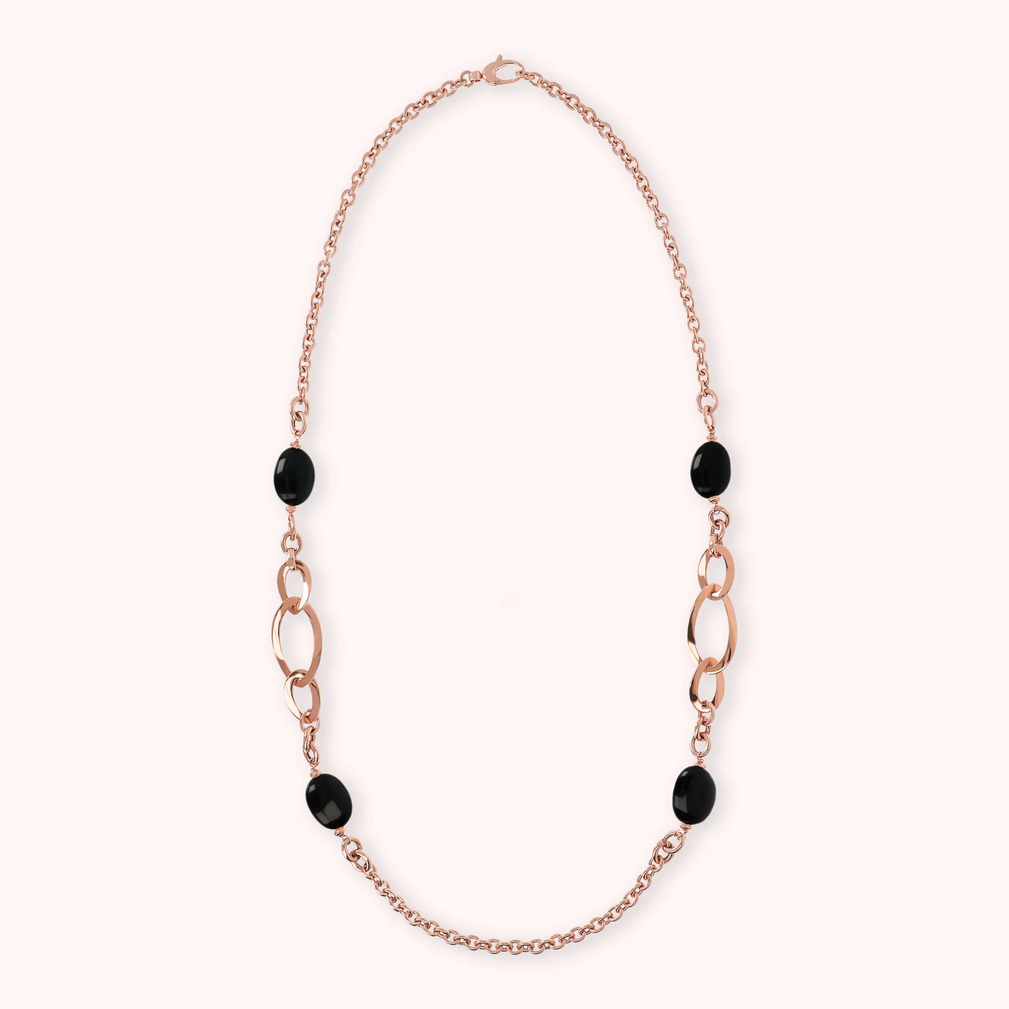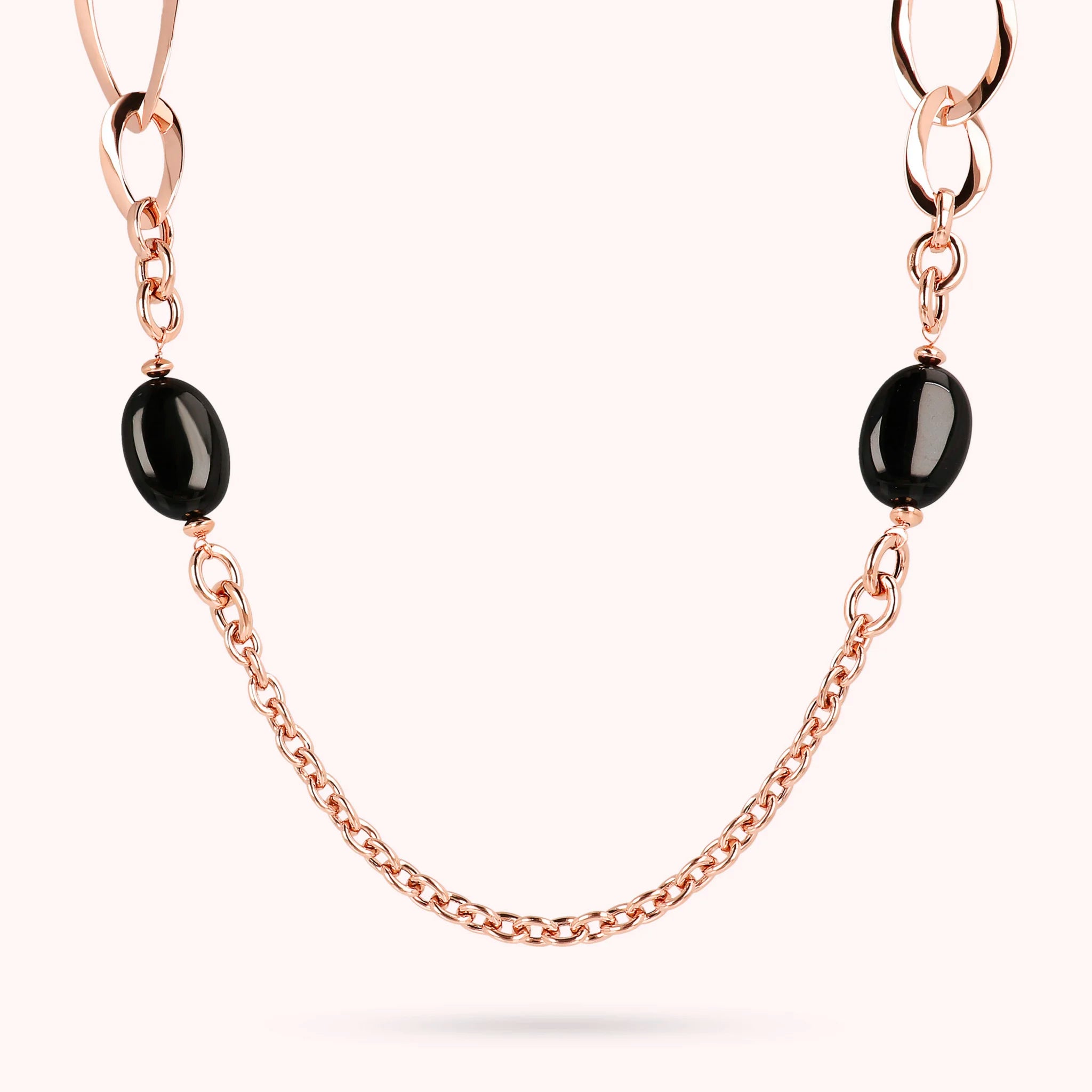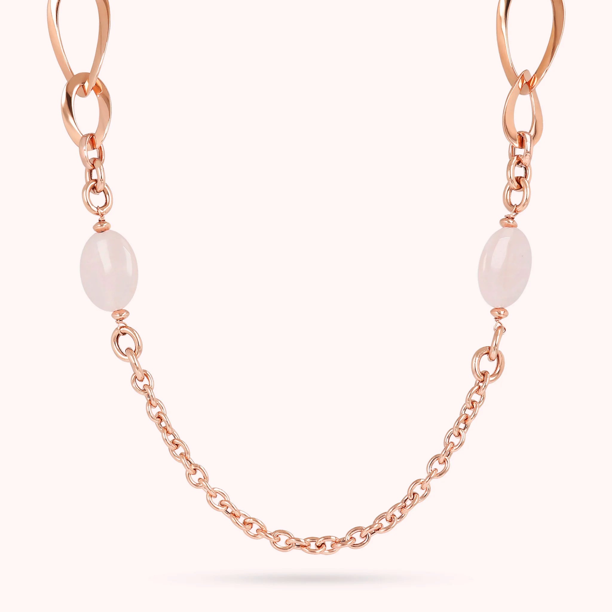 Collana lunga Bronzallure realizzata in lega Golden Rosé, placcata oro rosa 18kt, con catena rolo impreziosita da maglie a grumetta in Golden Rosé e pietre naturali, con chiusura a moschettone.