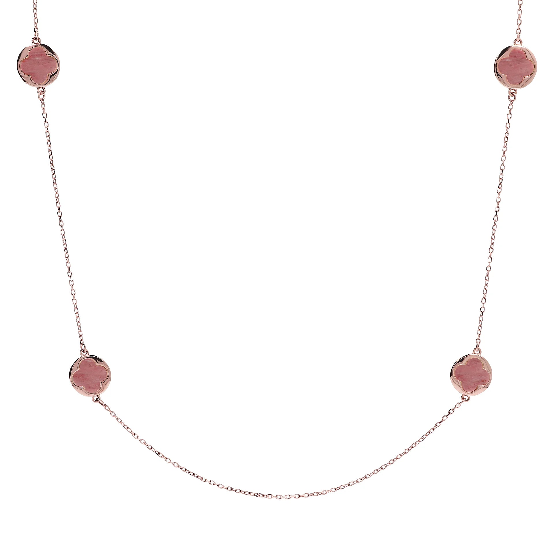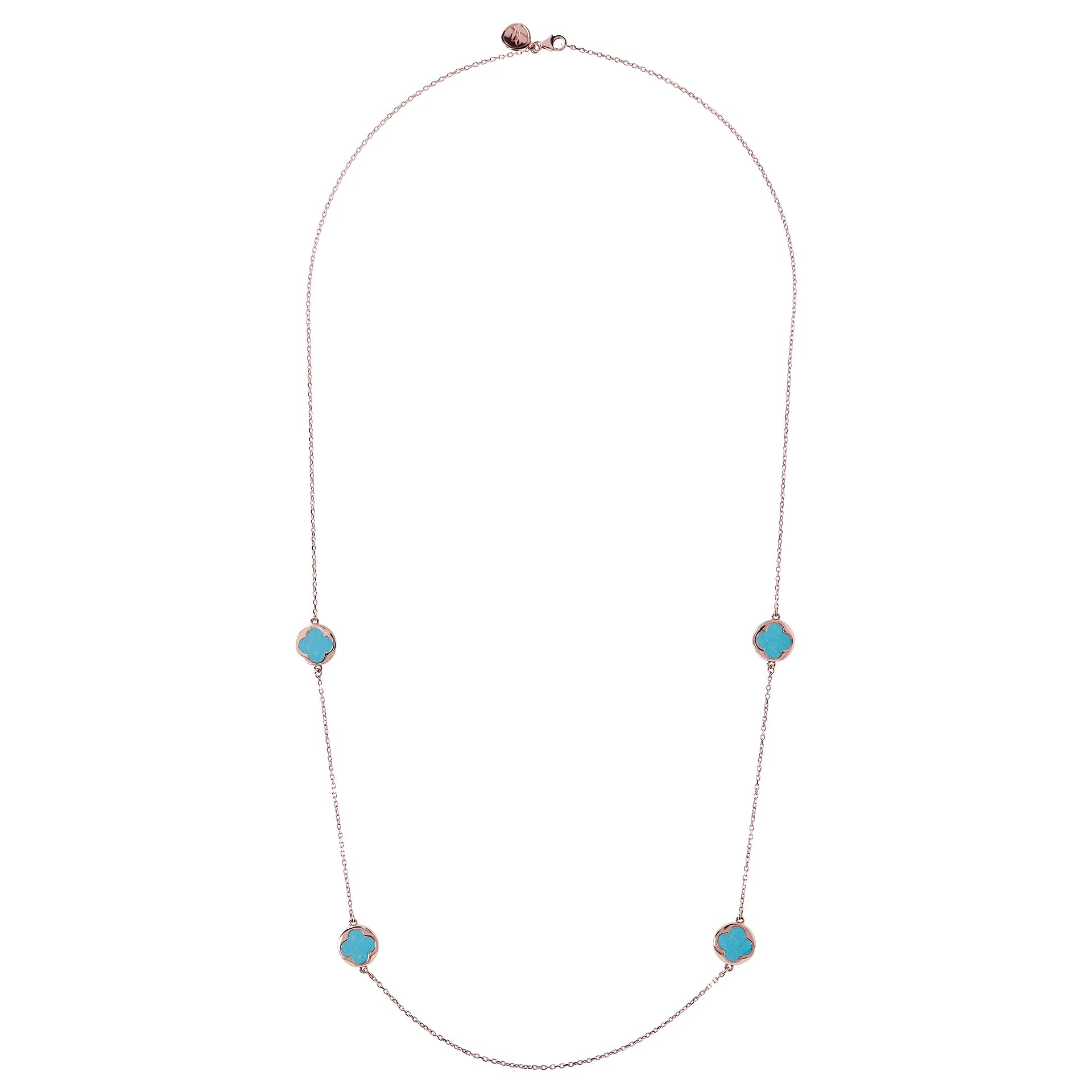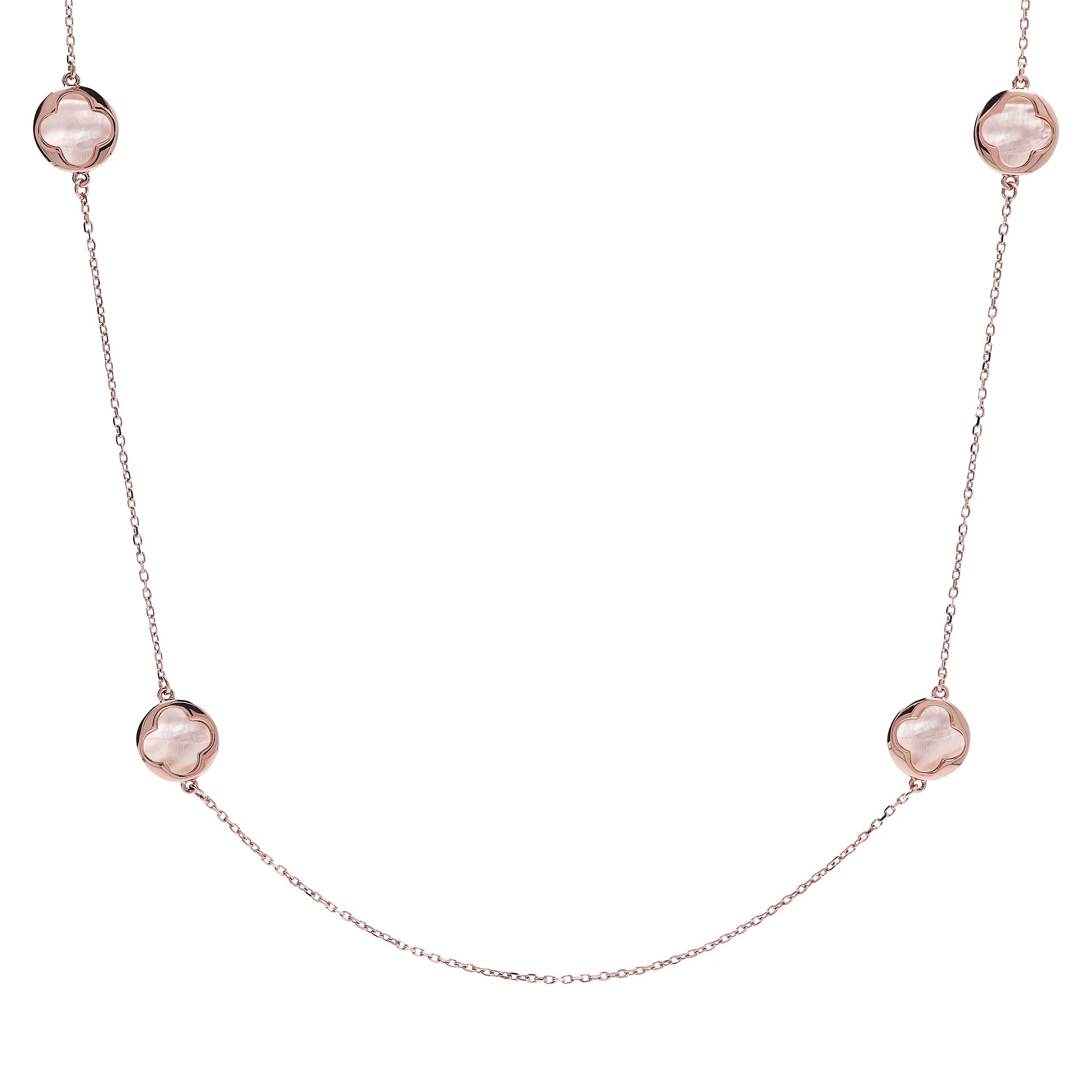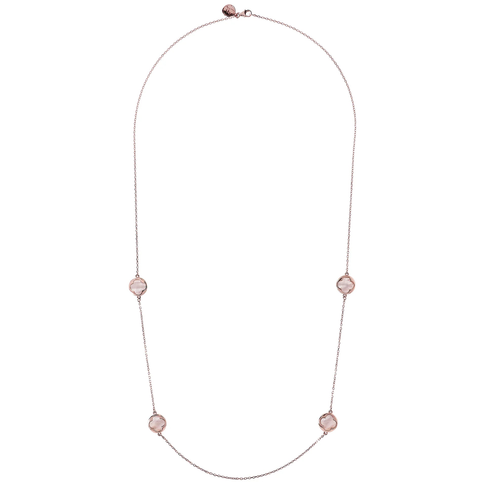 Collana lunga Bronzallure realizzata in lega Golden Rosé, placcata oro rosa 18kt con catena forzatina con quattro station a quadrifoglio piccoli in pietra naturale (12 mm). Chiusura a moschettone.