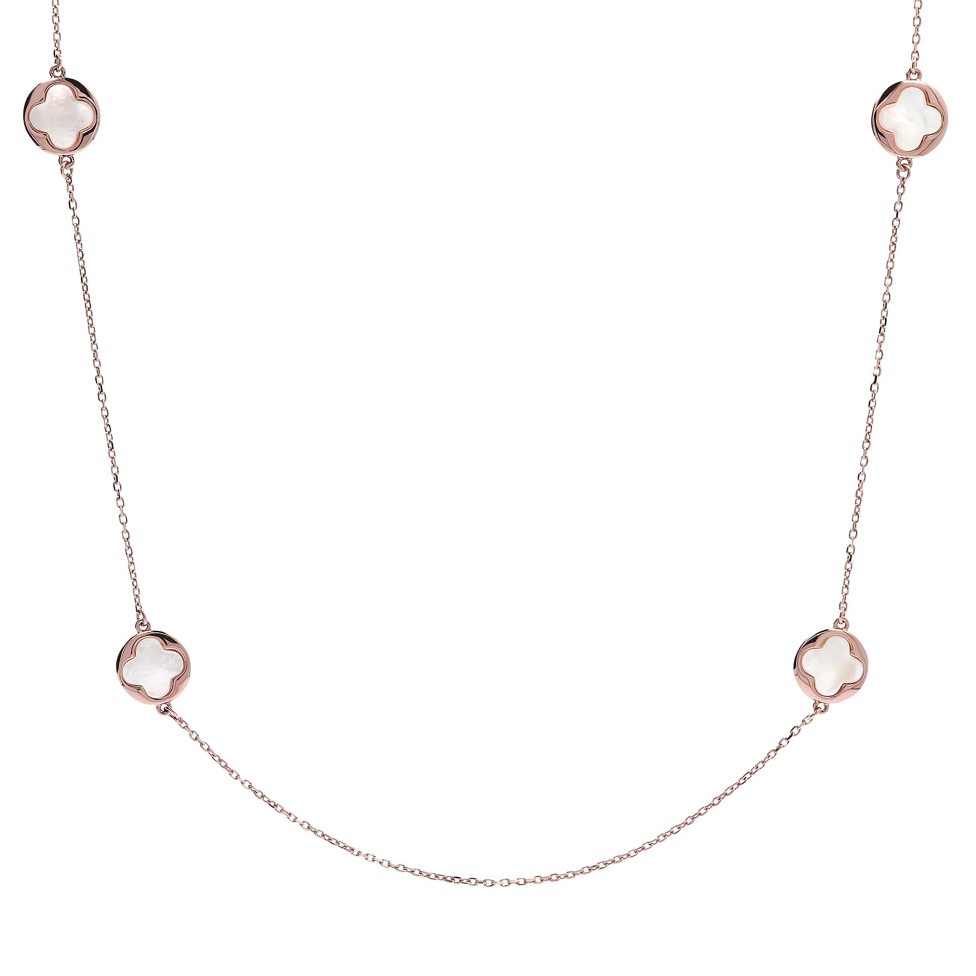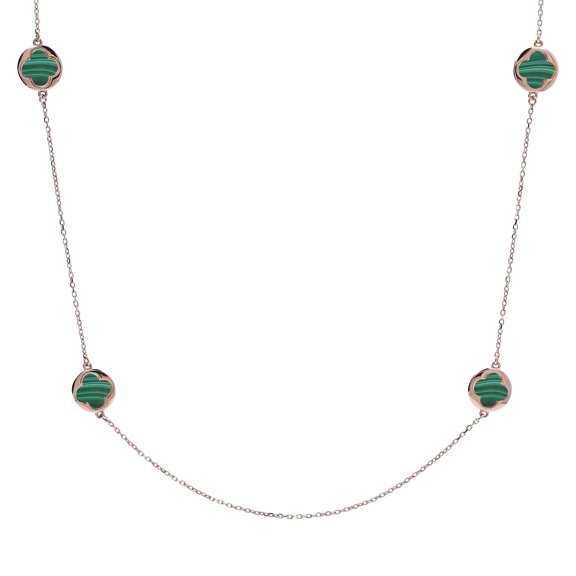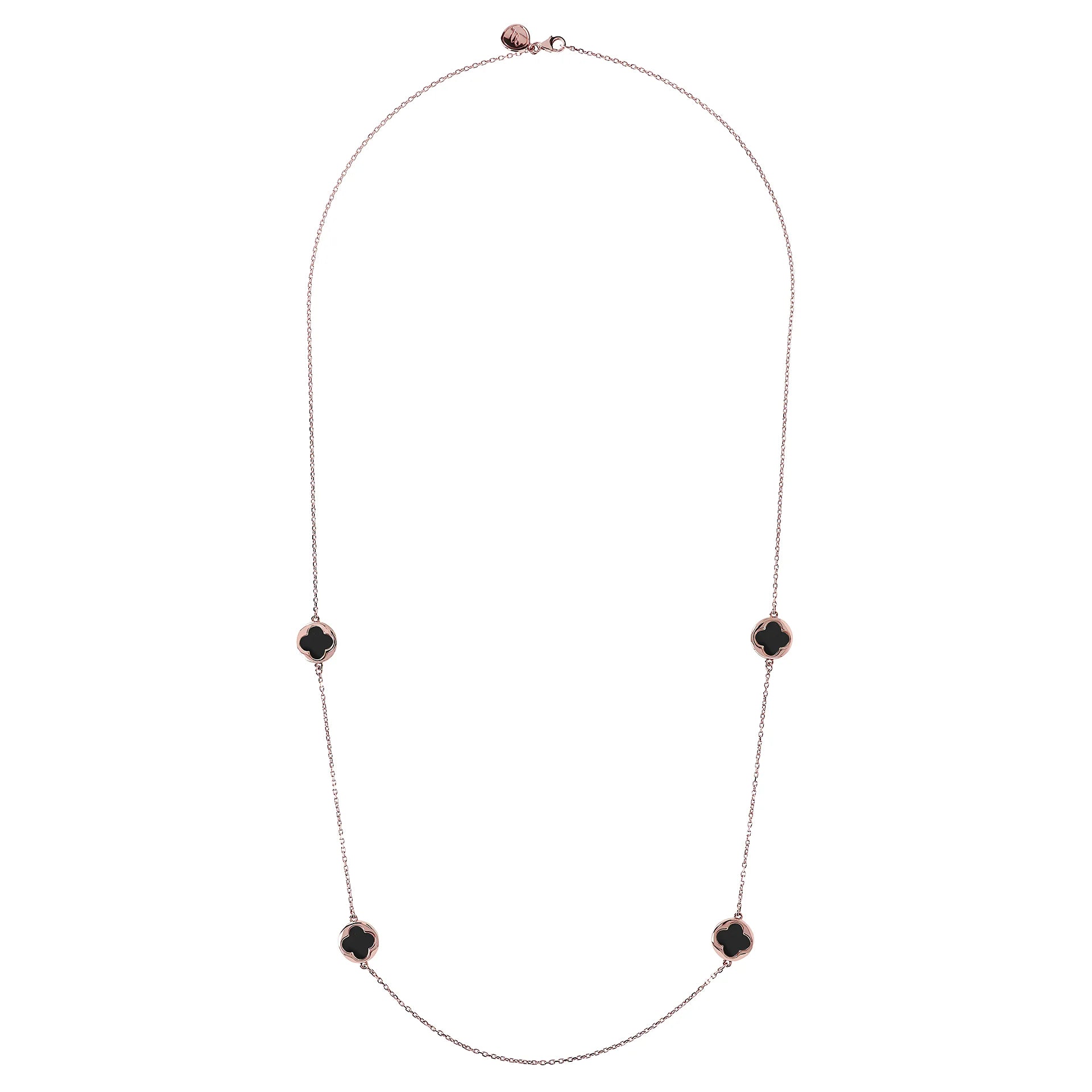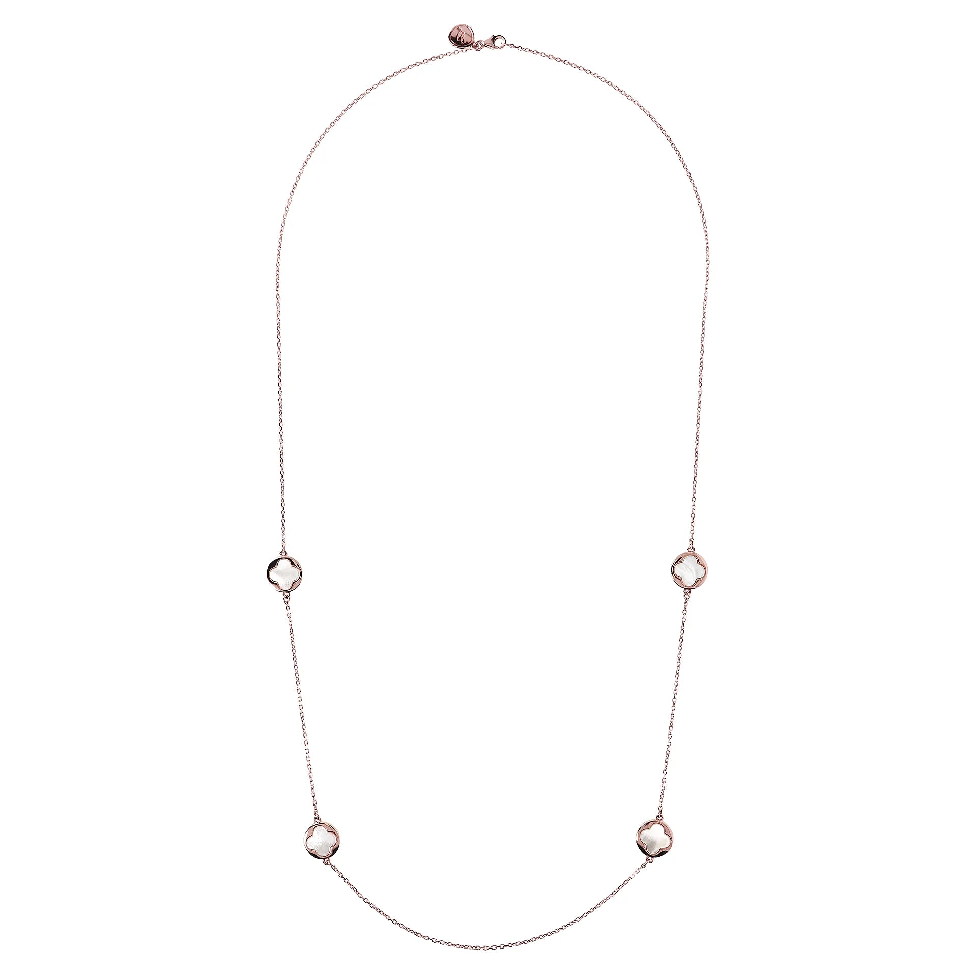 Collana lunga Bronzallure realizzata in lega Golden Rosé, placcata oro rosa 18kt con catena forzatina con quattro station a quadrifoglio piccoli in pietra naturale (12 mm). Chiusura a moschettone.