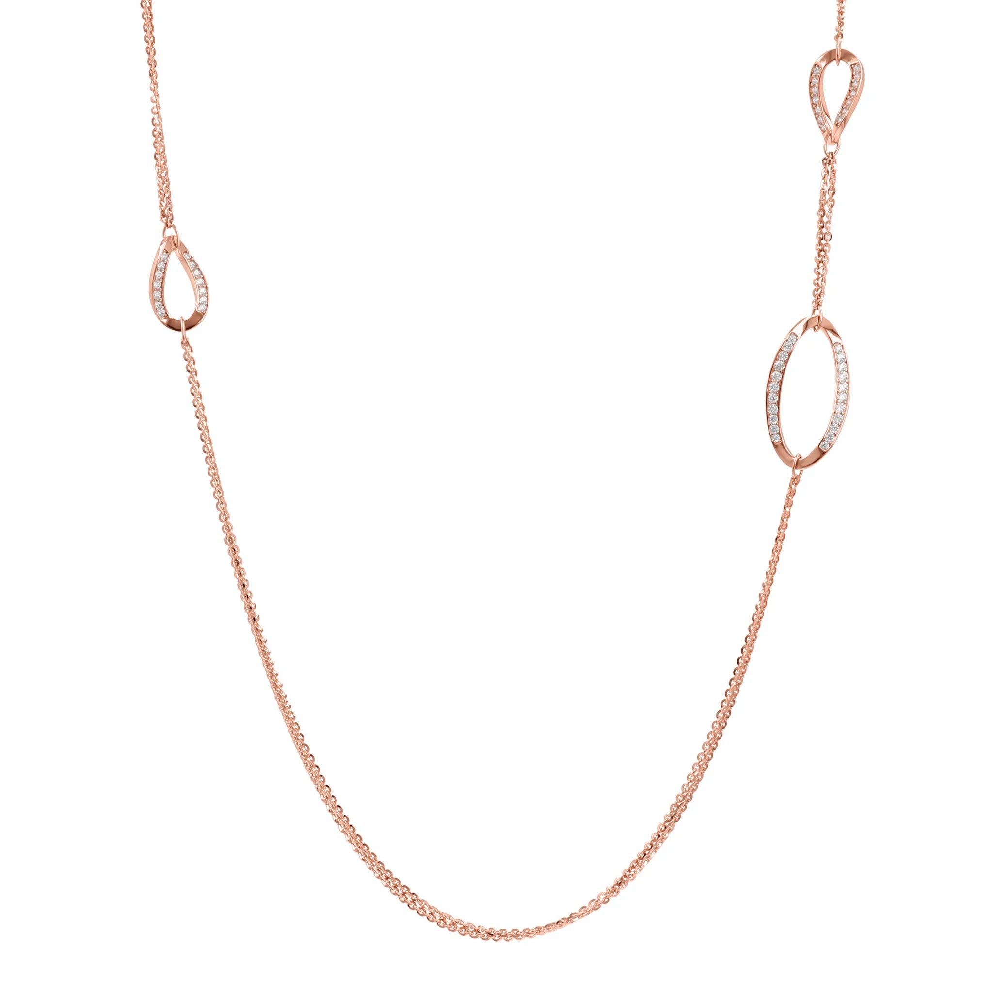 Collana lunga Bronzallure realizzata in lega Golden Rosé, placcata oro rosa 18kt, con doppia catena rolo impreziosita da station con due elementi a goccia e un elemento ovale pavé in cubic zirconia di colore bianco, qualità luminosa; chiusura a moschettone.