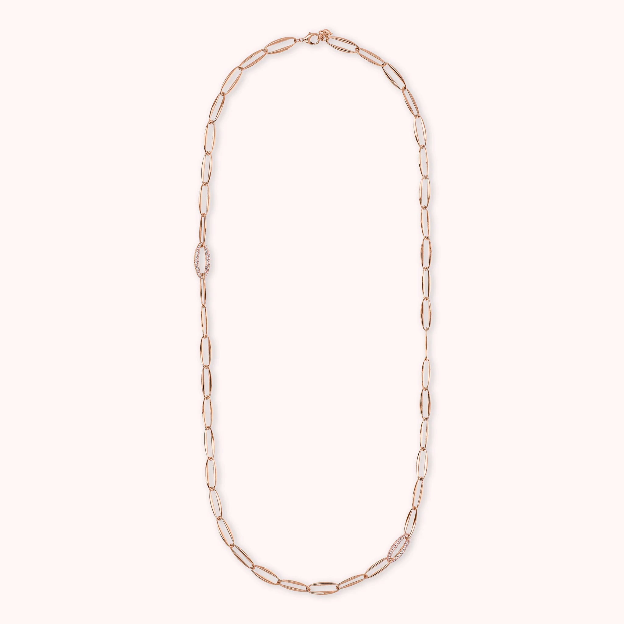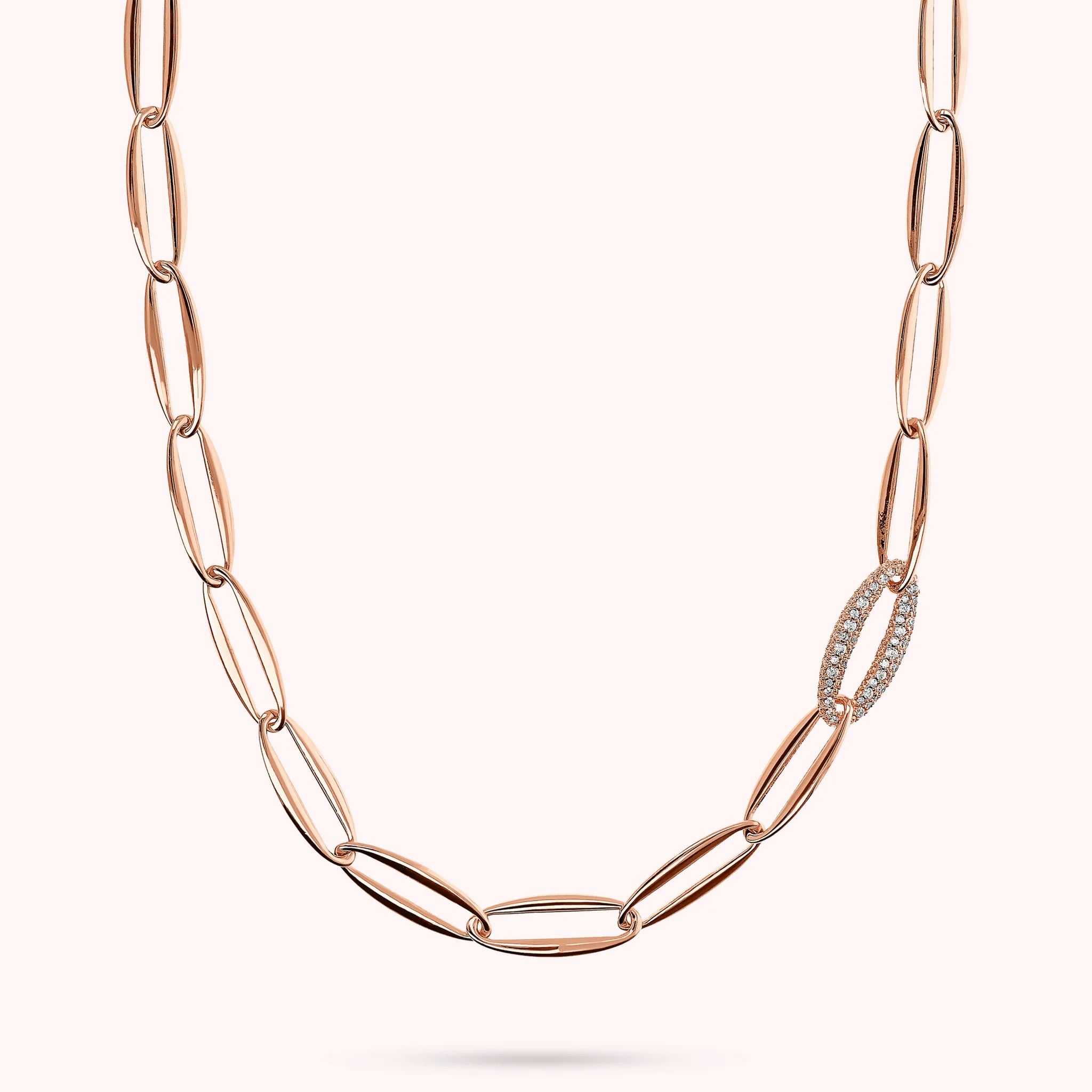 Collana lunga Bronzallure realizzata in lega Golden Rosé, placcata Oro rosa 18kt, con maglie marquise lucide di cui una in pavé di cubic zirconia, qualità luminosa. Lunghezza 91 cm di estensione. Chiusura a moschettone.
