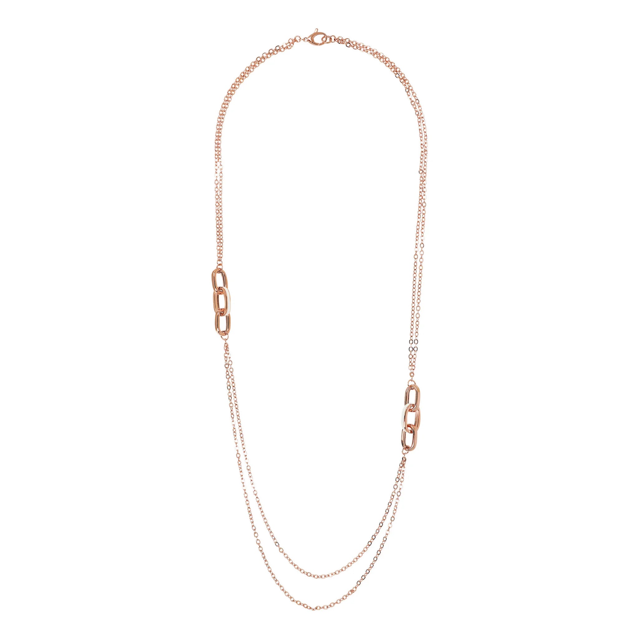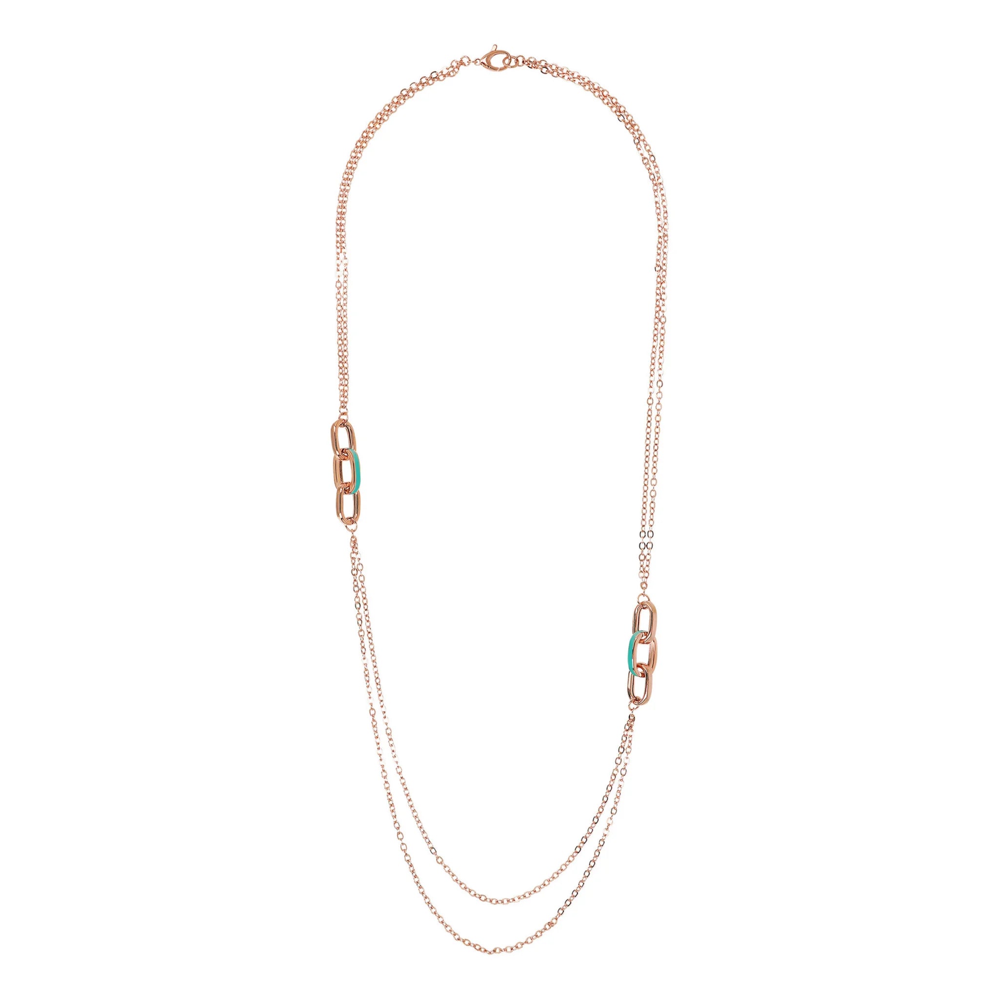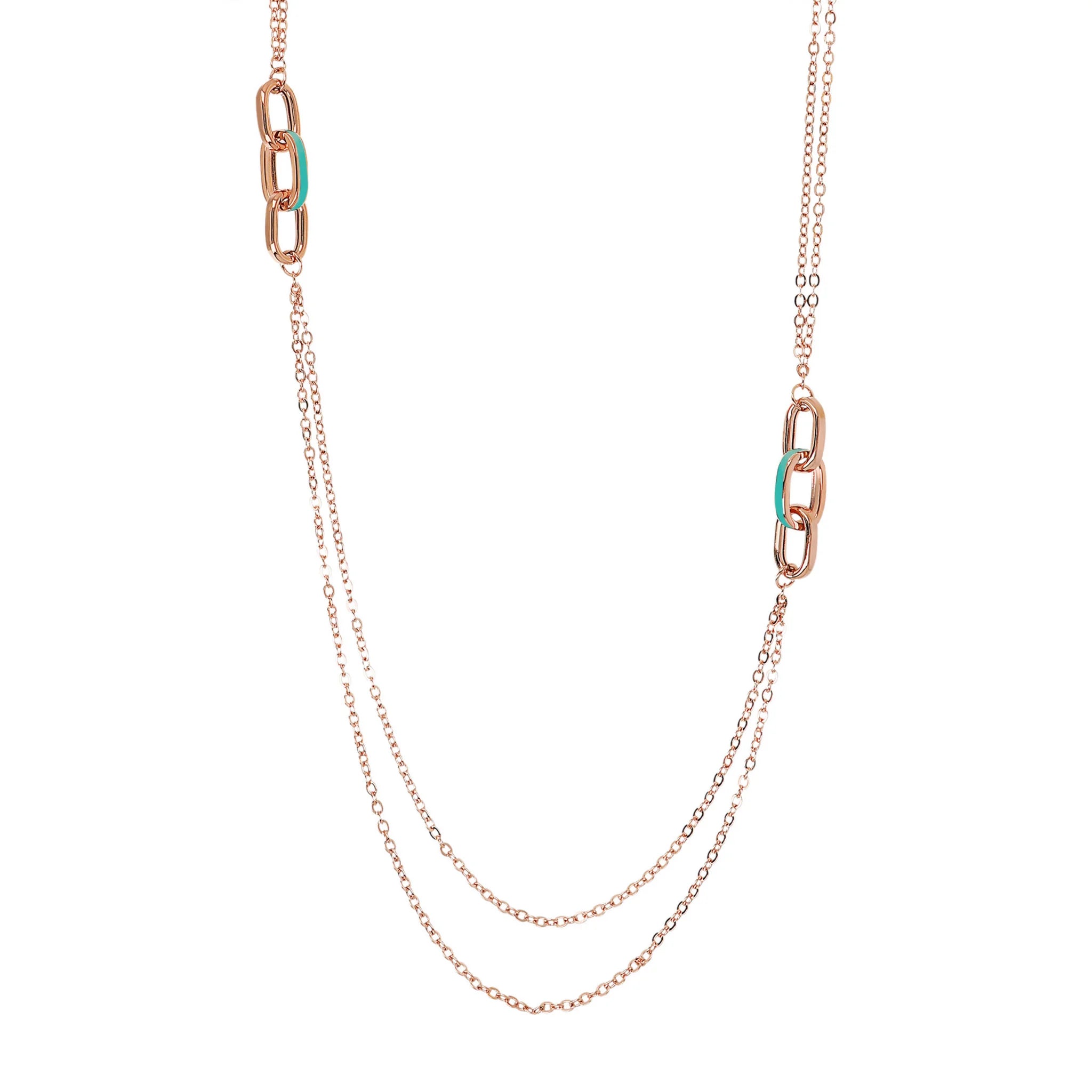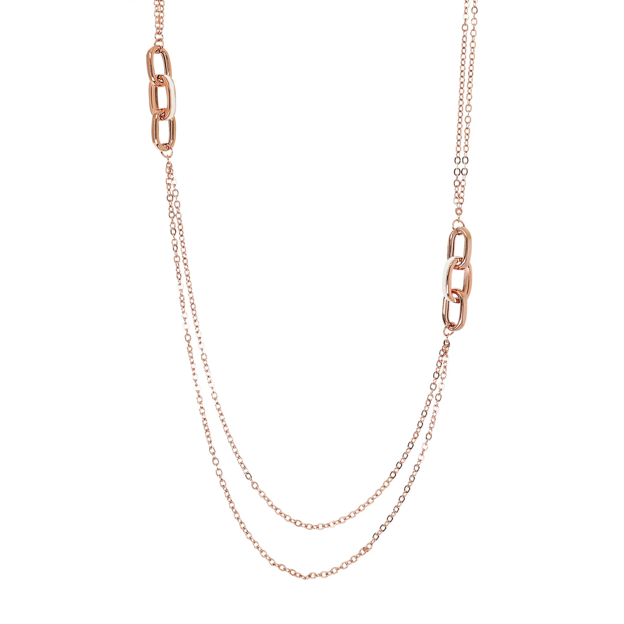 Collana lunga Bronzallure realizzata in lega Golden Rosé, placcata oro rosa 18kt. La collana, con chiusura a moschettone, presenta una doppia catena rolo alternata a due station di tre maglie ovali allungate di cui una smaltata.
