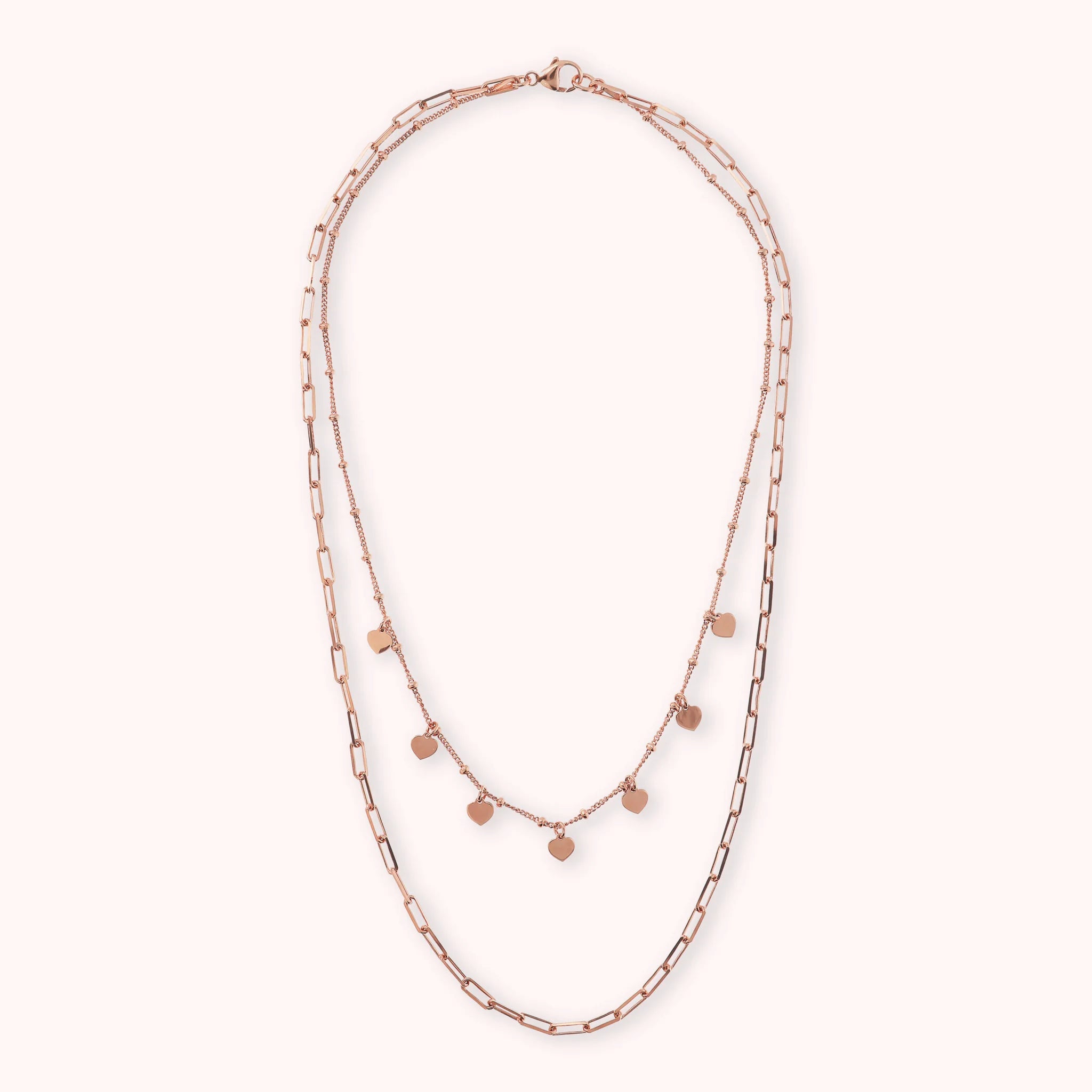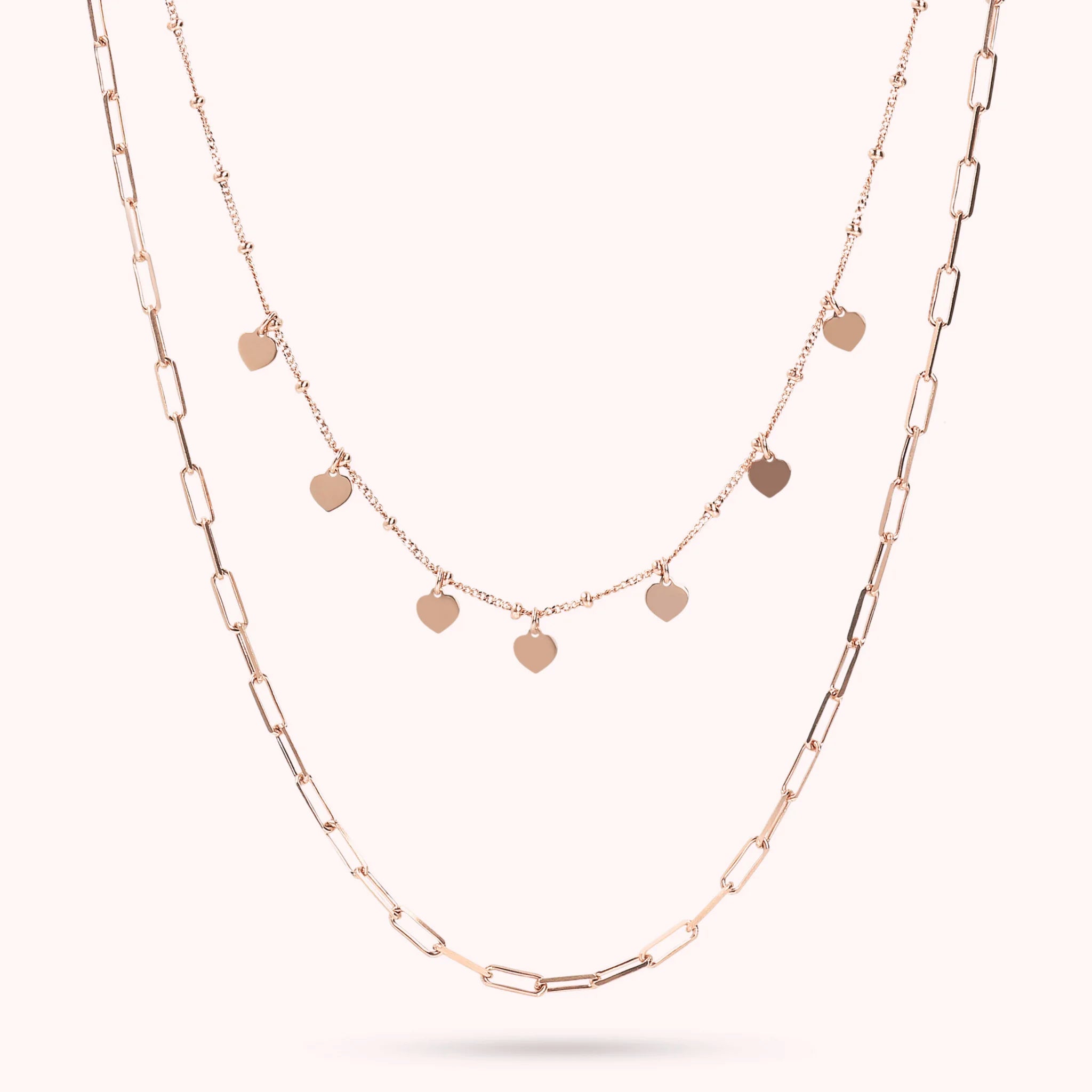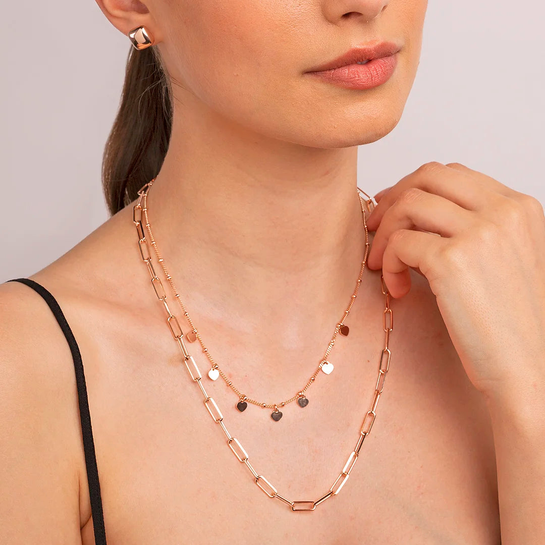 Collana multi-filo Bronzallure realizzata in lega Golden Rosé, placcata oro rosa 18kt, con due fili di catena. La prima collana è una catena con palline e charms a forma di cuore. La seconda collana è una catena forzatina allungata, con chiusura a moschettone. Creazione di stile, perfetta per essere indossata in qualsiasi occasione.