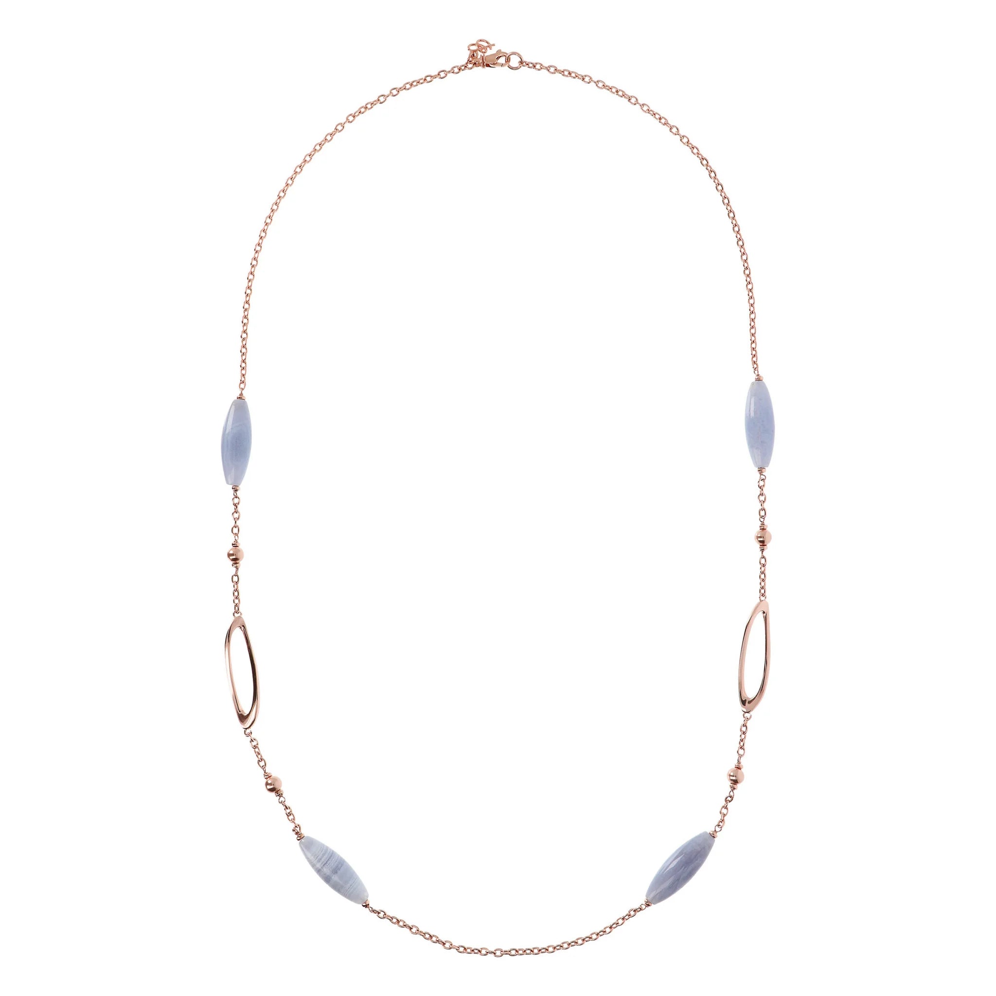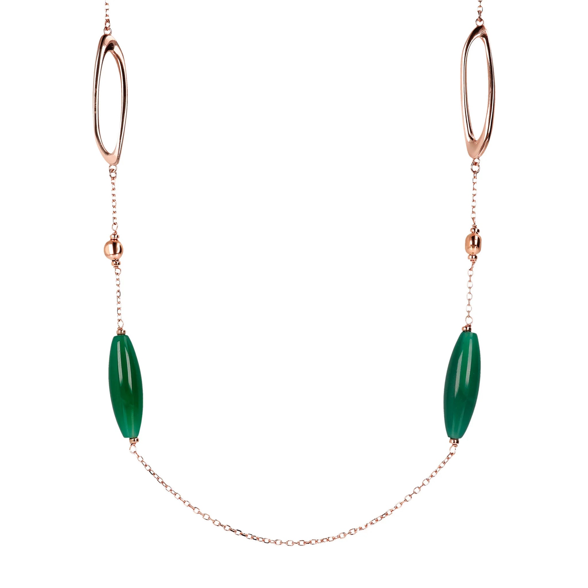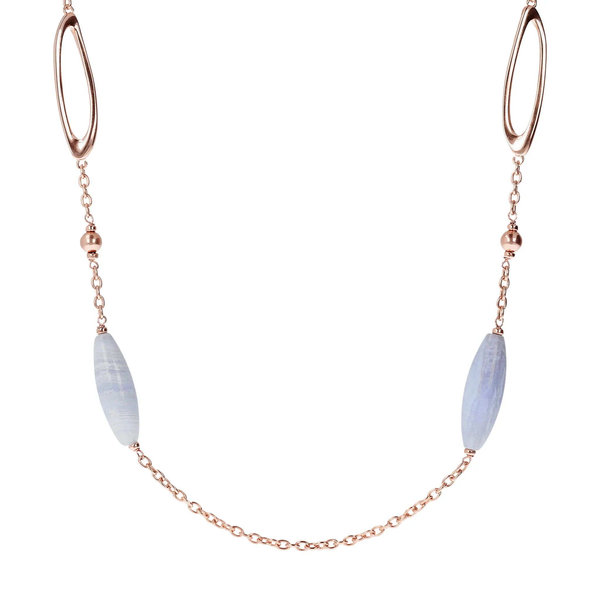 Collana Bronzallure realizzata in lega Golden Rosé, placcata oro rosa 18kt con catena rolo impreziosita da dettagli ovali e sferici in Golden Rosé e pietre naturali acquamarina celeste o agata verde; chiusura a moschettone.
