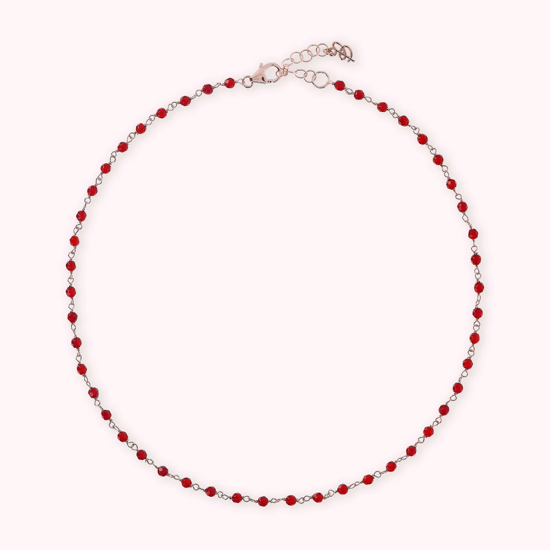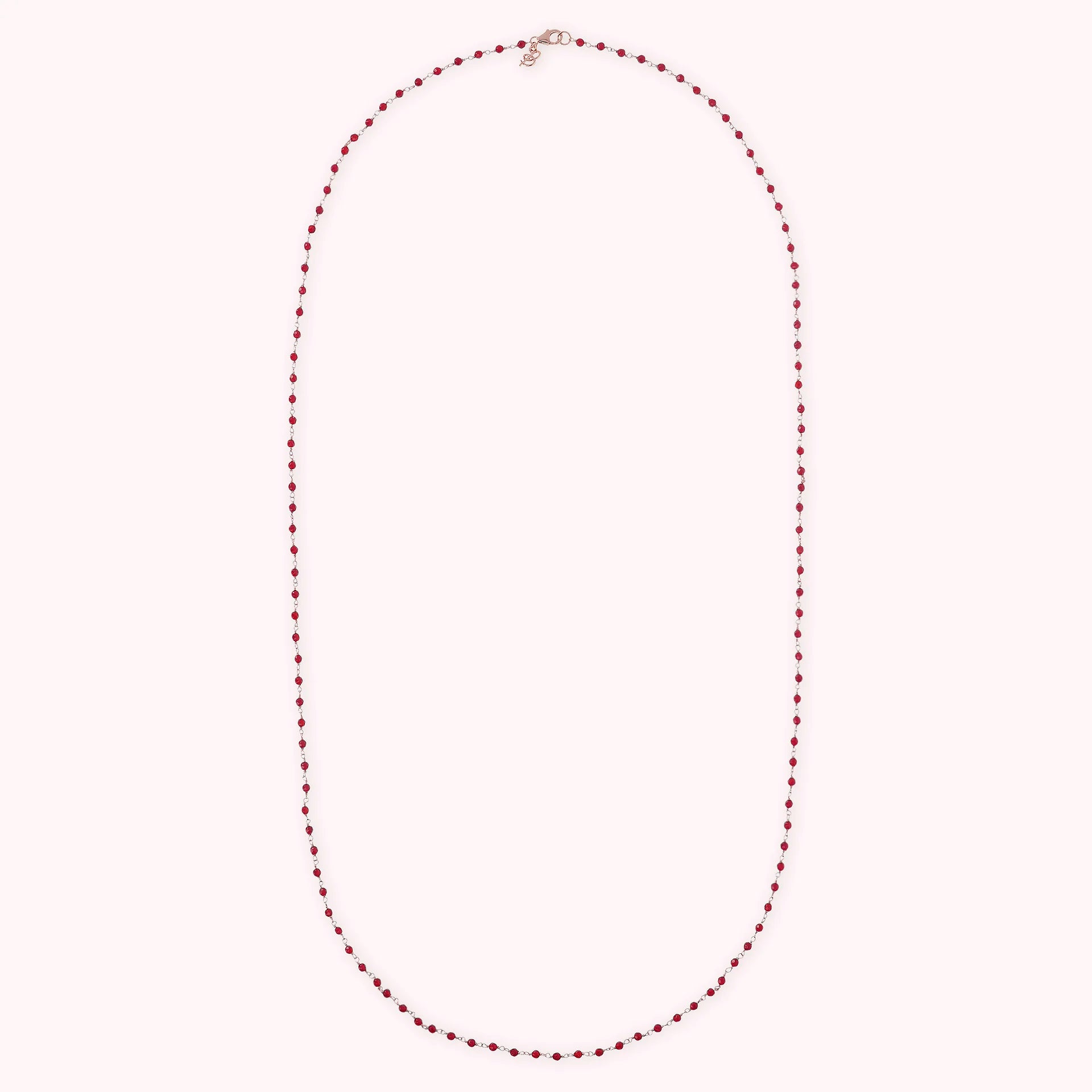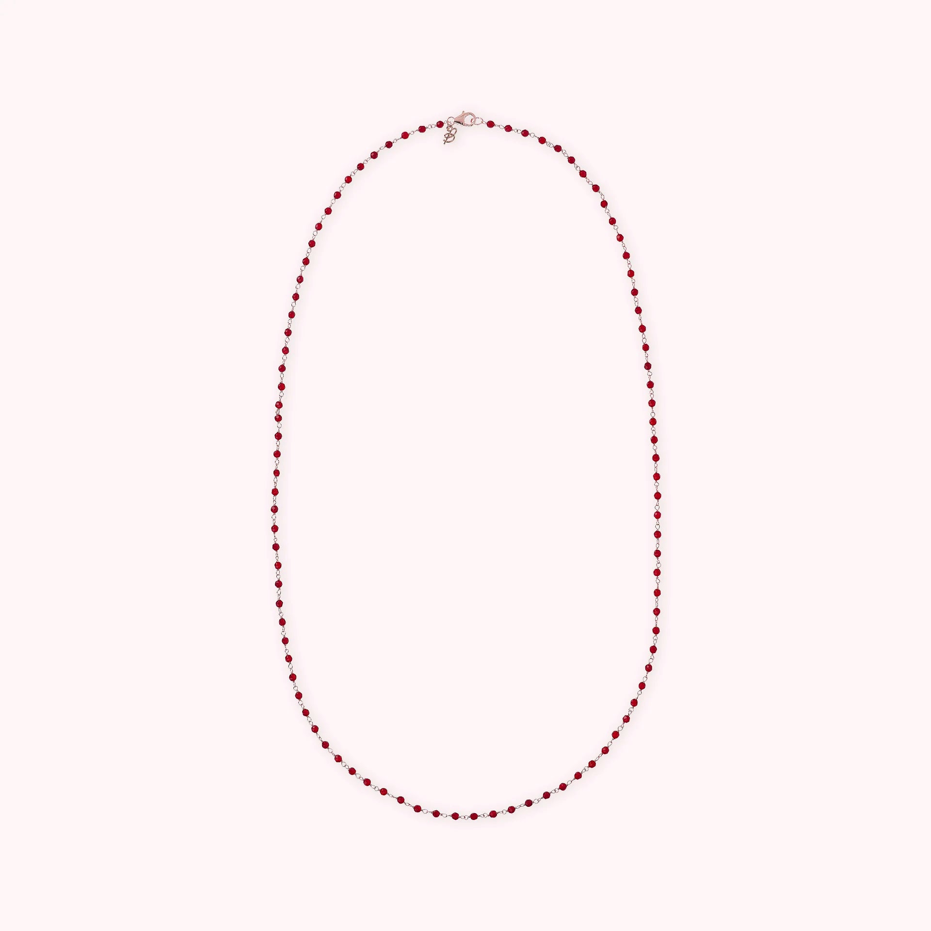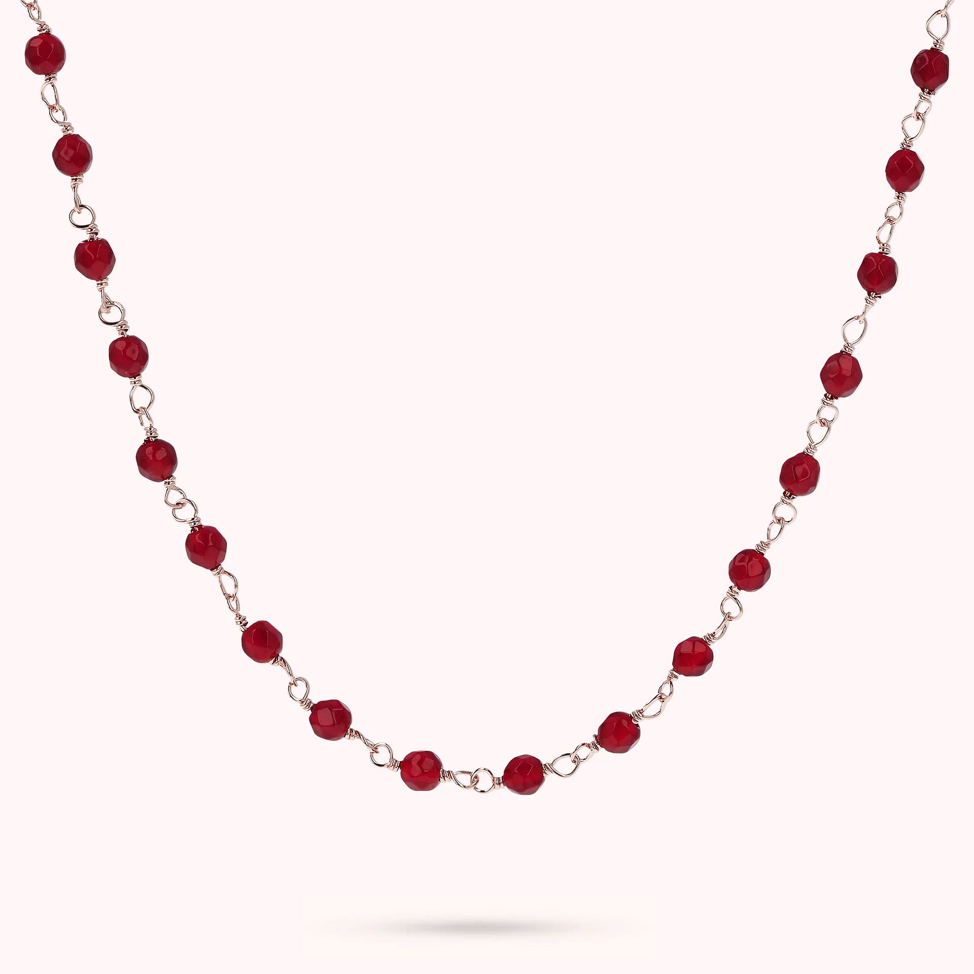 Collana rosario Bronzallure realizzata in lega Golden Rosé, placcata oro rosa 18kt, impreziosita da piccole pietre naturali agata rossa (3.5 mm); chiusura a moschettone. Disponibile in tre misure: short (38 cm), medium (75 cm) e long (100 cm).