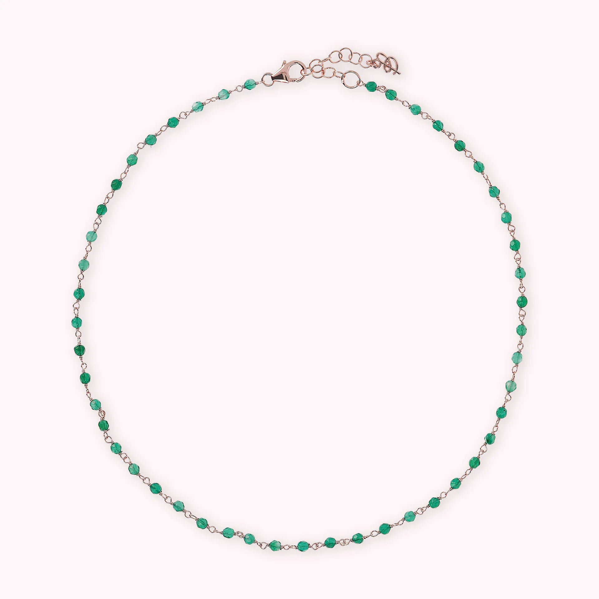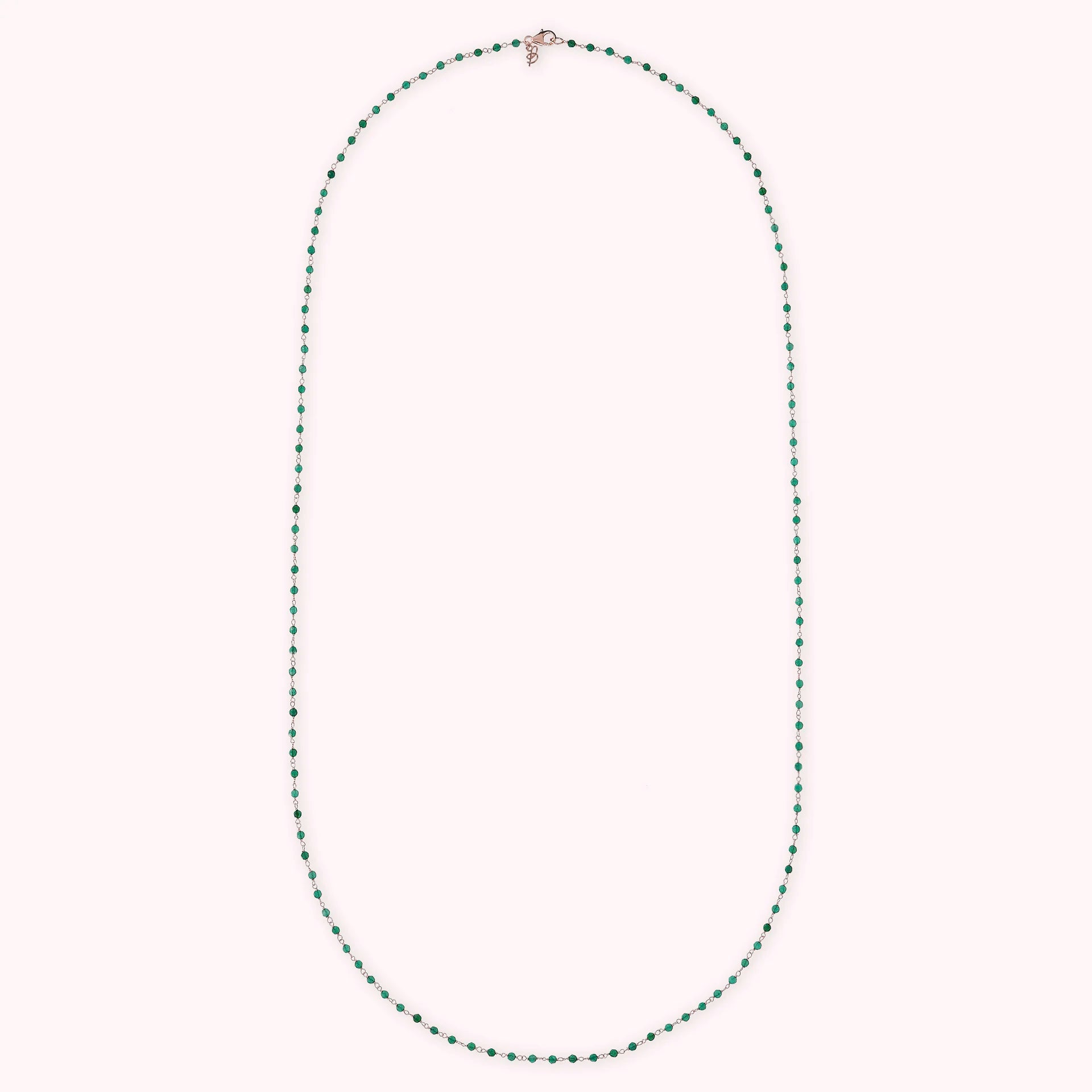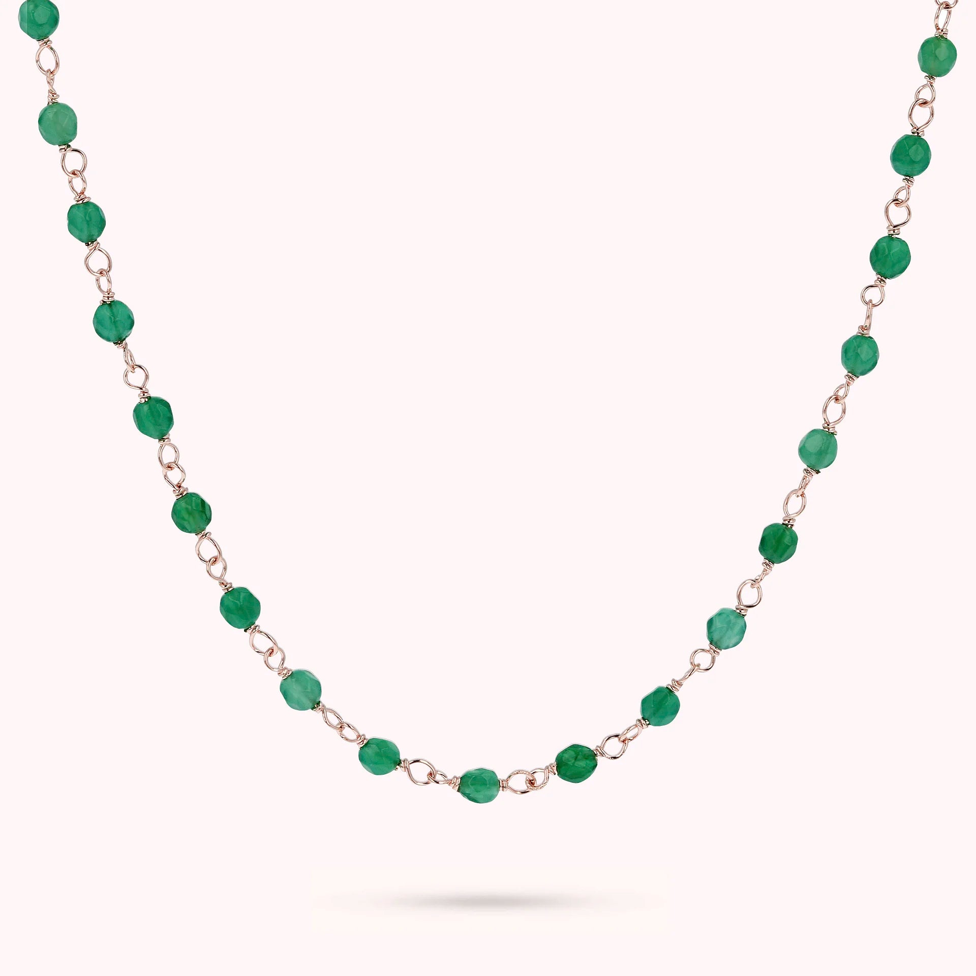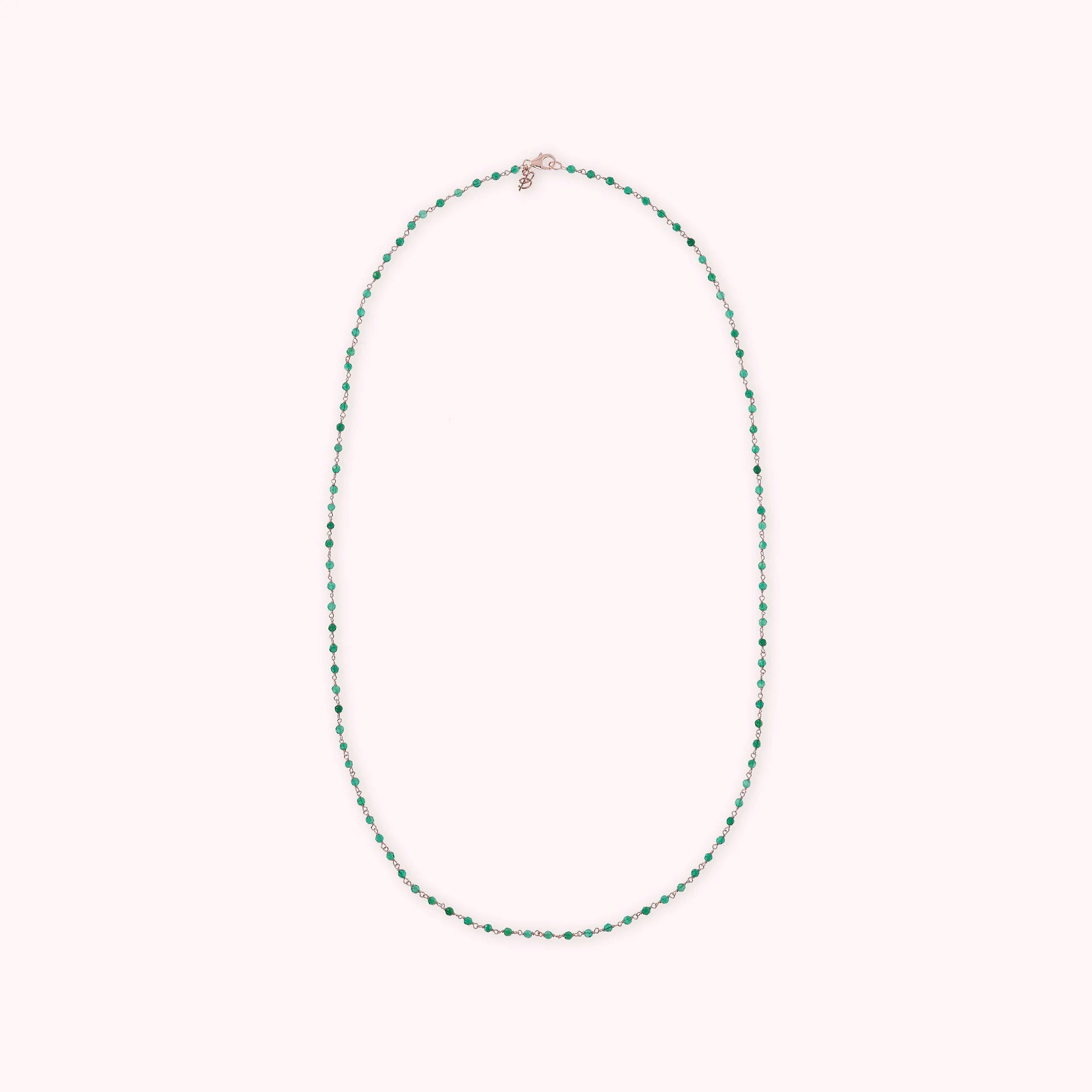 Collana rosario Bronzallure realizzata in lega Golden Rosé, placcata oro rosa 18kt, impreziosita da piccole pietre naturali agata verde (3.5 mm); chiusura a moschettone. Disponibile in tre misure: short (38 cm), medium (75 cm) e long (100 cm).