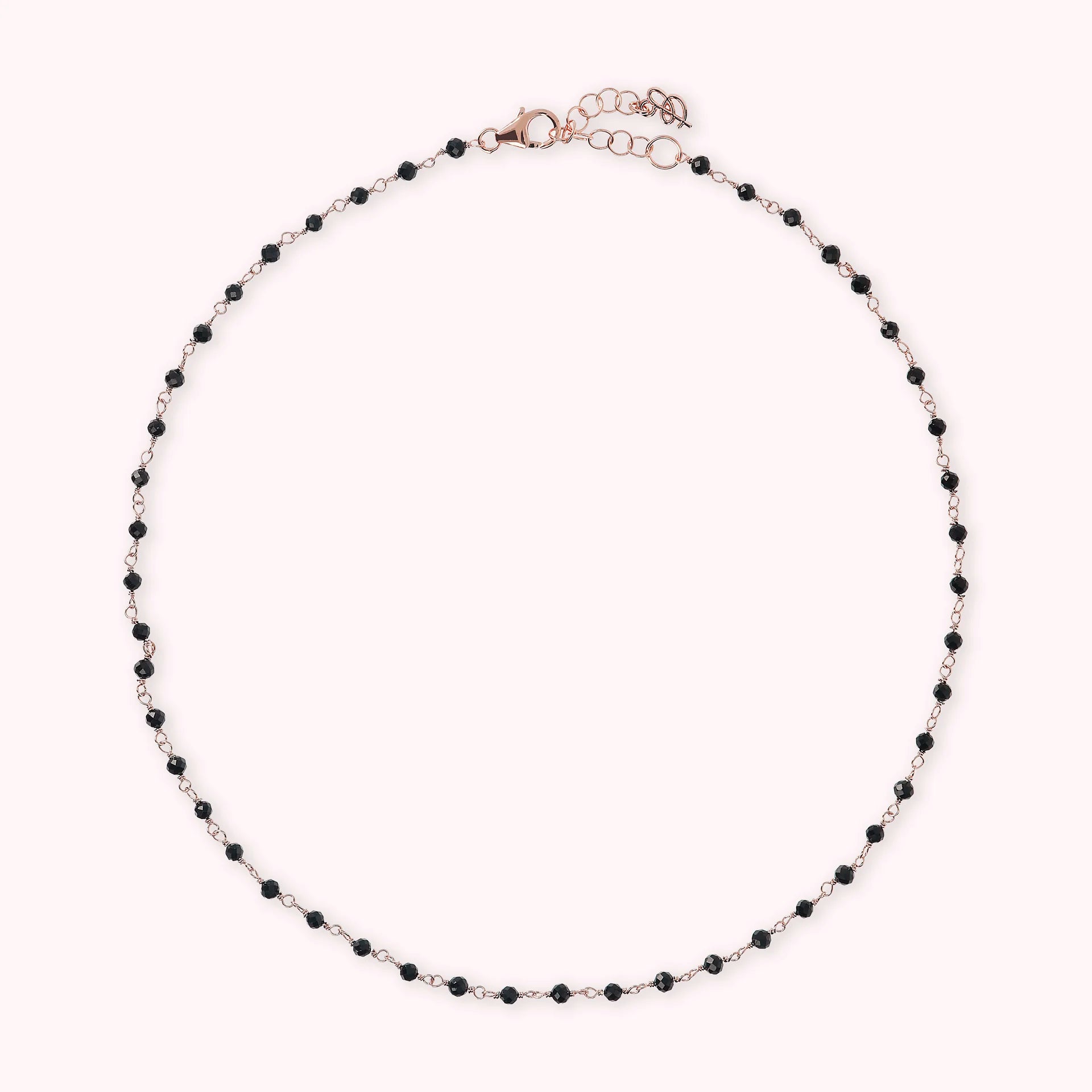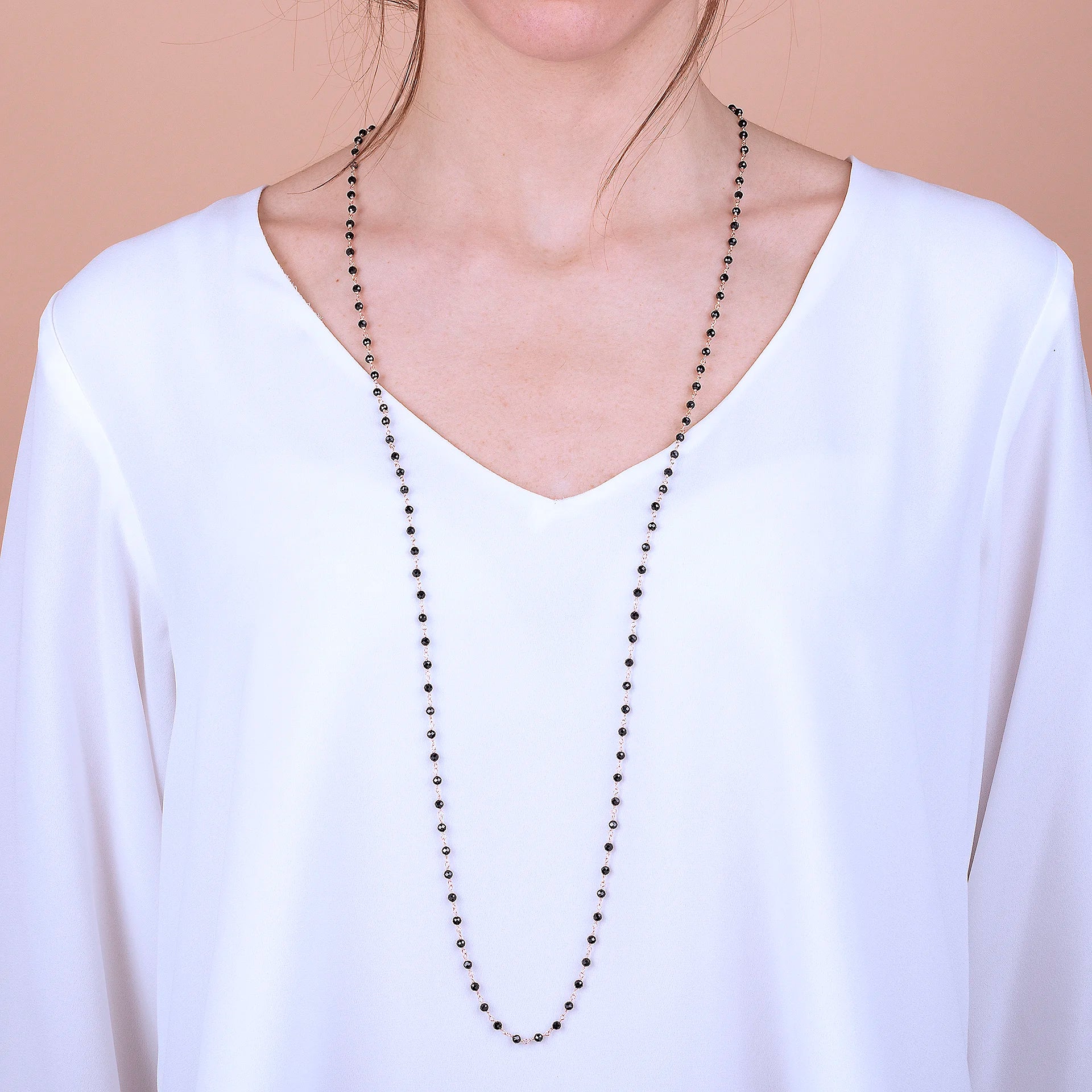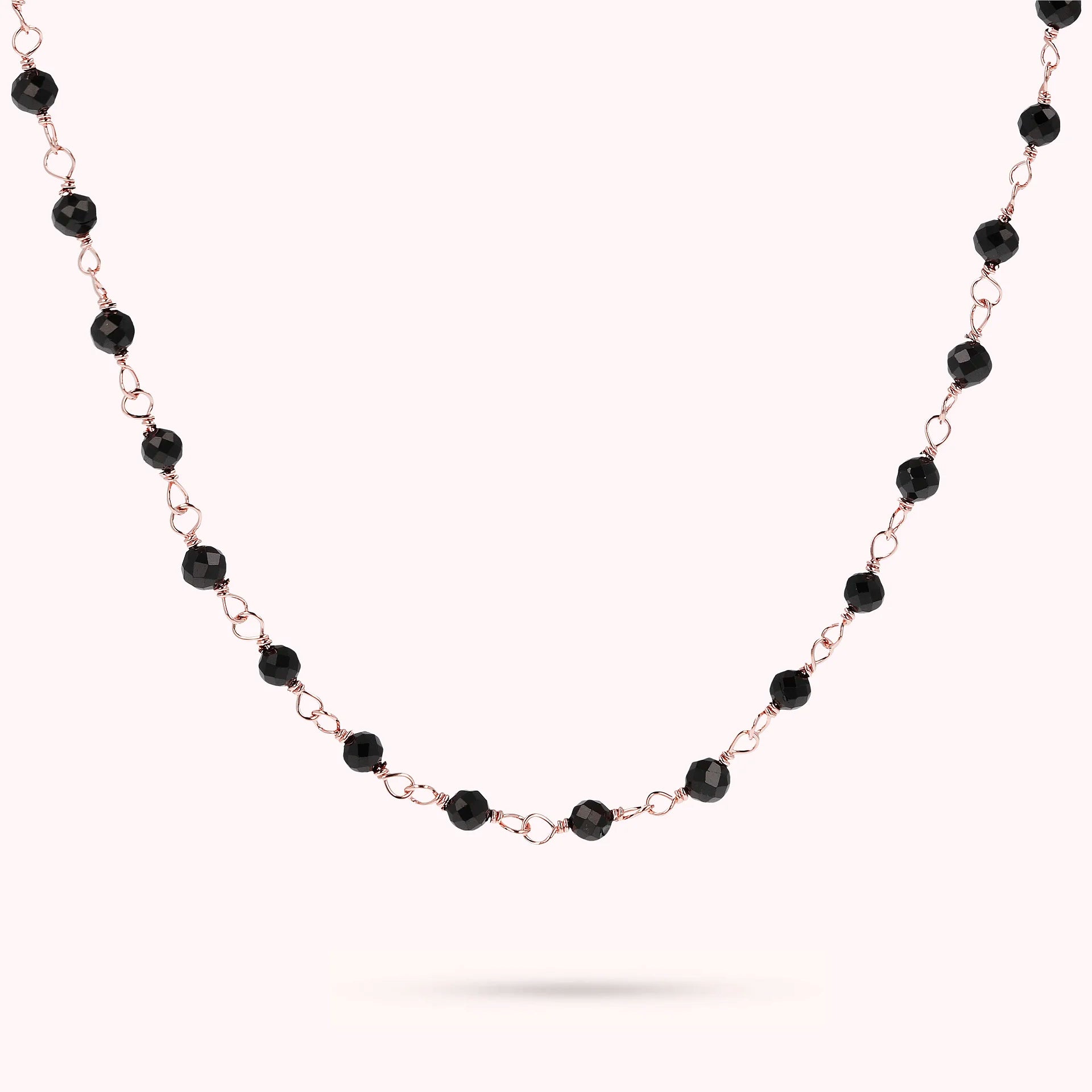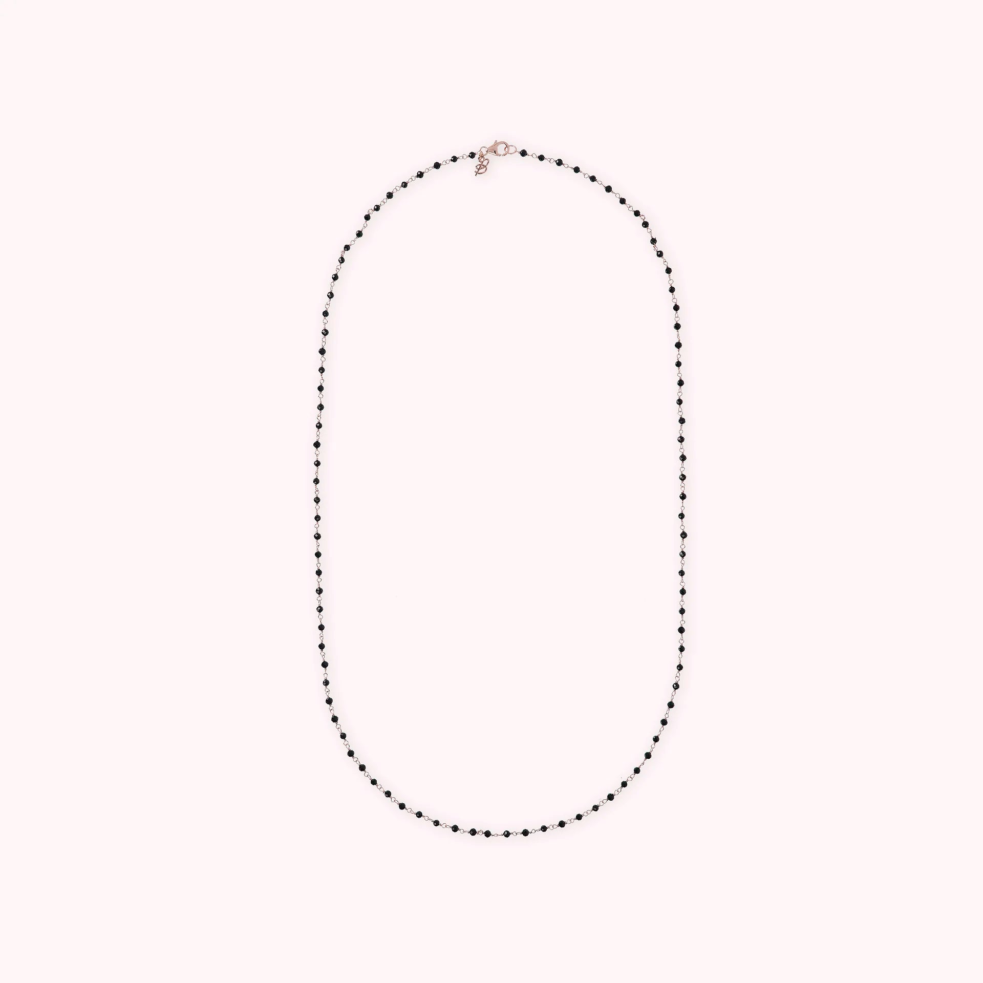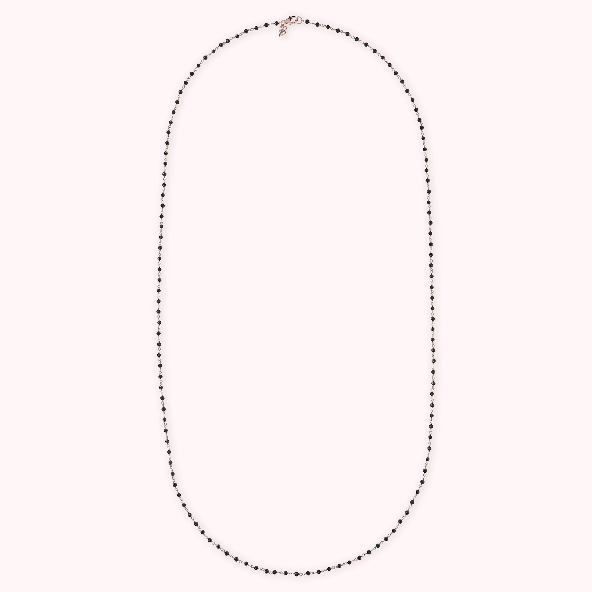 Collana rosario Bronzallure realizzata in lega Golden Rosé, placcata oro rosa 18kt, impreziosita da piccole pietre naturali spinello nero (3.5 mm); chiusura a moschettone. Disponibile in tre misure: short (38 cm), medium (75 cm) e long (100 cm).