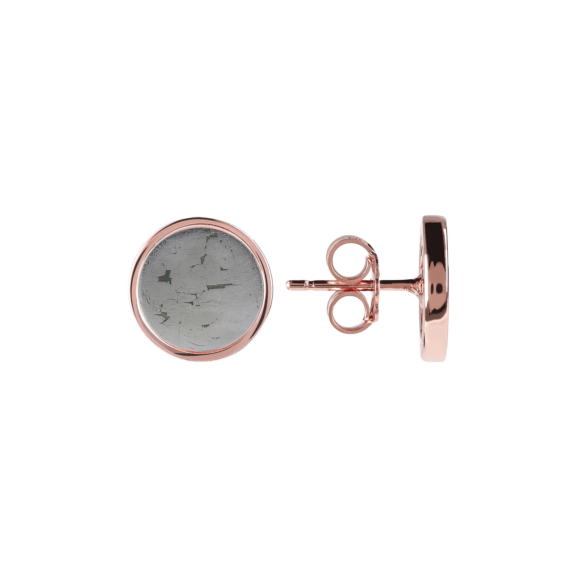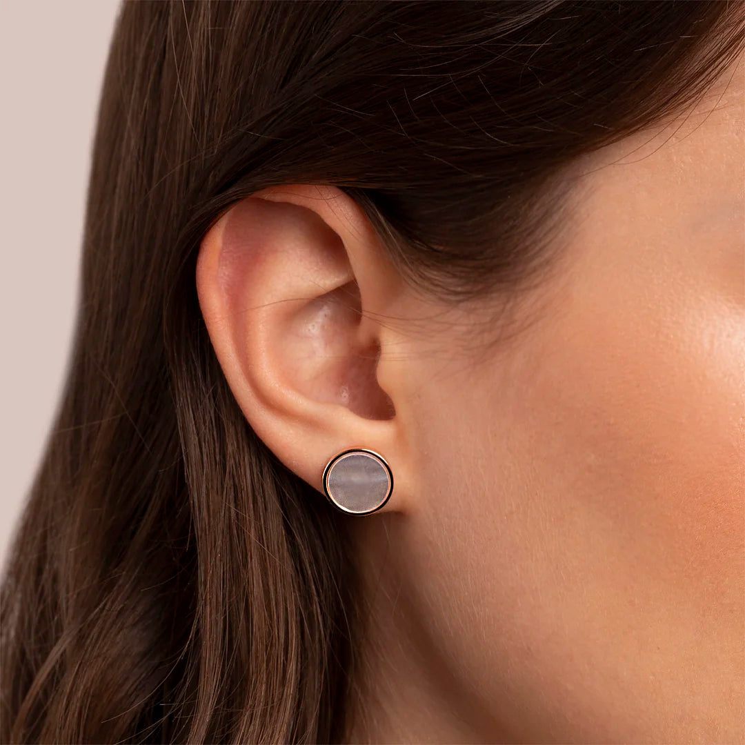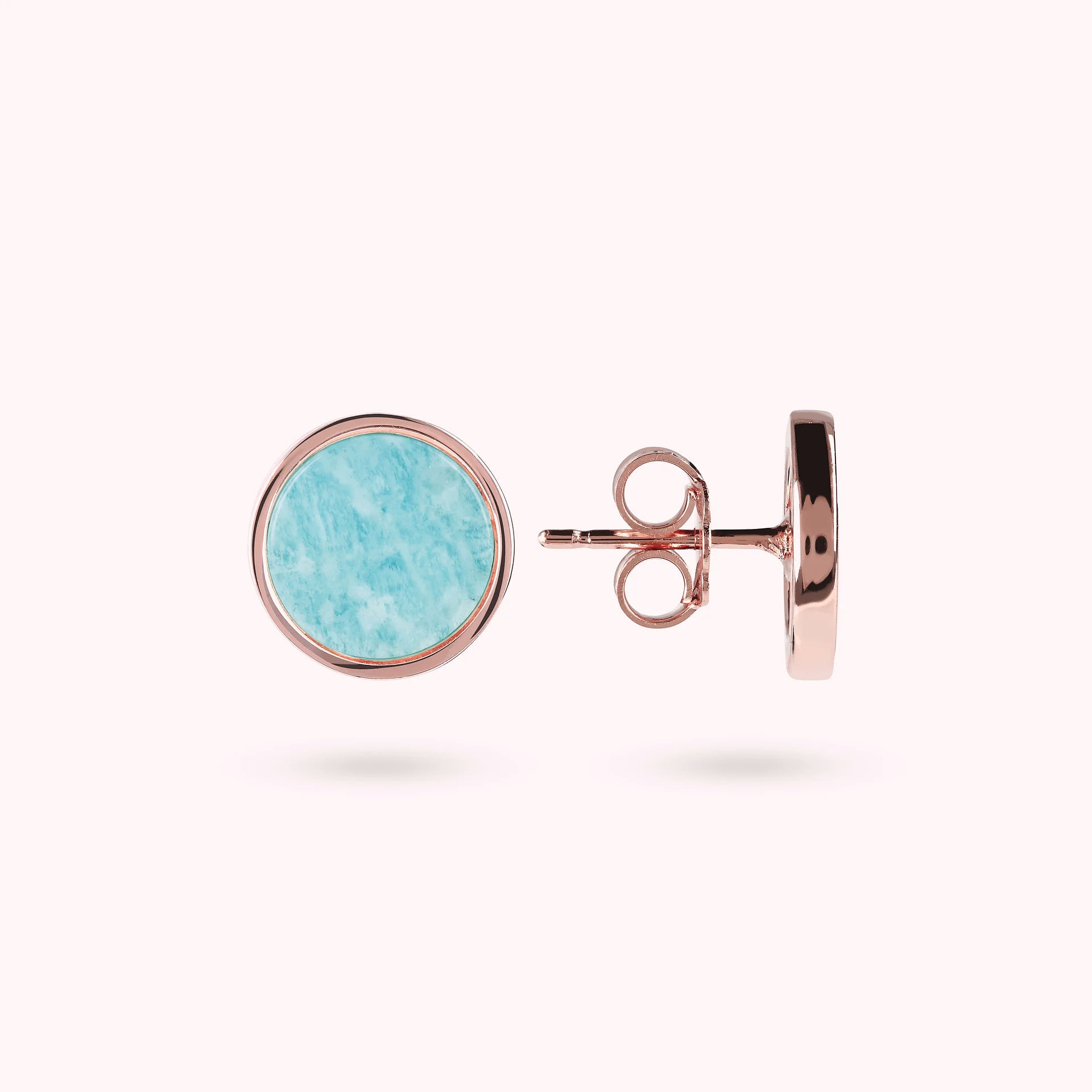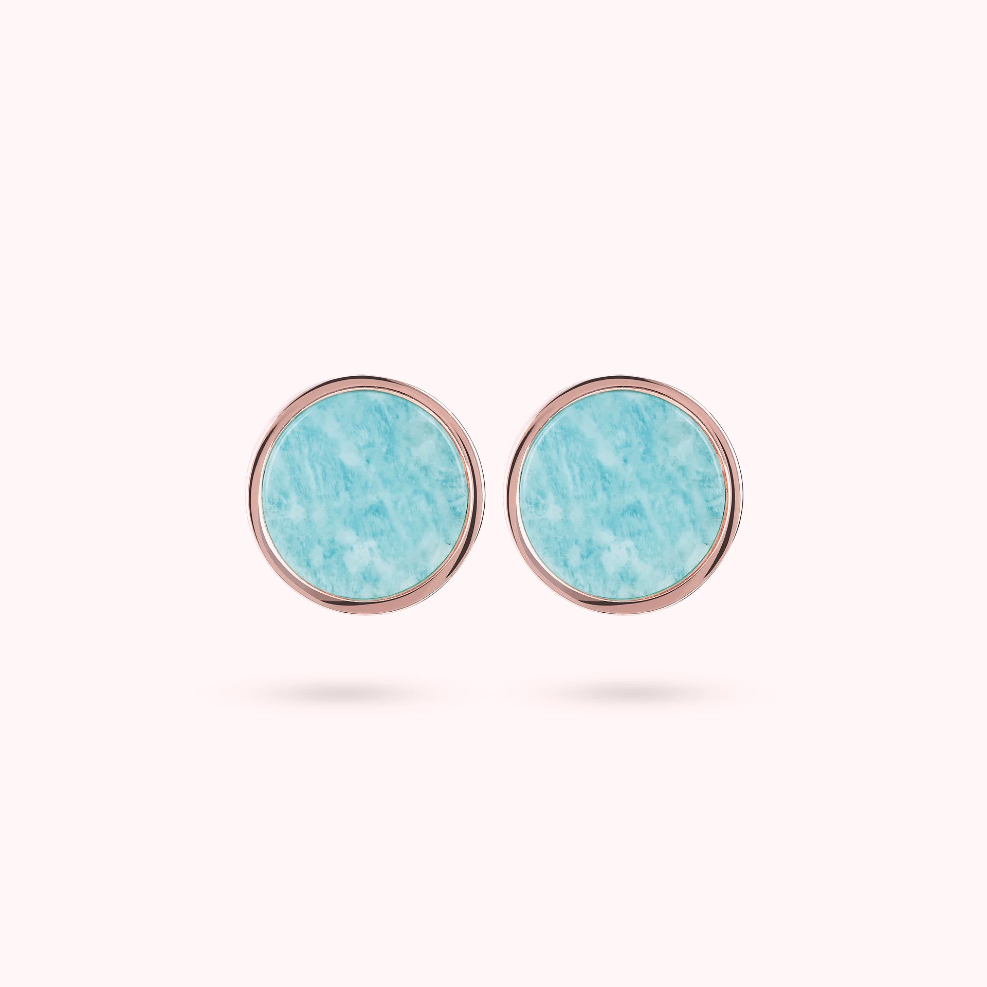Orecchini a bottone Bronzallure realizzati in lega Golden Rosé, placcati oro rosa 18kt, con disco piccolo (1 cm) in pietra naturale montato su base placcata oro rosa 18kt; chiusura a perno e farfalla.