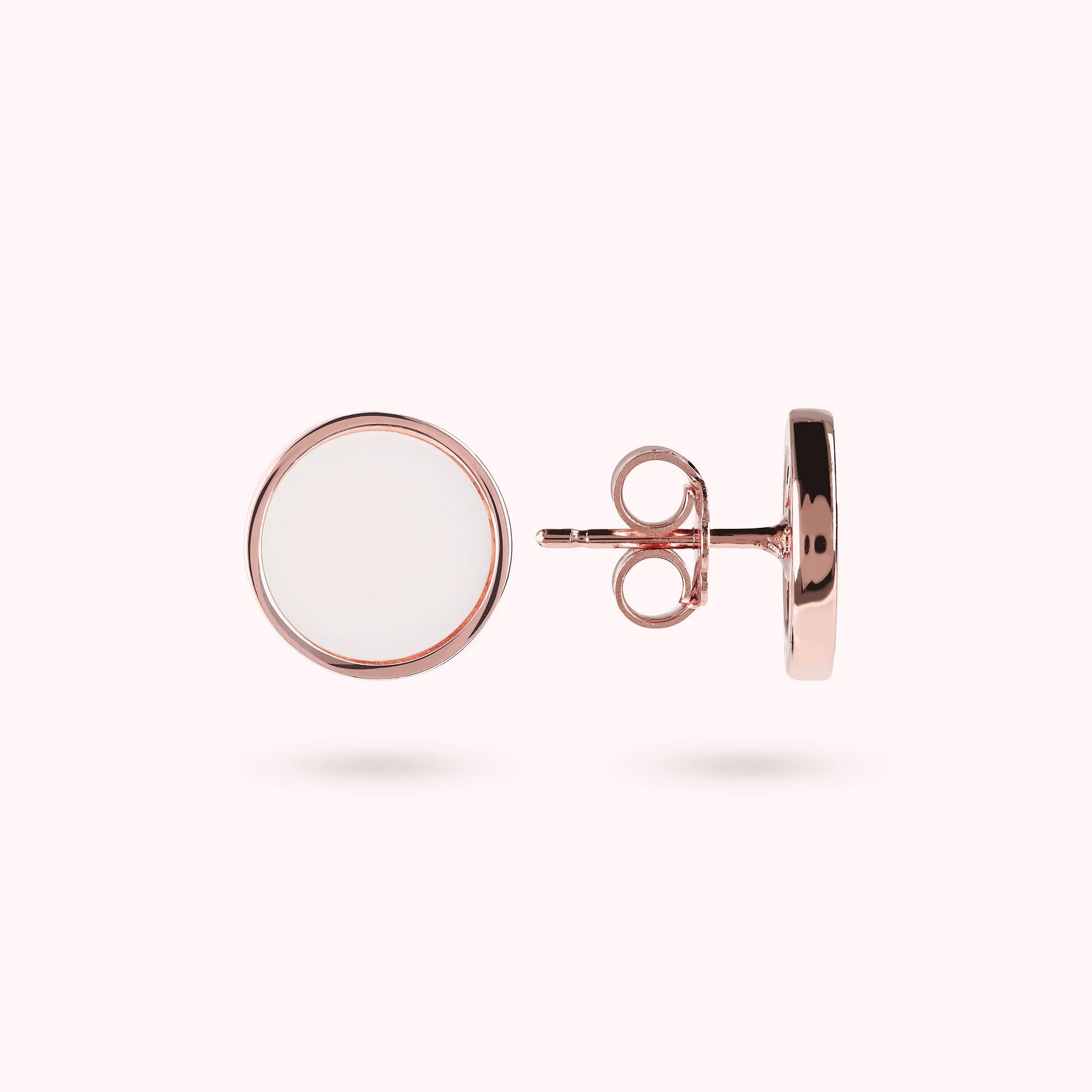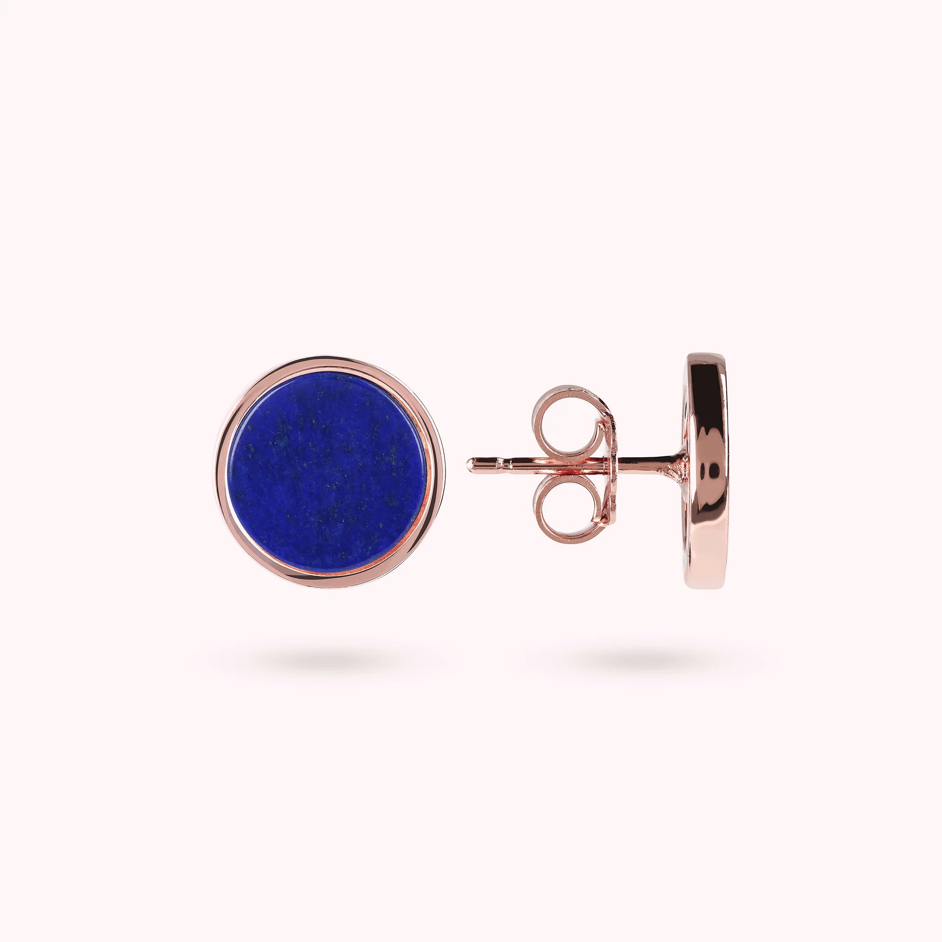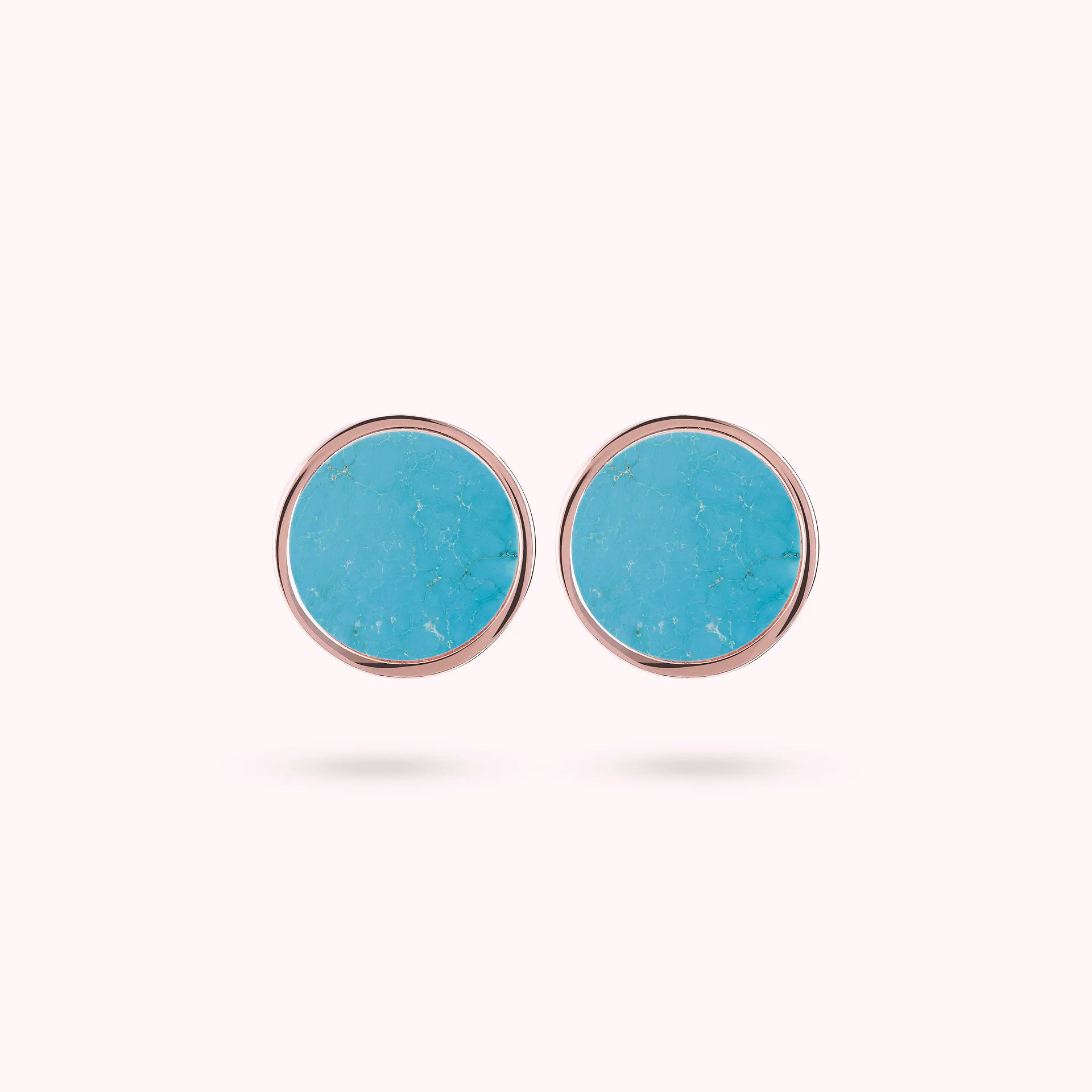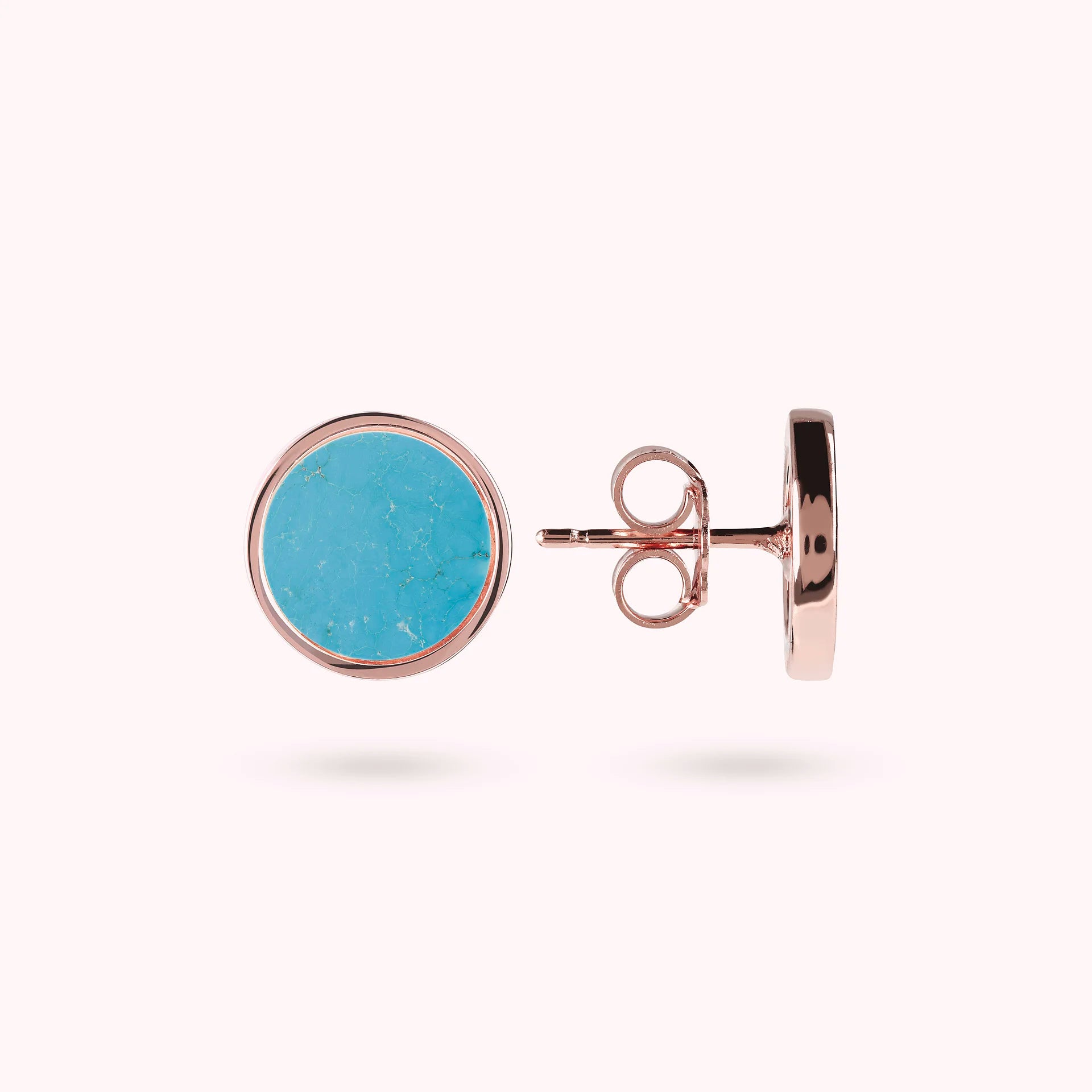 Orecchini a bottone Bronzallure realizzati in lega Golden Rosé, placcati oro rosa 18kt, con disco piccolo (1 cm) in pietra naturale montato su base placcata oro rosa 18kt; chiusura a perno e farfalla.